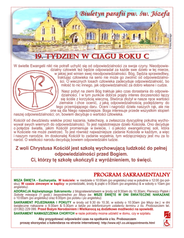© Harry McGregor Biuletyn parafii pw. św. Józefa 19. TYDZIEN w ciagu roku C W świetle Ewangelii nikt nie potrafi uchylić się od odpowiedzialności za swoje czyny. Nieodpowiedzialny człowiek też będzie odpowiadał za każde swe dzieło w tej mierze, w jakiej jest winien swej nieodpowiedzialności. Bóg, Sędzia sprawiedliwy, traktując człowieka na serio nie może go zwolnić od odpowiedzialności. O wiecznych losach człowieka zadecyduje odpowiedzialność, bo miłość to nic innego, jak odpowiedzialność za dobro własne i cudze. Nasz pobyt na ziemi Bóg traktuje jako czas dorastania do odpowiedzialności. I w tym punkcie dobrze pojęty interes doczesności łączy się ściśle z korzyścią wieczną. Stwórca złożył w nasze ręce wartości ziemskie i chce ocenić, z jaką odpowiedzialnością podejdziemy do tego przemijającego daru. Oceni i nagrodzi dzieła naszych rąk, ale nie one są dla Niego najważniejsze. Boga interesuje przede wszystkim stopień naszej odpowiedzialności; on, bowiem decyduje o wartości człowieka. Kościół od dwudziestu wieków przez kazania, katechezę, a zwłaszcza dyscyplinę pokutną wychowywał swych wiernych do odpowiedzialności. To jest najistotniejsze dzieło Kościoła. Ono decyduje o potędze światła, jakim Kościół promieniuje w świecie, i o jakości ewangelicznej soli, która w Kościele nie może zwietrzeć. To jest również najważniejsze zadanie Kościoła w każdym, a więc i naszym narodzie. Im doskonalej Kościół to zadanie wypełnia, tym wdzięczniejszy jest mu za to naród. O wielkości narodu decydują bowiem odpowiedzialni ludzie. Z woli Chrystusa Kościół jest szkołą wychowującą ludzkość do pełnej odpowiedzialności przed Bogiem. Ci, którzy tę szkołę ukończyli z wyróżnieniem, to święci. PROGRAM SAKRAMENTALNY MSZA ŚWIĘTA - Eucharystia. W kościele: w niedziele o 10:00am (po angielsku) oraz w południe o 12:00 (po polsku); W czasie zimowym w kaplicy: w poniedziałki, środy & piątki o 9:00am (po angielsku) & w soboty o 10am (po angielsku). ADORACJA Najświętszego Sakramentu z błogosławieństwem w środy od 9:30am do 10.30am; Pierwszy Piątek i Sobotę miesiąca (1 godz.) bezpośrednio po Mszy św. MSZE ŚWIĘTE W DNI ŚWIATECZNE NAKAZANE o 10:00am (po angielsku) oraz 6:00pm (po polsku i po angielsku). SAKRAMENT POJEDNANIA I POKUTY w środy od 9.30 do 10.30, w soboty o 10:30am (po Mszy św.); w dni świąteczne nakazane o 9:30am & 5:30pm a także po telefonicznym ustaleniu terminu z ks. Proboszczem tel. (01382) 229 099. Przed Bożym Narodzeniem i Wielkanocą są dodatkowe możliwości na spowiedź. SAKRAMENT NAMASZCZENIA CHORYCH w razie potrzeby można udzielić w domu, czy w szpitalu. Aby przygotować odpowiedni czas na spotkanie z ks. Proboszczem proszę skorzystać z kalendarza na stronie internetowej: http://www.stj1.co.uk/appointments.html ROK MIŁOSIERDZIA — 19. TYDZIEŃ W CIĄGU ROKU C — 07 SIERPNIA 2016 ROKU Witamy w parafii pw. św. Józefa Rev. Leszek Wiecaszek SAC, Parish Priest Sr. Maria Kosisochukwa Ifediba, Parish Sister DIECEZJA DUNKELD SCOTTISH CHARITY No SC001810 Parafia obejmuje opieką duchową Polaków żyjących w regionie: Dundee, Angus i Północne Fife. 42 Wilkie's Lane, Dundee DD1 5HR tel. (01382) 229 099 EE--mail: [email protected] Propozycja kontemplacji ewangelicznej według "lectio divina" XIX Niedziela Zwykła, rok C 7 sierpnia 2016 r. I. Lectio: Czytaj z wiarą i uważnie święty tekst, jak gdyby dyktował go dla ciebie Duch Święty. Jezus powiedział do swoich uczniów: <Nie bój się, mała trzódko, gdyż spodobało się Ojcu waszemu dać wam królestwo. Sprzedajcie wasze mienie i dajcie jałmużnę. Sprawcie sobie trzosy, które nie niszczeją, skarb niewyczerpany w niebie, gdzie złodziej się nie dostaje ani mól nie niszczy. Bo gdzie jest skarb wasz, tam będzie i serce wasze. Niech będą przepasane biodra wasze i zapalone pochodnie. A wy bądźcie podobni do ludzi oczekujących swego pana, kiedy z uczty weselnej powróci, aby mu zaraz otworzyć, gdy nadejdzie i zakołacze. Szczęśliwi owi słudzy, których pan zastanie czuwających, gdy nadejdzie. Zaprawdę, powiadam wam: Przepasze się i każe im zasiąść do stołu, a obchodząc, będzie im usługiwał. Czy o drugiej, czy o trzeciej straży przyjdzie, szczęśliwi oni, gdy ich tak zastanie. A to rozumiejcie, że gdyby gospodarz wiedział, o której godzinie przyjść ma złodziej, nie pozwoliłby włamać się do swego domu. Wy też bądźcie gotowi, gdyż o godzinie, której się nie domyślacie, Syn Człowieczy przyjdzie>. Wtedy Piotr zapytał: <Panie, czy do nas mówisz tę przypowieść, czy też do wszystkich?> Pan odpowiedział: <Któż jest owym rządcą wiernym i roztropnym, którego pan ustanowi nad swoją służbą, żeby rozdawał jej żywność we właściwej porze? Szczęśliwy ten sługa, którego pan, powróciwszy, zastanie przy tej czynności. Prawdziwie powiadam wam: Postawi go nad całym swoim mieniem. Lecz jeśli sługa ów powie sobie w sercu: Mój pan się ociąga z powrotem, i zacznie bić sługi i służące, a przy tym jeść, pić i upijać się, to nadejdzie pan tego sługi w dniu, kiedy się nie spodziewa, i o godzinie, której nie zna; surowo go ukarze i wyznaczy mu miejsce z niewiernymi. Ów sługa, który poznał wolę swego pana, a nic nie przygotował i nie uczynił zgodnie z jego wolą, otrzyma wielką chłostę. Ten zaś, który nie poznał jego woli, a uczynił coś godnego kary, otrzyma małą chłostę. Komu wiele dano, od tego wiele wymagać się będzie; a komu wiele powierzono, tym więcej od niego żądać będą>. (Łk 12,32-48) II. Meditatio: Staraj się zrozumieć dogłębnie tekst. Pytaj siebie: "Co Bóg mówi do mnie?". To zapewne dla słuchaczy była szokująca wizja Pana, który za stołem sadza swoje sługi i im osobiście usługuje. Nie było i nie jest to szokujące dla tego Pana, Jezusa. On jest jak ten, kto służy. Ta służba nie skońc