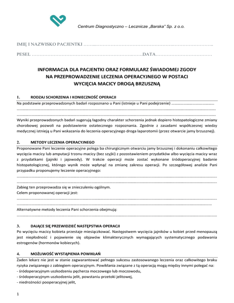 Centrum Diagnostyczno – Lecznicze „Barska” Sp. z o.o. IMIĘ I NAZWISKO PACJENTKI ……...………………………………………….…………………….. PESEL ……………………………………………………….…….DATA……………………………… INFORMACJA DLA PACJENTKI ORAZ FORMULARZ ŚWIADOMEJ ZGODY NA PRZEPROWADZENIE LECZENIA OPERACYJNEGO W POSTACI WYCIĘCIA MACICY DROGĄ BRZUSZNĄ 1. RODZAJ SCHORZENIA I KONIECZNOŚĆ OPERACJI Na podstawie przeprowadzonych badań rozpoznano u Pani (istnieje u Pani podejrzenie) ……………………….…………… …………………………………………………………………………………………………………………………………………………….…………………………. ………………………………………………………………………………………………………………………………………………….……………………………. Wyniki przeprowadzonych badań sugerują łagodny charakter schorzenia jednak dopiero histopatologiczne zmiany chorobowej pozwoli na podstawienie ostatecznego rozpoznania. Zgodnie z zasadami współczesnej wiedzy medycznej istnieją u Pani wskazania do leczenia operacyjnego droga laparotomii (przez otwarcie jamy brzusznej). 2. METODY LECZENIA OPERACYJNEGO Proponowane Pani leczenie operacyjne polega ba chirurgicznym otwarciu jamy brzusznej i dokonaniu całkowitego wycięcia macicy lub amputacji trzonu macicy (bez szyjki) z pozostawieniem przydatków albo wycięcia macicy wraz z przydatkami (jajniki i jajowody). W trakcie operacji może zostać wykonane śródoperacyjnej badanie histopatologicznej, którego wynik może wpłynąć na zmianę zakresu operacji. Po szczegółowej analizie Pani przypadku proponujemy leczenie operacyjnego: …………………………………………………………………………………………………………………………………………………………….………….………. …………………………………………………………………………………………………………………………………………………………….……….…………. Zabieg ten przeprowadza się w znieczuleniu ogólnym. Celem proponowanej operacji jest: ……………………………………………………………………………………………………………………………………………………………….….……………. ………………………………………………………………………………………………………………………………………………………….………………… Alternatywne metody leczenia Pani schorzenia obejmują: …………………………………………………………………………………………………………………………………………………………………..…….……… 3. DAJĄCE SIĘ PRZEWIDZIEĆ NASTĘPSTWA OPERACJI Po wycięciu macicy kobieta przestaje miesiączkować. Następstwem wycięcia jajników u kobiet przed menopauzą jest niepłodność i pojawienie się objawów klimakterycznych wymagających systematycznego podawania estrogenów (hormonów kobiecych). 4. MOŻLIWOŚĆ WYSTĄPIENIA POWIKŁAŃ Żaden lekarz nie jest w stanie zagwarantować pełnego sukcesu zastosowanego leczenia oraz całkowitego braku ryzyka związanego z zabiegiem operacyjnym. Powikłania związane z tą operacją mogą między innymi polegać na: - śródoperacyjnym uszkodzeniu pęcherza moczowego lub moczowodu, - śródoperacyjnym uszkodzeniu jelit, powstaniu przetoki jelitowej, - niedrożności pooperacyjnej jelit, 1 IMIĘ I NAZWISKO PACJENTA ……...………………………………………….…………………….. PESEL ……………………………………………………….…….DATA……………………………… - krwotoku śródoperacyjnym, - wtórym krwawieniu lub krwiakach wymagających przetoczenia krwi i/lub ponownej interwencji operacyjnej (otwarcia jamy brzusznej), - powstaniu przetoki dróg moczowych (np. pęcherzowo – pochwowej), - powikłaniach zakrzepowo – zatorowych (tworzenie się skrzeplin i zatykanie naczyń krwionośnych przez skrzepy), - zapaleniu otrzewnej, - zakażeniu rany pooperacyjnej, - zapaleniu pęcherza moczowego, - zaburzeniach w opróżnianiu pęcherza moczowego, - nietrzymaniu moczu, - bólach brzucha w wyniku powstania zrostów pooperacyjnych, - pogorszeniu jakości życia płciowego. Ciężki, zagrażające życiu lub śmiertelne powikłania proponowanego Pani zabiegu operacyjnego zdarzają się rzadko. 5. ROKOWANIA Prawdopodobieństwo powodzenia proponowanej operacji jest w Pani przypadku: duże średnie ograniczone Jeżeli nie wyrazi Pani zgody na proponowany zabieg operacyjny rokowanie co do stanu zdrowia w przyszłości jest następujące: ……………………………………………………………………………………………………………………………………………………………….……………. ……………………………………………………………………………………………………………………………………………………………….……………. 6. ROZMOWA Z LEKARZEM Prosimy, aby Pani zapytała nas o wszystko, co chciałaby Pani wiedzieć w związku z planowanym leczeniem. Wszelkie informacje dodatkowe dotyczące planowanego leczenia oraz wszelkie oczekiwane przez Panią wyjaśnienia można uzyskać u każdego specjalisty w zakresie ginekologii i położnictwa w naszym oddziale. Chętnie odpowiemy ba wszystkie Pani pytania. ZASTRZEŻENIA PACJENTKI CO DO PROPONOWANEGO LECZENIA OPERACYJNEGO ……………………………………………………………………………………………………………………………………………………………….………