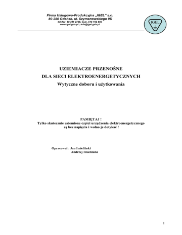 Firma Usługowo-Produkcyjna „IGEL” s.c. 80-280 Gdańsk, ul. Szymanowskiego 9D tel./fax 58 341 2725; kom. 515 192 866 www.igel.gda.pl ; [email protected] IGEL UZIEMIACZE PRZENOŚNE DLA SIECI ELEKTROENERGETYCZNYCH Wytyczne doboru i użytkowania PAMIĘTAJ ! Tylko skutecznie uziemione części urządzenia elektroenergetycznego są bez napięcia i wolno je dotykać ! Opracował : Jan Imieliński Andrzej Imieliński 1 Firma Usługowo-Produkcyjna „IGEL” s.c. 80-280 Gdańsk, ul. Szymanowskiego 9D IGEL tel./fax 58 341 2725; kom. 515 192 866 www.igel.gda.pl ; [email protected] SPIS TREŚCI 1. Wprowadzenie Str. 3 2. Dokumenty związane 3 3. Określenia 3 4. Dane charakterystyczne sprzętu uziemiającego 4 5. Parametry zwarciowe w sieciach elektroenergetycznych i przekroje przewodów uziemiaczy przenośnych 6. O zagrożeniach 6 17 7. Wymagania przepisów oraz skuteczne uziemianie urządzeń elektroenergetycznych 19 8. Optymalizacja w gospodarce uziemiaczami 22 9. Użytkowanie, konserwacja i wycofanie z eksploatacji 24 2 Firma Usługowo-Produkcyjna „IGEL” s.c. 80-280 Gdańsk, ul. Szymanowskiego 9D tel./fax 58 341 2725; kom. 515 192 866 www.igel.gda.pl ; [email protected] IGEL 1. Wprowadzenie Normy i przepisy określają wymagania w zakresie produkcji, doboru, stosowania i konserwacji sprzętu uziemiającego dla instalacji, sieci przesyłowych i rozdzielczych prądu przemiennego o dowolnym napięciu znamionowym. Celem niniejszych wytycznych jest przekazanie w niezbędnym zakresie zawartej w przepisach i wzbogaconej praktyką wiedzy potrzebnej w doborze i użytkowaniu sprzętu uziemiającego, organizacji robót na urządzeniach całkowicie wyłączonych spod napięcia oraz zabezpieczeniu miejsc pracy w sposób możliwie najłatwiejszy i całkowicie eliminujący ryzyko porażeń. Uziemiacz na stanowisku pracy jest wskaźnikiem trwałego braku napięcia na części, której się dotyka 2. Dokumenty związane 2.1 PN-EN 61230:2011 2.2 PN-EN 61138:2009 2.3 PN-EN 51110-1:2005 2.4 Dz.U.2013 poz.492 Prace pod napięciem. Przenośny sprzęt do uziemiania lub uziemiania i zwierania. Przewody przeznaczone do przenośnego sprzętu uziemiającego i zwierającego. Eksploatacja urządzeń elektrycznych. Rozporządzenie Ministra Gospodarki w sprawie bezpieczeństwa i higieny pracy przy urządzeniach energetycznych. 3. Określenia 3.1 Uziemiacz przenośny składa się z : - jednego lub kilku zacisków fazowych - przewodów zwierających zaciski fazowe - przewodu uziemiającego, który w uziemiaczach pojedynczych jest zarazem przewodem zwierającym - zacisku uziemiającego. 3.2 Zwieracz przenośny jest uziemiaczem złożonym tylko z zacisków fazowych, z których jeden służy jako zacisk uziemiający. 3.3 Stały punkt przyłączenia w postaci strzemienia, haka lub sworznia mocowanego na szynach płaskich lub przewodach okrągłych; umożliwia zakładanie zacisków fazowych, szczególnie na odcinkach pionowych i w miejscach trudniej dostępnych. 3.4 System uziemień, to uziomy sztuczne lub naturalne w postaci uziemionych konstrukcji stalowych, fundamentów żelbetowych słupów z dostępem do zbrojenia, uziemionych przewodów zerowych (PEN) sieci nn pracujących w układzie TN, metalowe uziemione żyły i powłoki kabli. 3.5 Przedłużacz jest przewodem uziomowym, który umożliwia połączenie przewodu uziemiającego z oddalonym poza wymiary uziemiacza systemem uziemiającym. 3 Firma Usługowo-Produkcyjna „IGEL” s.c. 80-280 Gdańsk, ul. Szymanowskiego 9D tel./fax 58 341 2725; kom. 515 192 866 www.igel.gda.pl ; [email protected] IGEL 4. Dane charakterystyczne sprzętu uziemiającego 4.1 Rodzaj sprzętu to jego nazwa, ilość zacisków fazowych i oznaczenie odmiany lekkiej (L) dla sieci SN. Np. uziemiacz trójfazowy lekki oznaczony jest symbolem U3L; uziemiacz pojedynczy – U1; zwieracz czterozaciskowy – Z4. 4.2 Typ uziemiacza zdeterminowany jest przez rozwiązanie konstrukcyjne zacisku fazowego i różnie oznaczany przez producentów sprzętu uziemiającego. 4.3 Stosownie do przeznaczenia uziemiaczy dobierane są długości przewodów uziemiających i zwierających w taki sposób, aby nie były zarówno za krótkie, jak i niepotrzebnie za długie. 4.4 Prąd znamionowy Ir i czas znamionowy tr: wartości przyporządkowane uziemiaczom lub ich częściom, które określają największą skuteczną wartość prądu i największą wartość całki Joule’a (Ir2xtr ), które urządzenie wytrzymuje bez niedopuszczalnych skutków. Znormalizowane wartości czasu znamionowego tr : 3s, 2s, 1s, 0,75s, 0,5s, 0,25s, 0,1s. Dla jednej z tych wartości czasu należy określić wartość skuteczną prądu Ir jako : Ir3, Ir2, Ir1, Ir0,75, Ir0,5, Ir0,25, Ir0,1 [kA] 4.5 Prąd szczytowy Im[kA] : wartość szczytowa prądu, który wystąpi w stanie nieustalonym spowodowanym włączeniem obwodu pod napięcie. Podczas badań typu przyjmuje się Im = ks xIrt[kA], gdzie ks =2 dla sprzętu do 1kV włącznie, ks=2,5 dla sprzętu powyżej 1kV. 4.6 Przekrój znamionowy przewodów zwierających i uziemiających jest dobierany tak, aby wytrzymywały maksymalne wartości prądów, czasów trwania zwarcia i całek Joule’a, na które mogą być narażone w praktyce. Norma zaleca, aby ze względu na ciężar sprzętu nie przewymiarowywać przekrojów. Praktyczniejszym rozwiązaniem, w wyjątkowych przypadkach, jest założenie uziemiacza dodatkowego. 4 Firma Usługowo-Produkcyjna „IGEL” s.c. 80-280 Gdańsk, ul. Szymanowskiego 9D tel./fax 58 341 2725; kom. 515 192 866 www.igel.gda.pl ; [email protected] IGEL 4.7 Sposób oznaczania sprzętu uziemiającego : RNL – T – L1/L2 – Ir/tr – S/rSi Ir - tr ; ks= R - rodzaj sprzętu : U – uziemiacz, Z – zwieracz, P – przedłużacz N - liczba zacisków L - typ lekki T - typ zacisku fazowego : ZO1, ZO2 - śrubowy do przewodów okrągłych ZP1,ZU1 - śrubowy do szyn płaskich ZZ - zatrzaskowy na uchwycie izolacyjnym PB - do podstaw i rozłączników bezpiecznikowych K - kleszczowy un