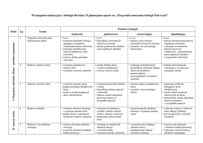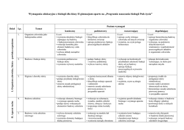 Wymagania edukacyjne z biologii dla klasy II gimnazjum oparte na „Programie nauczania biologii Puls życia” Dział Poziom wymagań Lp. Temat II. Aparat ruchu I. Organizm człowieka. Skóra – powłoka organizmu konieczny podstawowy rozszerzający dopełniający 1. Organizm człowieka jako funkcjonalna całość Uczeń: • wymienia dziedziny biologii zajmujące się budową i funkcjonowaniem człowieka • wskazuje komórkę jako element budulcowy ciała człowieka • wylicza układy narządów człowieka Uczeń: • klasyfikuje człowieka do królestwa zwierząt • opisuje podstawowe funkcje poszczególnych układów Uczeń: • opisuje cechy różniące człowieka od innych zwierząt • wyjaśnia, na czym polega homeostaza Uczeń: • opisuje hierarchiczną budowę organizmu człowieka • wykazuje, na podstawie dotychczasowych wiadomości, współzależność poszczególnych układów w organizmie człowieka 2. Budowa i funkcje skóry • wymienia podstawowe funkcje skóry • wymienia wytwory naskórka • podaje funkcje skóry i warstwy podskórnej • wylicza warstwy skóry • wykazuje na konkretnych przykładach zależność funkcji skóry od jej budowy • opisuje funkcje poszczególnych wytworów naskórka • planuje doświadczenie wykazujące, że skóra jest narządem zmysłu 3. Higiena i choroby skóry • wymienia choroby skóry • podaje przykłady dolegliwości skóry • omawia zasady pielęgnacji skóry młodzieńczej • wyjaśnia konieczność dbania o skórę • klasyfikuje rodzaje oparzeń i odmrożeń • omawia zasady udzielania pierwszej pomocy w przypadku oparzeń • omawia objawy dolegliwości skóry • wyjaśnia, czym są alergie skórne • proponuje środki do pielęgnacji skóry młodzieńczej • ocenia wpływ promieni słonecznych na skórę • demonstruje zasady udzielania pierwszej pomocy w przypadku oparzeń 4. Budowa szkieletu • wskazuje elementy biernego i czynnego aparatu ruchu • podaje nazwy wskazanych elementów budowy szkieletu • wskazuje na schemacie, rysunku, modelu szkielet osiowy, obręczy i kończyn • rozpoznaje różne kształty kości • wyjaśnia sposób działania biernego i czynnego aparatu ruchu • wskazuje różnice w budowie kości długiej i płaskiej • porównuje kości o różnych kształtach 5. Budowa i rola szkieletu osiowego • wylicza elementy szkieletu osiowego • wymienia elementy budujące klatkę piersiową • wskazuje na modelu lub ilustracji mózgoi trzewioczaszkę • wymienia narządy chronione • wymienia kości budujące szkielet osiowy • charakteryzuje funkcje szkieletu osiowego • omawia rolę chrząstek w budowie klatki piersiowej • wykazuje związek budowy odcinków kręgosłupa • podaje nazwy odcinków kręgosłupa przez klatkę piersiową • wskazuje na schemacie, rysunku, modelu elementy szkieletu osiowego • wyjaśnia związek budowy czaszki z pełnionymi przez nią funkcjami z pełnioną przez nie funkcją 6. Szkielet kończyn oraz ich obręczy • wymienia elementy budowy obręczy barkowej i miednicznej • wskazuje na modelu lub schemacie kości kończyn górnej i dolnej • wymienia rodzaje połączeń kości • opisuje budowę stawu • rozpoznaje rodzaje stawów • odróżnia staw zawiasowy od kulistego • wymienia kości tworzące obręcze barkową i miedniczną • porównuje budowę kończyny górnej i dolnej • charakteryzuje połączenia kości • wykazuje związek budowy z funkcją kończyny dolnej • wykazuje związek budowy obręczy miednicznej z pełnioną przez nią funkcją • wyjaśnia związek budowy stawu z zakresem ruchu kończyny 7. Kości – elementy składowe szkieletu • opisuje budowę fizyczną kości • wskazuje miejsce występowania szpiku kostnego • omawia doświadczenie wykazujące skład chemiczny kości • charakteryzuje zmiany zachodzące w układzie kostnym wraz z wiekiem • omawia znaczenie składników chemicznych w budowie kości • opisuje rolę szpiku kostnego • planuje doświadczenie wykazujące skład chemiczny kości 8. Budowa i znaczenie mięśni • wskazuje na ilustracji najważniejsze mięśnie szkieletowe przy pomocy nauczyciela • wymienia rodzaje tkanki mięśniowej • wskazuje położenie tkanki mięśniowej gładkiej i poprzecznie prążkowanej szkieletowej • podaje warunki niezbędne do prawidłowego funkcjonowania mięśni • określa funkcje wskazanych mięśni szkieletowych • opisuje budowę tkanki mięśniowej • wykonuje rysunek tkanki mięśniowej spod mikroskopu • wyjaśnia na czym polega antagonistyczne działanie mięśni • przedstawia negatywny wpływ środków dopingujących na zdrowie człowieka • rozpoznaje mięśnie szkieletowe wskazane na ilustracji • opisuje czynności mięśni wskazanych na schemacie • rozpoznaje pod mikroskopem różne rodzaje tkanki mięśniowej • wyjaśnia warunki prawidłowej pracy mięśni • analizuje przyczyny urazów ścięgien • wykazuje związek budowy z funkcją tkanki mięśniowej • uzasadnia konieczność regularnych ćwiczeń gimnastycznych 9. Choroby aparatu ruchu • wymienia naturalne krzywizny kręgosłupa • opisuje przyczyny powstawania wad postawy • przewiduje skutki przyjmowania nieprawidłowej postawy ciała • rozpoznaje na ilustracji wady postawy • wskazuje ślad stopy z płaskostopiem • opisuje urazy kończyn • omawia zasady udzielania pierwszej pomocy • rozpoznaje naturalne krzywizny kręgosłupa • wyjaśnia przyczyny wad postawy • omawia sposoby zapobiegania deformacjom szkieletu • określa czynniki wpływające • wyszukuje informacje dotyczące zapobiegania płaskostopiu • wyjaśnia konieczność rehabilitacji po urazach • planuje i demonstruje udzielanie pierwszej pomocy III. Układ pokarmowy • wymienia choroby aparatu ruchu w przypadku urazów kończyn na prawidłowy rozwój muskulatury ciała • omawia przyczyny chorób aparatu ruchu • omawia przyczyny zmian zachodzących w układzie 