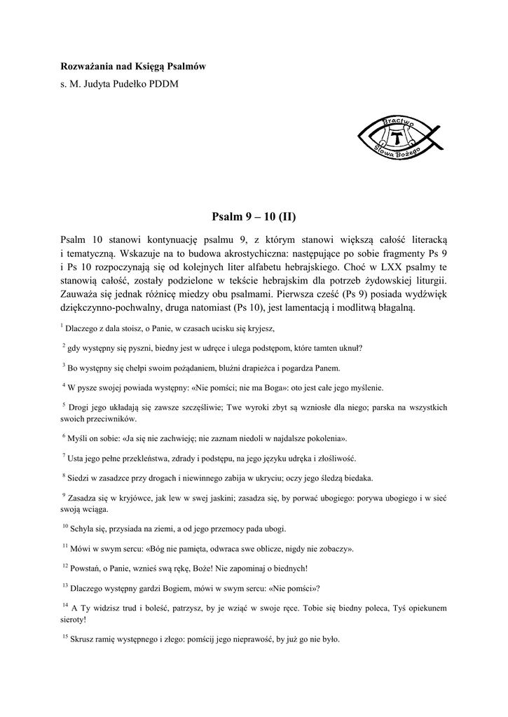 Rozważania nad Księgą Psalmów s. M. Judyta Pudełko PDDM Psalm 9 – 10 (II) Psalm 10 stanowi kontynuację psalmu 9, z którym stanowi większą całość literacką i tematyczną. Wskazuje na to budowa akrostychiczna: następujące po sobie fragmenty Ps 9 i Ps 10 rozpoczynają się od kolejnych liter alfabetu hebrajskiego. Choć w LXX psalmy te stanowią całość, zostały podzielone w tekście hebrajskim dla potrzeb żydowskiej liturgii. Zauważa się jednak różnicę miedzy obu psalmami. Pierwsza cześć (Ps 9) posiada wydźwięk dziękczynno-pochwalny, druga natomiast (Ps 10), jest lamentacją i modlitwą błagalną. 1 Dlaczego z dala stoisz, o Panie, w czasach ucisku się kryjesz, 2 gdy występny się pyszni, biedny jest w udręce i ulega podstępom, które tamten uknuł? 3 Bo występny się chełpi swoim pożądaniem, bluźni drapieżca i pogardza Panem. 4 W pysze swojej powiada występny: «Nie pomści; nie ma Boga»: oto jest całe jego myślenie. 5 Drogi jego układają się zawsze szczęśliwie; Twe wyroki zbyt są wzniosłe dla niego; parska na wszystkich swoich przeciwników. 6 Myśli on sobie: «Ja się nie zachwieję; nie zaznam niedoli w najdalsze pokolenia». 7 Usta jego pełne przekleństwa, zdrady i podstępu, na jego języku udręka i złośliwość. 8 Siedzi w zasadzce przy drogach i niewinnego zabija w ukryciu; oczy jego śledzą biedaka. 9 Zasadza się w kryjówce, jak lew w swej jaskini; zasadza się, by porwać ubogiego: porywa ubogiego i w sieć swoją wciąga. 10 Schyla się, przysiada na ziemi, a od jego przemocy pada ubogi. 11 Mówi w swym sercu: «Bóg nie pamięta, odwraca swe oblicze, nigdy nie zobaczy». 12 Powstań, o Panie, wznieś swą rękę, Boże! Nie zapominaj o biednych! 13 Dlaczego występny gardzi Bogiem, mówi w swym sercu: «Nie pomści»? 14 A Ty widzisz trud i boleść, patrzysz, by je wziąć w swoje ręce. Tobie się biedny poleca, Tyś opiekunem sieroty! 15 Skrusz ramię występnego i złego: pomścij jego nieprawość, by już go nie było. 16 Pan jest królem na wieki wieków, z Jego ziemi zniknęli poganie. 17 Panie, usłyszałeś pragnienie pokornych, umocniłeś ich serca, nakłoniłeś ucha, 18 aby strzec praw sieroty i uciśnionego i aby człowiek powstały z ziemi nie siał już postrachu. Występny się pyszni… Pojawia się problem pomyślności występnych. Występny to przede wszystkim ten, kto odrzuca Boga i gardzi Jego Prawem, Jego wolą. Jest bardzo pewny siebie, swojej pozycji i majątku, uważa, iż Bóg jest mu niepotrzebny. Ma przygotowany własny projekt własnego życia i jest przekonany, że na pewno mu się powiedzie. Odrzucenie Boga łączy się jednocześnie z pogardą wobec bliźnich. Knuje podstępy, stosuje przemoc. Psalmista boleje nad tą sytuacją. Jak to może być, iż złoczyńca nie zostaje powstrzymany, ukarany, a nawet doświadcza pomyślności… Gdzie jest Bóg, obrońca uciśnionych? Sytuacja staje się dotkliwie trudna w tym momencie, kiedy zło przewrotnych zdaje się przeczyć obecności Boga, przekreśla Jego bliskość. Nie ma Boga? Nie ma Go tu, w tej sytuacji, nie ocali. Nie wiadomo, czy występny mówi wprost te słowa, czy też o tym świadczy jego bezbożne życie. Odbiera to ostatnią nadzieję człowieka prawego. Boże, gdzie jesteś? Panie, gdzie jesteś? Tobie się biedny poleca… Udręka ubogiego staje się nieznośna. Ale ubogi to człowiek zaufania, nie ma nikogo poza Bogiem. Stąd pojawiają się, wręcz mnożą się kolejne pytania. Udręczony człowiek woła do Boga. Wyznaje przed Nim swoje wątpliwości, lęk, osamotnienie. Psalmista przyzywa Bożego działania, doświadczenia Bożej mocy. Ufność pokładana w Panu nie zostaje zawiedziona. Psalm kończy się doświadczeniem Bożego ratunku, którego adresatami są ubodzy, sieroty i uciśnieni. Bóg powstał, aby ratować tych, którzy Mu ufają. On słyszy każde wołanie człowieka. Żył pewien człowiek bogaty, który ubierał się w purpurę i bisior i dzień w dzień świetnie się bawił. U bramy jego pałacu leżał żebrak okryty wrzodami, imieniem Łazarz. Pragnął on nasycić się odpadkami ze stołu bogacza; nadto i psy przychodziły i lizały jego wrzody. Umarł żebrak, i aniołowie zanieśli go na łono Abrahama. Umarł także bogacz i został pogrzebany. (Łk 16,19–22) Panie Jezu Chryste, otwórz nasze serca na poznanie Twojej miłości, która nigdy nie opuszcza tych, którzy w niej pokładają nadzieję. Oddajemy Ci wszelkie ubóstwo i cierpienie tego świata. Spraw, aby Twoja moc zwyciężyła wszelkie struktury zła, bądź naszym Zbawicielem i Obrońcą.