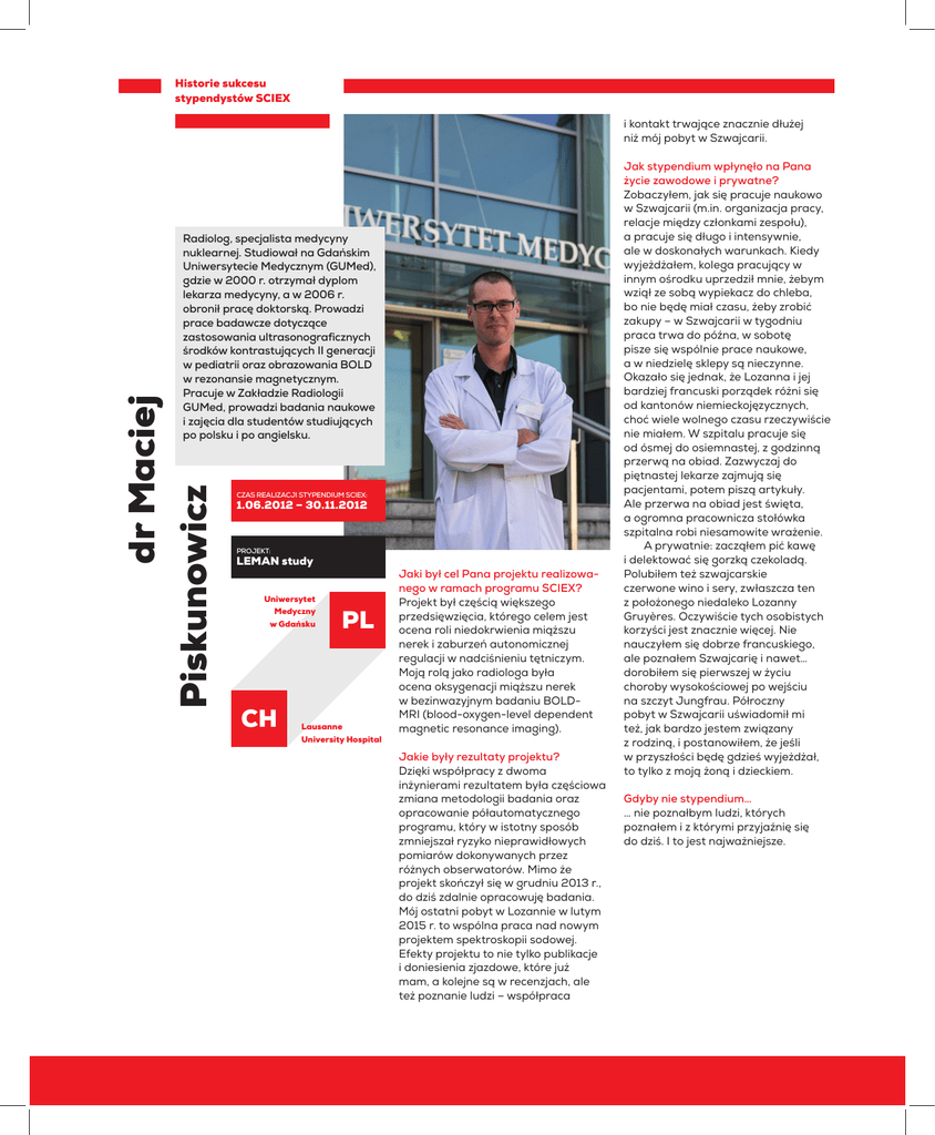 Historie sukcesu stypendystów SCIEX i kontakt trwające znacznie dłużej niż mój pobyt w Szwajcarii. dr Maciej Piskunowicz Radiolog, specjalista medycyny nuklearnej. Studiował na Gdańskim Uniwersytecie Medycznym (GUMed), gdzie w 2000 r. otrzymał dyplom lekarza medycyny, a w 2006 r. obronił pracę doktorską. Prowadzi prace badawcze dotyczące zastosowania ultrasonograficznych środków kontrastujących II generacji w pediatrii oraz obrazowania BOLD w rezonansie magnetycznym. Pracuje w Zakładzie Radiologii GUMed, prowadzi badania naukowe i zajęcia dla studentów studiujących po polsku i po angielsku. Czas realizacji stypendium SCIEX: 1.06.2012 – 30.11.2012 Projekt: LEMAN study Uniwersytet Medyczny w Gdańsku CH PL Lausanne University Hospital Jaki był cel Pana projektu realizowanego w ramach programu SCIEX? Projekt był częścią większego przedsięwzięcia, którego celem jest ocena roli niedokrwienia miąższu nerek i zaburzeń autonomicznej regulacji w nadciśnieniu tętniczym. Moją rolą jako radiologa była ocena oksygenacji miąższu nerek w bezinwazyjnym badaniu BOLDMRI (blood-oxygen-level dependent magnetic resonance imaging). Jakie były rezultaty projektu? Dzięki współpracy z dwoma inżynierami rezultatem była częściowa zmiana metodologii badania oraz opracowanie półautomatycznego programu, który w istotny sposób zmniejszał ryzyko nieprawidłowych pomiarów dokonywanych przez różnych obserwatorów. Mimo że projekt skończył się w grudniu 2013 r., do dziś zdalnie opracowuję badania. Mój ostatni pobyt w Lozannie w lutym 2015 r. to wspólna praca nad nowym projektem spektroskopii sodowej. Efekty projektu to nie tylko publikacje i doniesienia zjazdowe, które już mam, a kolejne są w recenzjach, ale też poznanie ludzi – współpraca Jak stypendium wpłynęło na Pana życie zawodowe i prywatne? Zobaczyłem, jak się pracuje naukowo w Szwajcarii (m.in. organizacja pracy, relacje między członkami zespołu), a pracuje się długo i intensywnie, ale w doskonałych warunkach. Kiedy wyjeżdżałem, kolega pracujący w innym ośrodku uprzedził mnie, żebym wziął ze sobą wypiekacz do chleba, bo nie będę miał czasu, żeby zrobić zakupy – w Szwajcarii w tygodniu praca trwa do późna, w sobotę pisze się wspólnie prace naukowe, a w niedzielę sklepy są nieczynne. Okazało się jednak, że Lozanna i jej bardziej francuski porządek różni się od kantonów niemieckojęzycznych, choć wiele wolnego czasu rzeczywiście nie miałem. W szpitalu pracuje się od ósmej do osiemnastej, z godzinną przerwą na obiad. Zazwyczaj do piętnastej lekarze zajmują się pacjentami, potem piszą artykuły. Ale przerwa na obiad jest święta, a ogromna pracownicza stołówka szpitalna robi niesamowite wrażenie. A prywatnie: zacząłem pić kawę i delektować się gorzką czekoladą. Polubiłem też szwajcarskie czerwone wino i sery, zwłaszcza ten z położonego niedaleko Lozanny Gruyères. Oczywiście tych osobistych korzyści jest znacznie więcej. Nie nauczyłem się dobrze francuskiego, ale poznałem Szwajcarię i nawet… dorobiłem się pierwszej w życiu choroby wysokościowej po wejściu na szczyt Jungfrau. Półroczny pobyt w Szwajcarii uświadomił mi też, jak bardzo jestem związany z rodziną, i postanowiłem, że jeśli w przyszłości będę gdzieś wyjeżdżał, to tylko z moją żoną i dzieckiem. Gdyby nie stypendium… … nie poznałbym ludzi, których poznałem i z którymi przyjaźnię się do dziś. I to jest najważniejsze.