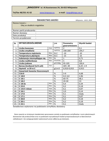 „BINGOSPA” ul. Al.Kasztanowa 24, 26-652 Milejowice Tel/fax 48/331 41 62 www.bingospa.eu e-mail: [email protected] ŚWIADECTWO JAKOŚCI Milejowice , 18.01..2010 Nazwa towaru : Olej ze słodkich migdałów Numer partii producenta : Numer dostawy : Data produkcji : Termin przydatności : lp WYSZCZEGÓLNIENIE j.m Parametry gwarantowane 2 190-200 -10 -15 1 5 95-105 40Y; 4R 0,910-0,915 max mgKOH/g 1. Liczba kwasowa mgKOH/g 2. Liczba zmydlania Max St.C 3. Temperatura mętnienia Max St.C 4. Temperatura płynięcia Max % 5. Substancje niezmydlające się Max meq 02/kg 6. Liczba nadtlenkowa gI2/100g 7. Liczba jodowa max 8. Barwa (lovibond 51/4 cell) 9. Gęstość w 20 st.C g/cm3 10. Zawartość kwasów tłuszczowych 11. C16:0 % 3-9 12. C 18:0 % 0,5-3,0 13. C 18:1 % 60-75 14. C 18:2 % 20-30 Max 15. C 18:3a % 0,4 Max % 16. C 22:0 0,2 max % 17. C 14:0 i niższe 0,1 Max 18. C 16:1 % 2,0 Max 19. C 17:0 % 0,1 Max % 20 C 17:1 0,1 Max % 21 C 20:0 0,2 Max % 22. C 20:1 0,2 Max 23. C 22:1 % 0,1 Świadectwo wykonano na podstawie certyfikatu dostawcy Wyniki badań 0,1 194,7 -10 -15 0,71 0,8 100,4 8,3Y; 1 R 0,915 4,68 2,96 68,1 23 0,34 0,18 0,07 0,14 ślady 0,07 0,18 0,18 ślady Dane zawarte w niniejszym świadectwie opracowane zostały na podstawie certyfikatów i norm jakościowych dostawców lub producentów oraz na podstawie wyrywkowych badań przeprowadzonych w laboratorium zakładowym i nie zastępują badań wykonanych przez odbiorcę po dostawie .