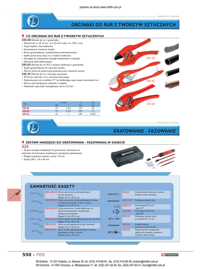 section 15 PL_noir 1/03/05 13:05 Page 550 pobrano ze strony www.imbth.com.pl NARZĘDZIA OGÓLNE OBCINAKI DO RUR Z TWORZYW SZTUCZNYCH ▼ 335 OBCINAKI DO RUR Z TWORZYW SZTUCZNYCH 335.40 Obcinak do rur z grzechotką. • Obcinak do rur d 12 mm : 4 x 2,5 mmz maks ; 4 x 3/32 s. inch. • Cięcie szybkie i bez zadziorów. • Automatyczne rozwarcie szczęki. • Posuw grzechotkowy z mechanizmem przeciwzwrotnym. • Szybki posuw przy cięciu rur o małych średnicach. • Narzędzie do ukosowania krawędzi wbudowane w rękojeść. • Obcinanie kabli elektrycznych. 335.63 Obcinak do rur PCV o dużych średnicach, z grzechotką. • System grzechotkowy do cięcia bez wysiłku. • Powrót ostrza do pozycji spoczynkowej przez rozwarcie ramion. 335.25 Obcinak do rur z tworzyw sztucznych. • d 24 mm maks dla rury z tworzywa sztucznego. • Opatentowany nóż z profilem “V” do dokładnego cięcia, nawet najcieńszych rur. • Nóż ze stali nierdzewnej: solidność i trwałość. • Możliwość cięcia kabli wielożyłowych do 5 x 2,5 mm2 A maks F mm 42 63 25 335.40 335.63 335.25 " 1"1/2 2"1/2 1 L mm 230 430 195 335.40 335.63 D kg 0,6 1,1 0,165 335.25 NARZĘDZIA OGÓLNE GRATOWANIE - FAZOWANIE ▼ ZESTAW NARZĘDZI DO GRATOWANIA - FAZOWANIA,W KASECIE 325 • Zestaw narzędzi niezbędnych do gratowania i fazowania rur stalowych, aluminiowych, miedzianych, mosiężnych, plastikowych. • Długość użytkowa uchwytu ostrza: 110 mm. • Kaseta 200 x 110 x 40 mm. ZAWARTOŚĆ KASETY 325.L35J10 Ostrze wzmocnione, ze stali szybkotnącej do stali i aluminium. Długość: 47 mm ; d 3,2 mm 325.L20J10 Ostrze wzmocnione, ze stali szybkotnącej do żeliwa i mosiądzu; zastosowanie w lewo i w prawo. Długość: 47 mm ; d 3,2 mm 325.L30J10 Ostrze wzmocnione, ze stali szybkotnącej do konturów zewnętrznych i wewnętrznych, zwłaszcza do przewierceń. Długość: 47 mm ; d 3,2 mm 325.L10J10 Ostrze cienkie, ze stali szybkotnącej do stali i aluminium Długość: 47 mm ; d 3,5 mm 325.L1J10 Ostrze ze stali szybkotnącej do stali i aluminium Długość: 23 mm ; d 2,6 mm 325.L2J10 Ostrze ze stali szybkotnącej do żeliwa i mosiądzu; zastosowanie w lewo i w prawo Długość: 23 mm ; d 2,6 mm 550 - F05 325.01 Gratownica jednoczęściowa z ostrzem krótkim do stali i aluminium. 325.04-01 Przedłużacz uchwytu frezu. 325.F12 Frez stożkowy d 12 mm – gwint M7 Frez stożkowy d 20 mm – gwint M7 Przedłużacz uchwytu ostrzy, do ostrzy d 2,6 i 3,2 mm 325.F20 325.03 325.05 325.02 Skrobak trójkątny, zaostrzony na obu końcach. Rękojeść oprawki narzędziowej: nadaje się do narzędzi o symbolach: 325.04.01, 325.03, 325.05 Katalog elektroniczny na www.facom.com IM Kraków : 31-231 Kraków, ul. Siewna 30, tel. (012) 415-80-81, fax. (012) 415-80-39, [email protected] IM Chorzów : 41-500 Chorzów, ul. Młodzieżowa 17, tel. (032) 241-20-20, fax. (032) 247-63-31, [email protected]