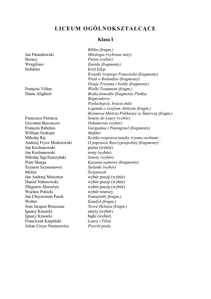 L ICE UM OGÓL OKSZT AŁCĄCE Klasa I Jan Parandowski Horacy Wergiliusz Sofokles François Villon Dante Alighieri Francesco Petrarca Giovanni Boccaccio François Rabelais William Szekspir Mikołaj Rej Andrzej Frycz Modrzewski Jan Kochanowski Jan Kochanowski Mikołaj Sęp-Szarzyński Piotr Skarga Szymon Szymonowic Molier Jan Andrzej Morsztyn Daniel Naborowski Zbigniew Morsztyn Wacław Potocki Jan Chryzostom Pasek Wolter Jean Jacques Rousseau Ignacy Krasicki Ignacy Krasicki Franciszek Karpiński Julian Ursyn Niemcewicz Biblia (fragm.) Mitologia (wybrane mity) Pieśni (wybór) Eneida (fragmenty) Król Edyp Kwiatki świętego Franciszka (fragmenty) Pieśń o Rolandzie (fragmenty) Dzieje Tristana i Izoldy (fragmenty) Wielki Testament (fragm.) Boska komedia (fragmenty Piekła) Bogurodzica Posłuchajcie, bracia miła Legenda o świętym Aleksym (fragm.) Rozmowa Mistrza Polikarpa ze Śmiercią (fragm.) Sonety do Laury (wybór) Dekameron (wybór) Gargantua i Pantagruel (fragmenty) Makbet Krótka rozprawa między trzema osobami... O poprawie Rzeczypospolitej (fragmenty) pieśni (wybór) treny (wybór) Sonety (wybór) Kazania sejmowe (fragmenty) Sielanki (wybór) Świętoszek wybór poezji (wybór) wybór poezji (wybór) wybór poezji (wybór) wybór wierszy Pamiętniki (fragm.) Kandyd (fragm.) 4owa Heloiza (fragm.) satyry (wybór) bajki (wybór) Laura i Filon Powrót posła Klasa II Adam Mickiewicz Adam Mickiewicz Adam Mickiewicz Juliusz Słowacki Juliusz Słowacki Zygmunt Krasiński Cyprian Kamil Norwid Bolesław Prus Bolesław Prus Eliza Orzeszkowa Eliza Orzeszkowa Maria Konopnicka Henryk Sienkiewicz Kazimierz Przerwa-Tetmajer Jan Kasprowicz Leopold Staff Stanisław Wyspiański Stanisław Władysław Reymont Stefan Żeromski Johan Wolfgang Goethe Fiodor Dostojewski Joseph Conrad Pan Tadeusz Dziady cz. III wybór wierszy Kordian wybór wierszy 4ie-Boska komedia wybór wierszy Lalka Kamizelka Gloria victis 4ad 4iemnem (fragm.) Mendel Gdański Potop wybór wierszy wybór wierszy wybór wierszy Wesele Chłopi t. 1 Ludzie bezdomni Cierpienia młodego Wertera Zbrodnia i kara Jądro ciemności lub Lord Jim Poziom rozszerzony: Johann Wolfgang Goethe Adam Mickiewicz Aleksander Fredro Faust cz. 1 Dziady cz. IV Śluby panieńskie Klasa III Stefan Żeromski Witold Gombrowicz Zofia Nałkowska Tadeusz Borowski Gustaw Herling-Grudziński Bolesław Leśmian Julian Tuwim Maria Palikowska-Jasnorzewska Czesław Miłosz Krzysztof Kamil Baczyński Tadeusz Różewicz Zbigniew Herbert Miron Białoszewski Wisława Szymborska Stanisław Barańczak Jan Twardowski Sławomir Mrożek Hanna Krall Albert Camus Przedwiośnie Ferdydurke Granica Pożegnanie z Marią Inny świat wybór wierszy wybór wierszy wybór wierszy wybór wierszy wybór wierszy wybór wierszy wybór wierszy wybór wierszy wybór wierszy wybór wierszy wybór wierszy Tango Zdążyć przed Panem Bogiem Dżuma Poziom rozszerzony: Witold Gombrowicz Maria Kuncewiczowa Stanisław Ignacy Witkiewicz Antoni Libera Kazimierz Majdański Franz Kafka Michaił Bułhakow Trans-Atlantyk Cudzoziemka Szewcy Madame Będziecie moimi świadkami Proces Mistrz i Małgorzata