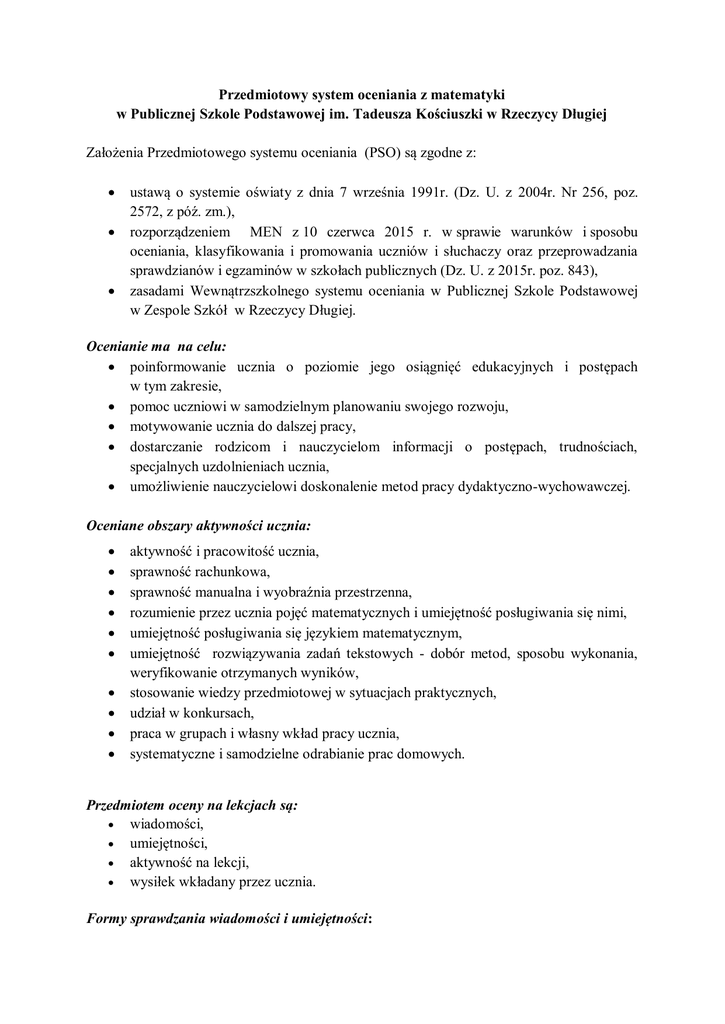 Przedmiotowy system oceniania z matematyki w Publicznej Szkole Podstawowej im. Tadeusza Kościuszki w Rzeczycy Długiej Założenia Przedmiotowego systemu oceniania (PSO) są zgodne z: ustawą o systemie oświaty z dnia 7 września 1991r. (Dz. U. z 2004r. Nr 256, poz. 2572, z póź. zm.), rozporządzeniem MEN z 10 czerwca 2015 r. w sprawie warunków i sposobu oceniania, klasyfikowania i promowania uczniów i słuchaczy oraz przeprowadzania sprawdzianów i egzaminów w szkołach publicznych (Dz. U. z 2015r. poz. 843), zasadami Wewnątrzszkolnego systemu oceniania w Publicznej Szkole Podstawowej w Zespole Szkół w Rzeczycy Długiej. Ocenianie ma na celu: poinformowanie ucznia o poziomie jego osiągnięć edukacyjnych i postępach w tym zakresie, pomoc uczniowi w samodzielnym planowaniu swojego rozwoju, motywowanie ucznia do dalszej pracy, dostarczanie rodzicom i nauczycielom informacji o postępach, trudnościach, specjalnych uzdolnieniach ucznia, umożliwienie nauczycielowi doskonalenie metod pracy dydaktyczno-wychowawczej. Oceniane obszary aktywności ucznia: aktywność i pracowitość ucznia, sprawność rachunkowa, sprawność manualna i wyobraźnia przestrzenna, rozumienie przez ucznia pojęć matematycznych i umiejętność posługiwania się nimi, umiejętność posługiwania się językiem matematycznym, umiejętność rozwiązywania zadań tekstowych - dobór metod, sposobu wykonania, weryfikowanie otrzymanych wyników, stosowanie wiedzy przedmiotowej w sytuacjach praktycznych, udział w konkursach, praca w grupach i własny wkład pracy ucznia, systematyczne i samodzielne odrabianie prac domowych. Przedmiotem oceny na lekcjach są: wiadomości, umiejętności, aktywność na lekcji, wysiłek wkładany przez ucznia. Formy sprawdzania wiadomości i umiejętności: prace klasowe, sprawdziany, kartkówki , testy diagnostyczne, odpowiedzi ustne, aktywność, prace domowe, prace długoterminowe (referaty, pomoce dydaktyczne). Praca klasowa (zadanie klasowe): Praca samodzielna ucznia na lekcji (45 min) w formie pisemnej obejmująca wiadomości i umiejętności dotyczące jednego działu (szeroki zakres i różnorodność zadań, oceny 1-6). Są one oceniane zgodnie z następującymi kryteriami procentowymi: 0% - 34% niedostateczny 35% - 49% dopuszczający 50% - 70% dostateczny 71% -89% dobry 90% - 100% bardzo dobry 90% + zadanie dodatkowe celujący Nauczyciel w zależności od stopnia trudności pracy pisemnej, ma prawo użycia innej skali niż powyższa. Uczniom z deficytami rozwojowymi posiadającymi opinię z poradni psychologiczno pedagogicznej nauczyciel obniża skalę procentową w zależności od stopnia dostosowania wymagań edukacyjnych. Sprawdzian: Samodzielna, pisemna praca ucznia na lekcji (20-30 min) obejmująca i umiejętności w danym dziale (wąski zakres - z kilku lekcji, oceny 1-5). wiedzę Kartkówka: Samodzielna, pisemna praca ucznia na lekcji (10-15 min) obejmująca wiedzę i umiejętności w danym dziale (wąski zakres - maksymalnie z trzech ostatnich lekcji, oceny 1-5) lub sprawdzenie ostatniej pracy domowej. Standaryzowane testy zewnętrzne: - trzy prace kontrolne sprawdzające postępy ucznia w nauczaniu matematyki - Sesje z plusem, przeprowadzane: na początku roku szkolnego, pod koniec pierwszego okresu i pod koniec roku szkolnego, - próbny i właściwy sprawdzian szóstoklasisty, - badanie ogólnopolskie piątoklasistów - Duma, - inne dostępne w danym roku szkolnym testy diagnostyczne. Każdy test będzie podlegał ocenie (1-6). Ocena z badania wyników nie może obniżyć oceny z przedmiotu wynikającej z ocen cząstkowych, ma wspomagać nauczyciela w wystawieniu uczniowi oceny śródrocznej lub rocznej. Odpowiedzi ustne: Są krótką formą sprawdzenia wiedzy i umiejętności ucznia z trzech ostatnich lekcji oraz na lekcji powtórzeniowej z ostatniego działu. Ocenie podlega umiejętność udzielania odpowiedzi ustnych na pytania postawione przez nauczyciela (język danego przedmiotu, umiejętność wnioskowania, uogólniania, uzasadniania, analizowania tematu czy zadania, zawartość rzeczowa, formułowanie spostrzeżeń, wyrażania sądów, trafność doboru metod rozwiązania danego zagadnienia). Dodatkowe pytania naprowadzające wpływają na obniżenie oceny. Po otrzymaniu oceny niedostatecznej z odpowiedzi (rozwiązania zadania na tablicy), uczeń w ciągu tygodnia może ją poprawić, ale wcześniej powinien zgłosić chęć takiej poprawy nauczycielowi. Forma poprawy jest ustna. Aktywność: Aktywność na lekcji nagradzana jest ,,plusami''. Za pięć zgromadzonych plusów uczeń otrzymuje ocenę bardzo dobrą, za cztery - dobrą, natomiast dwa lub trzy znaki plus mogą być zamienione na ocenę odpowiednio dostateczną i dopuszczającą tylko na wyraźną prośbę ucznia. Za aktywność na lekcji rozumiemy: - częste zgłaszanie się i udzielanie poprawnych odpowiedzi, - rozwiązywanie zadań dodatkowych w czasie lekcji i w domu, - aktywną pracę w grupach, - wykonanie potrzebnej na lekcję pomocy dydaktycznej. Plusy za aktywność zliczane są w danym okresie (nie przechodzą na drugi okres). Prace domowe: Prace domowe rozwiązywane przez uczniów podlegają kontroli i ocenieniu. Mogą być sprawdzane w następujący sposób: wybiórczo na ocenę podczas lekcji (rozwiązane na tablicy z wyjaśnieniem), poprzez głośne odczytanie przez ucznia, wspólnie z całą klasą. Brak pracy domowej, nie zgłoszony nauczycielowi niedostateczną. jest równoznaczny z oceną Prace długoterminowe (referaty, pomoce dydaktyczne): Dodatkowe prace wykonane przez uczniów, przy ocenie których brany jest pod uwagę przede wszystkim wkład pracy i różnorodność źródeł informacji, wizualizacja, staranność, zaangażowanie ucznia itp. Formy manualne: - wykonywanie konstrukcji geometrycznych, - budowanie modeli figur geometrycznych, - inne pomoce dydaktyczne. Udział w konkursach: Konkursy mają na celu motywowanie ucznia do dalszego rozwoju i stwarzają w