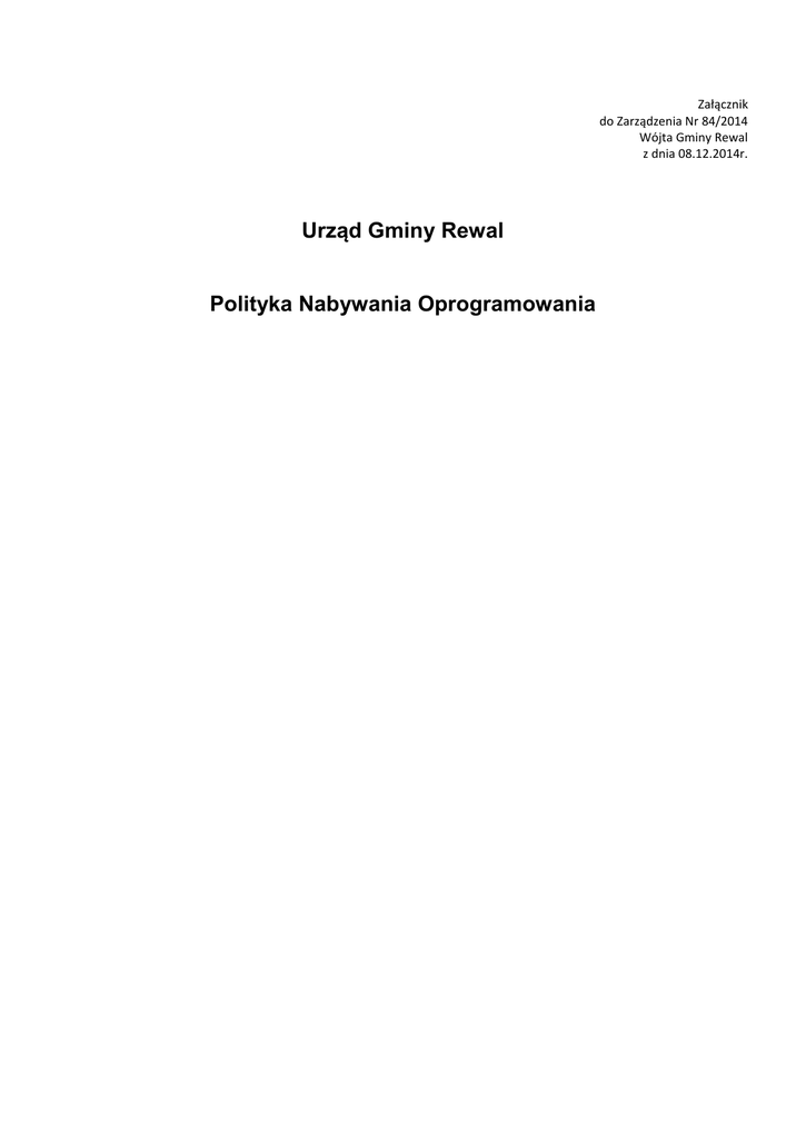 Załącznik do Zarządzenia Nr 84/2014 Wójta Gminy Rewal z dnia 08.12.2014r. Urząd Gminy Rewal Polityka Nabywania Oprogramowania WPROWADZENIE Celem niniejszej Polityki jest zapewnienie odpowiedzialnego postępowania podczas użytkowania oprogramowania, w szczególności zapewniając, że wszystkie pakiety oprogramowania, które kupuje Urząd Gminy Rewal są legalne i w odpowiedni sposób nabyte. Celem tego dokumentu jest również wskazanie, jakie kroki należy podjąć, aby zapewnić, że każde kupowane przez Urząd Gminy Rewal oprogramowanie jest uwzględniane w systemie ewidencji, a także, że cała dokumentacja na temat stanu posiadania jest przechowywana i prowadzona we właściwy sposób. CELE 1. 2. 3. 4. Określenie wymagań działów Urzędu Gminy odnośnie licencji na oprogramowanie Bieżąca aktualizacja stanu oprogramowania. Właściwe przechowywanie całej dokumentacji potwierdzającej prawa licencyjne do oprogramowania. Zapewnienie działom Urzędu Gminy dostępu do dokumentacji dotyczącej oprogramowania. OGÓŁ KROKÓW, KTÓRE NALEŻY PODJĄĆ W PROSESIE NABYW ANIA OPROGRAMOW ANIA 1. 2. 3. 4. 5. Zgłosić zapotrzebowanie na oprogramowanie Nabyć licencje na oprogramowanie Otrzymać oprogramowanie Dokonać dystrybucji oprogramowania Zapewnić użytkownikom końcowym dostęp do dokumentacji dotyczącej oprogramowania PROCEDURA POSTĘPOWANIA PRZY NABYW ANIU OPROGRAMOWANIA ZGŁASZANIE ZAPOTRZEBOW ANIA NA OPROGRAMOW ANIE Każdy dział zobowiązany jest do współpracy z Administratorem Systemów Informatycznych w celu określenia, jakie oprogramowanie lub wyposażenie jest potrzebne dla wykonywania zadań służbowych. Po ustaleniu powyższego, Kierownik działu składa zapotrzebowanie za pośrednictwem poczty elektronicznej na adres e-mail [email protected]. NABYW ANIE LICENCJI NA OPROGRAMOWANIE Administrator Systemów Informatycznych po zaakceptowaniu zgłoszenia przeprowadza procedurę zamówienia w trybie określnym w odrębnym zarządzeniu. OTRZYMYWANIE OPROGRAMOW ANIA Po otrzymaniu zamówienia Administrator Systemów Informatycznych wprowadza poszczególne produkty do użytku zgodnie z ustalonymi zasadami, zapewniając w szczególności uwzględnienie oprogramowania w ewidencji. Administratora Systemów Informatycznych 2 przez Strona Kopie mediów i dokumentacji są przechowywane w pomieszczeniu serwerowni Urzędu Gminy. DYSTRYBUCJA OPROGRAMOWANIA Administrator Systemów Informatycznych kontaktuje się z działem zgłaszającym zapotrzebowanie w celu ustalenia harmonogramu instalacji oprogramowania lub wyposażenia. Jeśli powstanie konieczność ponownej instalacji oprogramowania, zainteresowany winien skontaktować się z Administratorem Systemów Informatycznych w celu jej przeprowadzenia. Nie jest dopuszczalne przeprowadzenie takich czynności we własnym zakresie. UDOSTĘPNIANIE DOKUMENTACJI NA TEMAT OPROGRAMOWANIA UŻYTKOWNIKOM KOŃCOW YM Kopie Umów Licencyjnych Użytkownika Końcowego (EULA) oraz instrukcje obsługi będą udostępnione działowi (-om) otrzymującemu oprogramowanie. Strona 3 Kopie dokumentacji dotyczącej oprogramowania w razie potrzeby będą udostępniane pracownikom Urzędu Gminy Rewal przez Administratora Systemów Informatycznych.