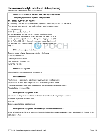 Karta charakterystyki substancji niebezpiecznej Data utworzenia / data aktualizacji: 2002-10-15 / 2008-06-01 1. Identyfikacja substancji / preparatu, identyfikacja przedsiębiorstwa Identyfikacja producenta, importera lub dystrybutora tri-Potasu cytrynian 1 hydrat Nr katalogowy: czda-740700113; cz-740700420; odp.Ph.Eur.-740700736; -740702720; -740704738; Przeznaczenie / zastosowanie: odczynnik analityczny lub chemikalia do syntez. POCH Spółka Akcyjna 44-101 Gliwice, ul. Sowińskiego 11 tel.: (032) 239-20-00; fax (032) 239-23-70; e-mail: [email protected] Osoby kontaktowe: Józef Deryło tel.: (032) 239-22-51, fax: (032) 239-21-15, e-mail: [email protected]; Mieczysław Węgrzyk tel.:(032) 239-24-73, fax: (032) 239-21-15, e-mail: [email protected] Tel. alarmowy: w dni robocze, w godz.: 7.00 - 15.00: +606-659-006 lub całą dobę: 112 2. Skład / informacja o składnikach Synonimy: potasu cytrynian III zasadowy, cytrynian trójpotasowy Numer CAS: 6100-056-6 Ciężar cząsteczkowy: 324,42 Wzór chemiczny: C6H5K3O7 · H2O Numer WE: 212-755-5 3. Identyfikacja zagrożeń Nie jest klasyfikowana jako substancja niebezpieczna. 4. Pierwsza pomoc Przy kontakcie z oczami: płukać dużą ilością wody przy szeroko otwartej powiece. Przy kontakcie ze skórą: zmyć dużą ilością wody, zdjąć zanieczyszczoną odzież. Przy spożyciu znacznych ilości: jeżeli poszkodowany poczuje się niezdrowo wezwać lekarza. Przy wdychaniu: świeże powietrze. 5. Postępowanie w przypadku pożaru Odpowiednie środki gaśnicze: w zależności od materiałów składowanych w najbliższym sąsiedztwie. Szczególne zagrożenia: substancja palna. Inne: brak. Stosować specjalistyczną odzież ochronną 6. Postępowanie w przypadku niezamierzonego uwolnienia do środowiska Unikać wdychania pyłu. Zebrać na sucho. Przekazać do likwidacji. Oczyścić zanieczyszczony teren. Nie dopuścić do dostania się do wód, ścieków i gleby. POCH S.A. Karta charakterystyki substancji niebezpiecznej. Strona 1/4 tri-Potasu cytrynian 1 hydrat 7. Postępowanie z substancją / preparatem i jej / jego magazynowanie Obchodzenie się z substancją: Zapewnić skuteczną wymianę powietrza (wentylacja). Postępować zgodnie z zasadami dobrej praktyki przemysłowej oraz ogólnymi zasadami bezpieczeństwa i higieny pracy z substancjami chemicznymi. Stosować środki ochrony osobistej zgodnie z pkt.8. Nie opróżniać do kanalizacji. Magazynowanie: szczelne opakowania, suche pomieszczenie. Temperatura pokojowa (zalecana +15 do +25°C). 8. Kontrola narażenia i środki ochrony indywidualnej Paramerty kontroli (NDS, NDSCh, NDSP): nie ustalone. Dz.U. nr 217, Rozporządzenie z dnia 29 listopada 2002 (poz.1833) Środki ochrony indywidualnej: ochrona dróg oddechowych: konieczna gdy tworzą się pyły - respirator ochrona oczu: konieczna - okulary ochronne typu gogle ochrona rąk: konieczna - rękawice ochronne odporne na działanie chemikaliów wykonane z gumy nitrylowej lub inne dopuszczone przez producenta rękawic do kontaktu z tym produktem. Czas wytrzymałości materiału określa producent rękawic. ochrona ciała: konieczna - ubranie ochronne środki ochronne i higieny: zmienić zanieczyszczone ubranie. Wymyć ręce po pracy z tą substancją. 9. Właściwości fizyczne i chemiczne Forma: ciało stałe Kolor: biały Zapach: bez zapachu pH: 7,5 - 9,0 (50 g/l H2O, 20°C) Temperatura topnienia: >180°C (rozkład) Temperatura wrzenia: nie dotyczy Temperatura samozapłonu: brak danych Temperatura zapłonu: brak danych Granice wybuchowości: nie dotyczy dolna: górna: lepkość dynamiczna: lepkość kinematyczna: Ciśnienie par: brak danych Gęstość: 1,98 g/cm3 (20°C) Ciężar nasypowy: ~ 950 kg/m3 Rozpuszczalność: w wodzie: 640 g/l (25°C) w rozpuszczalnikach organicznych: brak danych POCH S.A. Karta charakterystyki substancji niebezpiecznej. Strona 2/4 tri-Potasu cytrynian 1 hydrat 10. Stabilność i reaktywność Warunki których należy unikać: Materiały których należy unikać: silne utleniacze Niebezpieczne produkty rozkładu: Następne dane: 11. Informacje toksykologiczne Informacje toksykologiczne: dostępne dane wskazują że substancja nie stanowi zagrożenia toksycznego w warunkach przemysłowych. LDL0 (i.p. pies): 167 mg/kg. LD50(doustnie, szczur): 7200 mg/kg. Pozostałe dane: substancja używana terapeutycznie. 12. Informacje ekologiczne Nie stanowi zagrożenia ekologicznego. 13. Postępowanie z odpadami POCH S.A. przyjmuje do likwidacji substancje chemiczne zakupione w POCH S.A. oraz opakowania po tych substancjach. Dostawy substancji i opakowań należy każdorazowo uzgadniać z POCH S.A. Utylizacją odpadów powinny zająć się wyspecjalizowane firmy. Opakowanie jenorazowego użytku traktować jak odpad i przekazać odbiorcy odpadów. Sposób likwidacji zebranych odpadów uzgodnić z właściwym terenowo wydziałem ochrony środowiska. Ustawy z dnia 27.04.2001 (Dz.U. nr 62, poz. 628), z dnia 11.05.2001 (Dz.U. nr 63 poz. 638). Rozporządzenie z dnia 27.09.2001 (Dz.U. nr 112, poz. 1206) 14. Informacje o transporcie RID/ADR: nie jest przedmiotem przepisów transportowych Numer UN: nie dotyczy Nazwa materiału (wg UN): nie dotyczy POCH S.A. Karta charakterystyki substancji niebezpiecznej. Strona 3/4 tri-Potasu cytrynian 1 hydrat 15. Informacje dotyczące przepisów prawnych Symbol i oznaczenie zagrożenia produktu: nie dotyczy; . R: nie dotyczy; . S: nie dotyczy; . Dz.U. nr 171, Rozporządzenie z dnia 2 września 2003 (poz. 1666) Dz.U. nr 173, Rozporządzenie z dnia 2 września 2003 (poz. 1679) Dz.U. nr 199, Rozporządzenie z dnia 2 września 2003 (poz. 1948) Dz.U. nr 169, Obwieszczenie z dnia 28 sierpnia 2003 (poz. 1650) Dz.U. nr 168, Rozporządzenie z dnia 5 lipca 2004 (poz. 1762) Dz.U. nr 2, Rozporządzenie z dnia 14 grudnia 2004 (poz. 8) 16. Inne informacje Niniejsza karta stanowi własność Avantor Performance Materials Poland S.A. z Gliwic i charakteryzuje wyłącznie produkty oznakowane na etykiecie znakiem i n