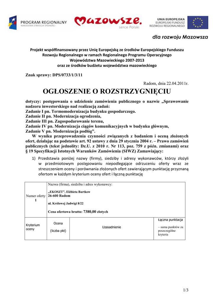 Projekt współfinansowany przez Unię Europejską ze środków Europejskiego Funduszu Rozwoju Regionalnego w ramach Regionalnego Programu Operacyjnego Województwa Mazowieckiego 2007-2013 oraz ze środków budżetu województwa mazowieckiego Znak sprawy: DPS/0733/1/3/11 Radom, dnia 22.04.2011r. OGŁOSZENIE O ROZSTRZYGNIĘCIU dotyczy: postępowania o udzielenie zamówienia publicznego o nazwie „Sprawowanie nadzoru inwestorskiego nad realizacją zadań: Zadanie I pn. Termomodernizacja budynku gospodarczego. Zadanie II pn. Modernizacja ogrodzenia, Zadanie III pn. Zagospodarowanie terenu, Zadanie IV pn. Modernizacja ciągów komunikacyjnych w budynku głównym, Zadanie V pn. Modernizacja podłóg”. W wyniku przeprowadzenia czynności związanych z badaniem i oceną złożonych ofert, działając na podstawie art. 92 ustawy z dnia 29 stycznia 2004 r. – Prawo zamówień publicznych (tekst jednolity: Dz.U. z 2010 r. Nr 113, poz. 759 z późn. zmianami) oraz § 19 Specyfikacji Istotnych Warunków Zamówienia (SIWZ) Zamawiający: 1) Przedstawia poniżej nazwy (firmy), siedziby i adresy wykonawców, którzy złożyli w przedmiotowym postępowaniu niepodlegające odrzuceniu oferty wraz ze streszczeniem oceny i porównania złożonych ofert zawierającym punktację przyznaną ofertom w każdym kryterium oceny ofert i łączną punktację Nazwa (firma), siedziba i adres wykonawcy: „EKOSZT”, Elżbieta Bartkow Numer oferty 26-600 Radom 1 ul. Królowej Jadwigi 8/22 Cena ofertowa brutto: 7380,00 złotych Łączna punktacja Kryterium oceny Ocena Uzasadnienie (liczba pkt) – suma punktów za poszczególne kryteria 1/3 Projekt współfinansowany przez Unię Europejską ze środków Europejskiego Funduszu Rozwoju Regionalnego w ramach Regionalnego Programu Operacyjnego Województwa Mazowieckiego 2007-2013 oraz ze środków budżetu województwa mazowieckiego Znak sprawy: DPS/0733/1/3/11 Ocena ceny oferty przeprowadzona na podstawie wzoru matematycznego, określonego w § 18 pkt 2 ppkt 2.1. SIWZ: P(Ci) = Cmin / Ci x 100 pkt gdzie: Cena ofertowa 74,00 pkt Cmin – najniższa cena spośród wszystkich ważnych ofert i nie odrzuconych 74,00 pkt Ci – ceny poszczególnych ofert P(Ci) – liczba punktów za kryterium ceny P(Ci)= 5461,20 /7380,00x 100 pkt = 74,00 pkt Nazwa (firma), siedziba i adres wykonawcy: Numer oferty 2 ARPO Arkadiusz Postek 05-400 Otwock, ul. Reymonta 71D/15 Cena ofertowa brutto: 36531,00 złotych Łączna punktacja Kryterium oceny Ocena Uzasadnienie (liczba pkt) – suma punktów za poszczególne kryteria Ocena ceny oferty przeprowadzona na podstawie wzoru matematycznego, określonego w § 18 pkt 2 ppkt 2.1. SIWZ: P(Ci) = Cmin / Ci x 100 pkt gdzie: Cena ofertowa 14,95 pkt Cmin – najniższa cena spośród wszystkich ważnych ofert i nie odrzuconych 14,95 pkt Ci – ceny poszczególnych ofert P(Ci) – liczba punktów za kryterium ceny P(Ci)= 5461,20 /36531,00 x 100 pkt = 14,95 pkt 2/3 Projekt współfinansowany przez Unię Europejską ze środków Europejskiego Funduszu Rozwoju Regionalnego w ramach Regionalnego Programu Operacyjnego Województwa Mazowieckiego 2007-2013 oraz ze środków budżetu województwa mazowieckiego Znak sprawy: DPS/0733/1/3/11 Nazwa (firma), siedziba i adres wykonawcy: Janusz Białek Numer oferty 3 26-600 Radom, ul. Piastowska 13/16 Cena ofertowa brutto: 5461,20 złotych Łączna punktacja Kryterium oceny Ocena Uzasadnienie – suma punktów za poszczególne kryteria (liczba pkt) Ocena ceny oferty przeprowadzona na podstawie wzoru matematycznego, określonego w § 18 pkt 2 ppkt 2.1. SIWZ: P(Ci) = Cmin / Ci x 100 pkt Cena ofertowa gdzie: 100 pkt Cmin – najniższa cena spośród wszystkich ważnych ofert i nie odrzuconych 100 pkt Ci – ceny poszczególnych ofert P(Ci) – liczba punktów za kryterium ceny P(Ci)= 5461,20/5461,20 x 100 pkt = 100 pkt 2) Informuje, że dokonał, w oparciu o kryteria oceny ofert opisane w § 18 SIWZ (cena – maks. 100 pkt), wyboru najkorzystniejszej oferty. Jako najkorzystniejsza uznana została oferta nr 3, złożona przez Wykonawcę: Janusz Białek, 26-600 Radom, ul. Piastowska 13/16 (cena ofertowa brutto: 5461,20 złotych), ponieważ spośród niepodlegających odrzuceniu ofert - w toku oceny uzyskała najwyższą liczbę punktów (100 pkt za kryterium ceny). Zaoferowana cena nie przekracza kwoty, którą Zamawiający może przeznaczyć na sfinansowanie zamówienia. 3) Informuję, iż umowa w sprawie zamówienia publicznego zostanie zawarta niezwłocznie po przekazaniu niniejszego zawiadomienia wszystkim wykonawcom (z postępowania nie wykluczono żadnego wykonawcy oraz nie odrzucono żadnej oferty). Dyrektor Domu Pomocy Społecznej im. Św. Kazimierza w Radomiu Róża Nowak 3/3