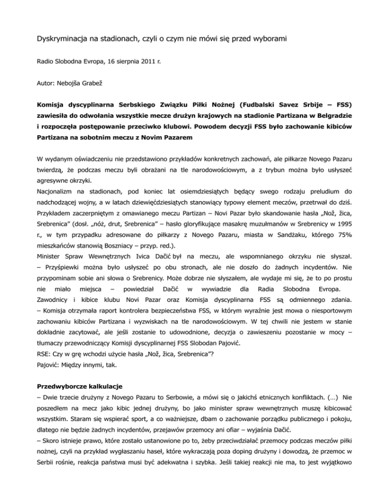 Dyskryminacja na stadionach, czyli o czym nie mówi się przed wyborami Radio Slobodna Evropa, 16 sierpnia 2011 r. Autor: Nebojša Grabež Komisja dyscyplinarna Serbskiego Związku Piłki Nożnej (Fudbalski Savez Srbije – FSS) zawiesiła do odwołania wszystkie mecze drużyn krajowych na stadionie Partizana w Belgradzie i rozpoczęła postępowanie przeciwko klubowi. Powodem decyzji FSS było zachowanie kibiców Partizana na sobotnim meczu z Novim Pazarem W wydanym oświadczeniu nie przedstawiono przykładów konkretnych zachowań, ale piłkarze Novego Pazaru twierdzą, że podczas meczu byli obrażani na tle narodowościowym, a z trybun można było usłyszeć agresywne okrzyki. Nacjonalizm na stadionach, pod koniec lat osiemdziesiątych będący swego rodzaju preludium do nadchodzącej wojny, a w latach dziewięćdziesiątych stanowiący typowy element meczów, przetrwał do dziś. Przykładem zaczerpniętym z omawianego meczu Partizan – Novi Pazar było skandowanie hasła „Nož, žica, Srebrenica” (dosł. „nóż, drut, Srebrenica” – hasło gloryfikujące masakrę muzułmanów w Srebrenicy w 1995 r., w tym przypadku adresowane do piłkarzy z Novego Pazaru, miasta w Sandżaku, którego 75% mieszkańców stanowią Boszniacy – przyp. red.). Minister Spraw Wewnętrznych Ivica Dačić był na meczu, ale wspomnianego okrzyku nie słyszał. – Przyśpiewki można było usłyszeć po obu stronach, ale nie doszło do żadnych incydentów. Nie przypominam sobie ani słowa o Srebrenicy. Może dobrze nie słyszałem, ale wydaje mi się, że to po prostu nie miało miejsca – powiedział Dačić w wywiadzie dla Radia Slobodna Evropa. Zawodnicy i kibice klubu Novi Pazar oraz Komisja dyscyplinarna FSS są odmiennego zdania. – Komisja otrzymała raport kontrolera bezpieczeństwa FSS, w którym wyraźnie jest mowa o niesportowym zachowaniu kibiców Partizana i wyzwiskach na tle narodowościowym. W tej chwili nie jestem w stanie dokładnie zacytować, ale jeśli zostanie to udowodnione, decyzja o zawieszeniu pozostanie w mocy – tłumaczy przewodniczący Komisji dyscyplinarnej FSS Slobodan Pajović. RSE: Czy w grę wchodzi użycie hasła „Nož, žica, Srebrenica”? Pajović: Między innymi, tak. Przedwyborcze kalkulacje – Dwie trzecie drużyny z Novego Pazaru to Serbowie, a mówi się o jakichś etnicznych konfliktach. (…) Nie poszedłem na mecz jako kibic jednej drużyny, bo jako minister spraw wewnętrznych muszę kibicować wszystkim. Staram się wspierać sport, a co ważniejsze, dbam o zachowanie porządku publicznego i pokoju, dlatego nie będzie żadnych incydentów, przejawów przemocy ani ofiar – wyjaśnia Dačić. – Skoro istnieje prawo, które zostało ustanowione po to, żeby przeciwdziałać przemocy podczas meczów piłki nożnej, czyli na przykład wygłaszaniu haseł, które wykraczają poza doping drużyny i dowodzą, że przemoc w Serbii rośnie, reakcja państwa musi być adekwatna i szybka. Jeśli takiej reakcji nie ma, to jest wyjątkowo jasne przesłanie, że rząd nie chce korzystać z tych mechanizmów albo zajmowanie się takimi wykroczeniami w danym momencie jest politycznie niekorzystne. To jest druzgoczące – mówi Milan Antonijević, członek YUCOM, organizacji zrzeszającej prawników działających na rzecz praw człowieka. Według Antonijevicia w okresie przedwyborczym politycy bardzo ostrożnie kalkulują, w jaki sposób obchodzić się z radykalnymi chuliganami i ich przeciwnikami. Najchętniej nie poruszają tego typu problemów, co oznacza, że dyskryminacja na stadionach pozostaje zmartwieniem organizacji zajmujących się prawami człowieka. Tłum. i red. Marta Szymankiewicz