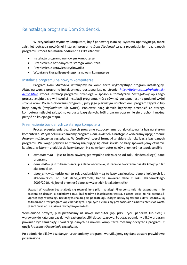 Reinstalacja programu Dom Studencki. W przypadkach wymiany komputera, bądź ponownej instalacji systemu operacyjnego, może zaistnieć potrzeba powtórnej instalacji programu Dom Studencki wraz z przeniesieniem baz danych programu. Proces ten można podzielić na kilka etapów: Instalacja programu na nowym komputerze Przeniesienie baz danych ze starego komputera Przeniesienie ustawień użytkownika Wczytanie klucza licencyjnego na nowym komputerze Instalacja programu na nowym komputerze Program Dom Studencki instalujemy na komputerze wykorzystując program instalacyjny. Aktualna wersja programu instalacyjnego dostępna jest na stronie: http://datum.com.pl/akademikdemo.html. Proces instalacji programu przebiega w sposób automatyczny. Szczegółowy opis tego procesu znajduje się w instrukcji instalacji programu, która również dostępna jest na podanej wyżej stronie www. Po zainstalowaniu programu, przy jego pierwszym uruchomieniu program zapyta o typ bazy danych (Przykładowa lub Nowa). Ponieważ bazę danych będziemy przenosić ze starego komputera najlepiej założyć nową pustą bazę danych. Jeśli program poprawnie się uruchomi można przejść do kolejnego etapu. Przeniesienie baz danych ze starego komputera Proces przeniesienia baz danych programu rozpoczynamy od zlokalizowania baz na starym komputerze. W tym celu uruchamiamy program Dom Studencki a następnie wybieramy opcję z menu: Program->Ustawienia techniczne. W środkowej części formatki znajduje się lokalizacja baz danych programu. Wciskając przycisk ze strzałką znajdujący się obok ścieżki do bazy spowodujemy otwarcie katalogu, w którym znajdują się bazy danych. Na nowy komputer należy przenieść następujące pliki: common.mdb – jest to baza zawierająca wspólne (niezależne od roku akademickiego) dane programu dane.mdb – jest to baza zwierająca dane wzorcowe, służące do tworzenie baz dla kolejnych lat akademickich dane_rrrr.mdb (gdzie rrrr to rok akademicki) – są to bazy zawierające dane z kolejnych lat akademickich, np. plik dane_2009.mdb, będzie zawierał dane z roku akademickiego 2009/2010. Najlepiej przenieść dane ze wszystkich lat akademickich. Uwaga! W katalogu baz znajduję się również inne pliki i katalogi. Pliku const.mdb nie przenosimy - nie zawiera on danych, a dodatkowo musi być zgodny z instalowaną wersją, dlatego lepiej go nie przenosić. Oprócz tego w katalogu baz danych znajdują się podkatalogi, których nazwy są złożone z daty i godziny. Są to tworzone przez program kopie baz danych. Kopii tych nie musimy przenosić, ale dla bezpieczeństwa warto je zachować np. na jakimś zewnętrznym nośniku. Wymienione powyżej pliki przenosimy na nowy komputer (np. przy użyciu pendriva lub sieci) i wgrywany do katalogu baz danych zastępując pliki dotychczasowe. Podczas podmiany plików program powinien być zamknięty. Lokalizację danych na nowym komputerze możemy odczytać z programu z opcji: Program->Ustawienia techniczne. Po podmianie plików baz danych uruchamiamy program i weryfikujemy czy dane zostały prawidłowo przeniesione. Przeniesienie ustawień użytkownika Kilka ustawień programu (ustawienia związane ze stanowiskiem) nie są przechowywane w bazie danych. Są to ustawienia dostępne w opcji Konfiguracja->Ustawienia programu. Najprościej jest porównać i ewentualnie ręcznie skorygować te ustawienia porównując wartości na starym i nowym komputerze. Wczytanie klucza licencyjnego na nowym komputerze Instalując program bezpośrednio z internetu nie zawiera on klucza licencyjnego (pracuje w wersji demo). Plik z licencją można znaleźć na starym komputerze korzystając z opcji Program>Ustawienia techniczne i wciskając strzałkę obok ścieżki do ustawień programu (trzecie pole na formatce). Plik z licencją nazywa się config.dat i należy go przenieść na nowy komputer (np. przy użyciu pendriva lub sieci) Klucz licencyjny należy wczytać na nowym komputerze używając opcji z menu: Program->Informacje o rejestracji, następnie wcisnąć przycisk Wczytaj z pliku, wskazać na plik z kluczem licencyjnym i zapisać zmiany. Po ponownym uruchomieniu programu, program powinien działać już w pełnej wersji (zniknie napis: wersja demonstracyjna)