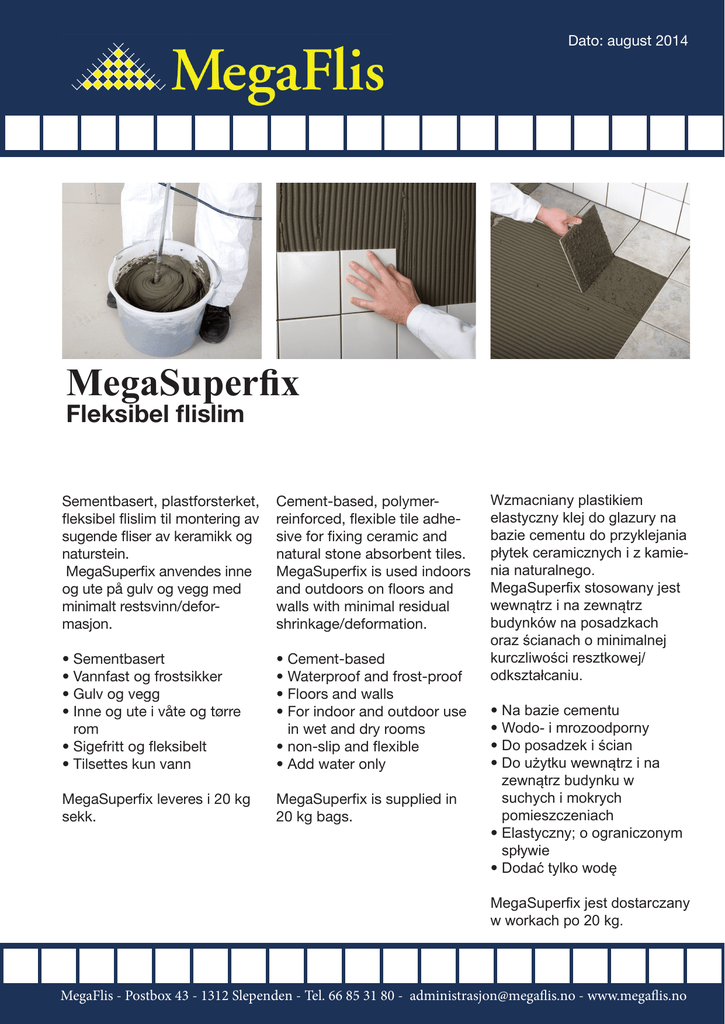 Dato: august 2014 MegaSuperfix Fleksibel flislim Sementbasert, plastforsterket, fleksibel flislim til montering av sugende fliser av keramikk og naturstein. MegaSuperfix anvendes inne og ute på gulv og vegg med minimalt restsvinn/deformasjon. Cement-based, polymerreinforced, flexible tile adhesive for fixing ceramic and natural stone absorbent tiles. MegaSuperfix is used indoors and outdoors on floors and walls with minimal residual shrinkage/deformation. • Sementbasert • Vannfast og frostsikker • Gulv og vegg • Inne og ute i våte og tørre rom • Sigefritt og fleksibelt • Tilsettes kun vann • Cement-based • Waterproof and frost-proof • Floors and walls • For indoor and outdoor use in wet and dry rooms • non-slip and flexible • Add water only MegaSuperfix leveres i 20 kg sekk. MegaSuperfix is supplied in 20 kg bags. Wzmacniany plastikiem elastyczny klej do glazury na bazie cementu do przyklejania płytek ceramicznych i z kamienia naturalnego. MegaSuperfix stosowany jest wewnątrz i na zewnątrz budynków na posadzkach oraz ścianach o minimalnej kurczliwości resztkowej/ odkształcaniu. •N a bazie cementu •W odo- i mrozoodporny •D o posadzek i ścian •D o użytku wewnątrz i na zewnątrz budynku w suchych i mokrych pomieszczeniach •E lastyczny; o ograniczonym spływie •D odać tylko wodę MegaSuperfix jest dostarczany w workach po 20 kg. MegaFlis - Postbox 43 - 1312 Slependen - Tel. 66 85 31 80 - [email protected] - www.megaflis.no Dato: august 2014 MegaSuperfix MegaSuperfix MegaSuperfix Basert på kjemisk sement. Plastforsterket, hurtigherdende, vannfast og frostsikker flislim. BRUKSOMRÅDE Til montering av keramiske fliser, klinker og naturstein med vannopp tak over 0,5%, inne og ute, i både våte og tørre områder. UNDERLAGSTYPER MegaSuperfix kan brukes på stabile gulv og vegger med minimale spenninger/deformasjoner som f.eks. pusset murverk, blokkmurverk gipspuss/-sparkel og gipsplater samt betongelementer og lettbetongelementer med minimalt restsvinn, bevegelse og deformasjon. UTFØRELSE MegaSuperfix anvendes iht. anvisningene på emballasjen. BLANDING 20 kg MegaSuperfix pulver blandes med 5,2–6,0 liter rent vann til en klumpfri masse som er klar til bruk. Bruk visp på drill. Sørg for at både pulver og vann er temperert. Limet kan brukes i ca. 6 timer etter blanding. Påfør ikke lim på større arealer enn at flisene kan monteres før limlaget danner “hinne”. For øvrigt henvises det til sikkerhetsblad. LAGRING OG TRANSPORT Oppbevares og transporteres tørt. Produktet overholder de tekniske spesifikasjonene minimum 12 måneder fra produksjonsdato i ubrutt emballasje. Kan benyttes lenger, men de tekniske egenskaper kan endres f.eks. med en utvidet herdetid. Based on chemical cement. Polymer-reinforced, quick-setting, waterproof and frost-proof tile adhesive. AREAS OF USE For fixing ceramic tiles, clinker tiles and natural stone with water absorbency greater than 0.5%, indoors and outdoors, in both wet and dry areas. TYPES OF SUBSTRATES MegaSuperfix can be used on stable floors and walls with minimal tension/deformation such as plastered walls, block masonry, gypsum based render/plaster and gypsum boards as well as concrete elements and light concrete elements with minimal residual shrinkage, movement and deformation. METHOD MegaSuperfix is used according to the instructions on the packaging. MIXING 20 kg of MegaSuperfix powder is mixed with 5.2–6.0 litres of clean water to a lump-free mortar and the mixture is ready for use. Use a mixer on a drill. Ensure that both powder and water are tempered. Adhesive can be used for approx. 6 hours after mixing. Do not apply adhesive to areas that are so large that the tiles cannot be fixed before the layer of glue forms a ”skin”. Please also refer to the safety data sheet. STORAGE AND TRANSPORT Store and transport dry. The product complies with the technical specifications for a minimum of 12 months from the production date in sealed packaging. May be used for longer, but the technical properties may change, for example with extended hardening time. Skład chemiczny mieszaniny oparty na cemencie. Wzmocniony plastikiem, szybko zastygający, wodoodporny i mrozoodporny klej do glazury. TEKNISKE DATA Densitet: 1450 kg/m3 Produktegenskaper jf. EN 12004: C2T Brukstid: ca. 6 timer Tørketid v/18°C til fuging/ lett gangtrafikk: 10–18 timer Belastningsklar (full): 7 døgn Anbefalt arbeidstemperatur: 10–25 °C Forbruk vegg (gjennomsnitt): 2,5 kg/m2 Forbruk gulv (gjennomsnitt): 3,5 kg/m2 TECHNICAL DATA Density: 1450 kg/m3 Product properties cf. EN 12004: C2T Application time: approx. 6 hours Drying time at 18 °C for grouting/light foot traffic: 1 0–18 hours Load-ready (full): 7 days Recommended working temperature: 10–25 °C Consumption – wall (average): 2.5 kg/m2 Consumption – floor (average): 3.5 kg/m2 DANE TECHNICZNE Gęstość: 1450 kg/m3 Właściwości produktu zob. EN 12004: C2T Czas użycia: około 6 godzin Czas schnięcia przy 18 °C – do fugowania / lekkiego ruchu pieszego: 10–18 godz. Pełna wytrzymałość: po 7 dniach Zalecana temperatura zastosowania: 10–25 °C Zużycie – ściana (średnio): 2,5 kg/m2 Zużycie – posadzka (średnio): 3,5 kg/m2 OBSZARY ZASTOSOWANIA Do przyklejania płytek ceramicznych, klinkieru i kamienia naturalnego o absorpcji wody większej niż 0,5%, do użytku wewnątrz i na zewnątrz budynku, zarówno w suchych, jak i mokrych pomieszczeniach. RODZAJ POWIERZCHNI MegaSuperfix można użyć na stabilnych posadzkach i ścianach o minimalnych naprężeniach/odkształceniach, np. ścianach polerowanych, blokach kamiennych, wypolerowanym/szpachlowanym gipsie oraz płytach gipsowych, a także konstrukcjach z betonu i lekkiego betonu o minimalnej kurczliwości resztkowej, ruchach i odkształceniach. METODA MegaSuperfix należy stosować zgodnie z instrukcją na opakowaniu. MIESZANIE 20 kg proszku MegaSuperfix wymieszać z 5,2–6,0 litra czystej wody, 