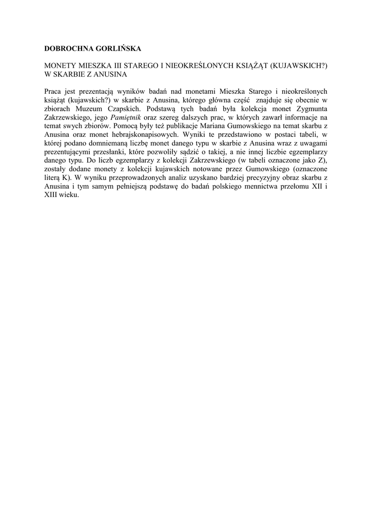DOBROCHNA GORLIŃSKA MONETY MIESZKA III STAREGO I NIEOKREŚLONYCH KSIĄŻĄT (KUJAWSKICH?) W SKARBIE Z ANUSINA Praca jest prezentacją wyników badań nad monetami Mieszka Starego i nieokreślonych książąt (kujawskich?) w skarbie z Anusina, którego główna część znajduje się obecnie w zbiorach Muzeum Czapskich. Podstawą tych badań była kolekcja monet Zygmunta Zakrzewskiego, jego Pamiętnik oraz szereg dalszych prac, w których zawarł informacje na temat swych zbiorów. Pomocą były też publikacje Mariana Gumowskiego na temat skarbu z Anusina oraz monet hebrajskonapisowych. Wyniki te przedstawiono w postaci tabeli, w której podano domniemaną liczbę monet danego typu w skarbie z Anusina wraz z uwagami prezentującymi przesłanki, które pozwoliły sądzić o takiej, a nie innej liczbie egzemplarzy danego typu. Do liczb egzemplarzy z kolekcji Zakrzewskiego (w tabeli oznaczone jako Z), zostały dodane monety z kolekcji kujawskich notowane przez Gumowskiego (oznaczone literą K). W wyniku przeprowadzonych analiz uzyskano bardziej precyzyjny obraz skarbu z Anusina i tym samym pełniejszą podstawę do badań polskiego mennictwa przełomu XII i XIII wieku.