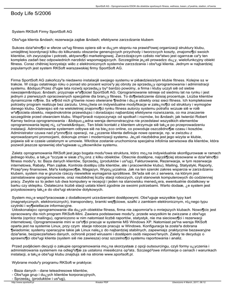 SportSoft AG - Oprogramowanie ESOK dla obiektów sportowych fitness, wellness, basen, p³ywalnia, stadion, si³ownia Body Life 5/2006 System RKSoft Firmy SportSoft AG Obs³uga klienta – rezerwacja zajêæ – efektywne zarz±dzanie klubem Sukces dzia³alno¶ci w sferze us³ug fitness opiera siê w du¿ym stopniu na prawid³owej organizacji struktury klubu, umiejêtnej koordynacji kilku do kilkunastu obszarów generuj±cych przychody i tworz±cych koszty, znajomo¶ci swoich klientów, ich zwyczajów i potrzeb, aktywno¶ci marketingowej. Zarz±dzaj±cym czêsto nie³atwo jest ogarn±æ ca³y ten kompleks zadañ bez odpowiednich narzêdzi wspomagaj±cych. Szczególnie je¿eli prowadz± du¿y, wielofunkcyjny obiekt fitness. Coraz chêtniej korzystaj± wiêc z elektronicznych systemów zarz±dzania i obs³ugi klienta. Jednym w najbardziej popularnych jest system RKSoft warszawskiej firmy SportSoft AG. Firma SportSoft AG zakoñczy³a niedawno instalacjê swojego systemu w piêædziesi±tym klubie fitness. Kolejne s± w trakcie. W ci±gu ostatniego roku o ponad sto procent wzros³y jej obroty ze sprzeda¿y oprogramowania i administracji systemu. „Przez d³ugie lata rozwój sprzeda¿y by³ bardzo powolny, a firma i kluby uczyli siê od siebie nawzajem” – przyznaje w³a¶ciciel SportSoft AG. Oprogramowanie istnieje od siedmiu lat na rynku i jest jednym z pierwszych opracowanych specjalnie dla bran¿y fitness. To do¶wiadczenie dzisiaj procentuje. Liczba klientów dynamicznie ro¶nie. S± w¶ród nich g³ównie nowo otwierane ¶rednie i du¿e obiekty oraz sieci fitness. Ich kompleksowe potrzeby program realizuje bez zarzutu. Umo¿liwia on indywidualne modyfikacje w zale¿no¶ci od struktury i wymogów danego klubu. Opieraj±c siê na wieloletniej znajomo¶ci rynku fitness autorzy systemu potrafi± wczuæ siê w rolê w³a¶ciciela obiektu, niejednokrotnie przewiduj±c i doradzaj±c najbardziej efektywne rozwi±zania, co ma znaczenie szczególnie przed otwarciem klubu. Wspó³pracê rozpoczynaj± od spotkañ i rozmów, bo – jak twierdzi Robert Karney twórca oprogramowania - „¿adna wersja demonstracyjna nie przedstawi wszystkich elementów oprogramowania lepiej ni¿ cz³owiek”. Ten bliski kontakt z klientem utrzymuje siê tak¿e po przeprowadzeniu instalacji. Administrowanie systemem odbywa siê na bie¿±co online, co powoduje oszczêdno¶æ czasu i kosztów. Administrator czuwa nad p³ynno¶ci± operacji, na ¿yczenie klienta definiuje nowe operacje, np. w zwi±zku z wprowadzanymi promocjami, dokonuje zmian i modernizacji systemu. Je¿eli niezbêdna jest jego wizyta w klubie, pojawia siê w czasie ustalonym w umowie. Wkrótce zostanie uruchomiona specjalna infolinia serwisowa dla klientów, która pozwoli jeszcze sprawniej obs³ugiwaæ u¿ytkowników systemu. Zalet± oprogramowania RKSoft jest jego bogata modu³owa struktura, któr± mo¿na indywidualnie skonfigurowaæ w ramach jednego klubu, a tak¿e ³±czyæ w sieæ z³o¿on± z kilku obiektów. Obecnie dostêpne, najczê¶ciej stosowane w dzia³alno¶ci fitness modu³y, to: Baza danych klientów, Sprzeda¿ (produktów i us³ug), Fakturowanie, Rezerwacja, w tym rezerwacja internetowa, Rabaty, Plan zajêæ, Kontrola dostêpu (dla klientów, ale i pracowników klubu), Mailing, Statystyki, Raporty, Przep³ywy finansowe, Ma³a ksiêgowo¶æ, Magazyn, Wypo¿yczalnia. Jak na ten szeroki zakres wsparcia w zarz±dzaniu klubem, system ma w gruncie rzeczy niewielkie wymagania sprzêtowe. Sk³ada siê on z serwera, na którym jest zainstalowane oprogramowanie, oraz niezbêdnej liczby stacji roboczych, czyli stanowisk komputerowych do codziennej pracy. Zwykle s± to jeden lub dwa komputery w recepcji i jeden na stanowisku mened¿era, ewentualnie dodatkowy w barku czy sklepiku. Ostateczn± liczbê stacji ustala klient zgodnie ze swoimi potrzebami. Warto dodaæ, ¿e system jest przystosowany tak¿e do obs³ugi ekranów dotykowych. System mo¿e wspó³pracowaæ z dodatkowymi urz±dzeniami dostêpowymi. Obs³uguje wszystkie typy kart (magnetycznych, elektronicznych), transpondery, bramki wej¶ciowe, szafki z zamkiem elektronicznym, ró¿nego typu czytniki i wy¶wietlacze informacyjne. Udoskonalaj±c oprogramowanie dla du¿ych obiektów fitness, firma nie zapomnia³a o mniejszych klubach. Nowo¶ci± jest opracowany dla nich program RKSoft-Mini. Zawiera podstawowe modu³y, przede wszystkim te zwi±zane z obs³ug± klienta (oprócz mailingu), ograniczono w nim natomiast liczbê raportów, statystyk, nie ma sieciowo¶ci i rezerwacji internetowej. Oprogramowanie mini w ca³o¶ci pracuje w systemie MS Windows XP. Natomiast pe³na wersja RKSoft oparta jest na systemie Linux, przy czym stacje robocze pracuj± w Windows. Konfiguracja ta zosta³a dobrana ¶wiadomie; systemy operacyjne takie jak Linux nale¿± do najbardziej stabilnych, zapewniaj± praktycznie bezawaryjne dzia³anie, bezpieczeñstwo danych, ochronê przed wirusami i dostêpem osób niepowo³anych. Zalety te decyduj± o sprawno¶ci obs³ugi klienta (system siê nie zawiesza) oraz szczelno¶ci systemu raportowania i analiz. Przed podjêciem decyzji o zakupie oprogramowania mo¿na skorzystaæ z opcji outsourcingu, czyli formy u¿yczenia i administrowania systemem na odleg³o¶æ za ustalon± miesiêczn± op³at±. Szczegó³owe informacje o cenach i warunkach instalacji, a tak¿e obs³ugi klubu znajduj± siê na stronie www.sportsoft.pl. Wybrane modu³y programu RKSoft w praktyce: - Baza danych - dane teleadresowe klientów, - Obs³uga grup i du¿ych klientów korporacyjnych, - Sprzeda¿ (produktów i us³ug), http://www.sportsoft.pl Kreator PDF Utworzono 4 March, 2017, 06:12 SportSoft AG - Oprogramowanie ESOK dla obiektów sportowych fitness, wellness, basen, p³ywalnia, stadion, si³ownia - Fakturowanie, - Rezerwacja, opcjonalnie równie¿ rezerwacja internetowa z mo¿liwo¶ci± rezerwacji wg. planu zajêæ, - Rabaty, - Plan zajêæ, - Kontrola dostêpu (dla klientów, ale i pracowników k