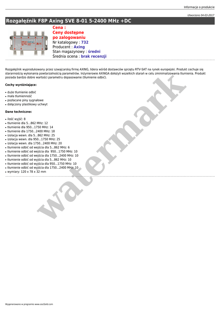 Informacje o produkcie Utworzono 04-03-2017 Rozgałęźnik F8P Axing SVE 8-01 5-2400 MHz +DC Cena : Ceny dostępne po zalogowaniu Nr katalogowy : 732 Producent : Axing Stan magazynowy : średni Średnia ocena : brak recenzji Rozgałęźnik wyprodukowany przez szwajcarską firmę AXING, lidera wśród dostawców sprzętu RTV-SAT na rynek europejski. Produkt cechuje się starannością wykonania powtarzalnością parametrów. Inżynierowie AXINGA dołożyli wszelkich starań w celu zminimalizowania tłumienia. Produkt posiada bardzo dobre wartości parametru dopasowanie (tłumienie odbić). ● ● ● ● duże tłumienie odbić mała tłumienność pozłacane piny sygnałowe dołączony plastikowy uchwyt Dane techniczne: ● ● ● ● ● ● ● ● ● ● ● ● ● ilość wyjść: 8 tłumienie dla 5...862 MHz: 12 tłumienie dla 950...1750 MHz: 14 tłumienie dla 1750...2400 MHz: 18 izolacja wewn. dla 5...862 MHz: 25 izolacja wewn. dla 950...1750 MHz: 25 izolacja wewn. dla 1750...2400 MHz: 20 tłumienie odbić od wejścia dla 5...862 MHz: 6 tłumienie odbić od wejścia dla 950...1750 MHz: 10 tłumienie odbić od wejścia dla 1750...2400 MHz: 10 tłumienie odbić od wyjścia dla 5...862 MHz: 10 tłumienie odbić od wyjścia dla 950...1750 MHz: 10 tłumienie odbić od wyjścia dla 1750...2400 MHz: 10 wymiary: 120 x 78 x 32 mm w at ● er m ar k Cechy wyróżniające: Wygenerowano w programie www.oscGold.com