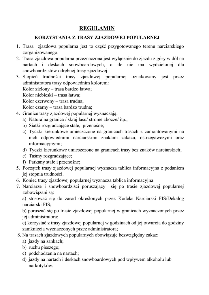 REGULAMIN KORZYSTANIA Z TRASY ZJAZDOWEJ POPULARNEJ 1. Trasa zjazdowa popularna jest to część przygotowanego terenu narciarskiego zorganizowanego. 2. Trasa zjazdowa popularna przeznaczona jest wyłącznie do zjazdu z góry w dół na nartach i deskach snowboardowych, o ile nie ma wydzielonej dla snowboardzistów odrębnej trasy zjazdowej. 3. Stopień trudności trasy zjazdowej popularnej oznakowany jest przez administratora trasy odpowiednim kolorem: Kolor zielony – trasa bardzo łatwa; Kolor niebieski – trasa łatwa; Kolor czerwony – trasa trudna; Kolor czarny – trasa bardzo trudna; 4. Granice trasy zjazdowej popularnej wyznaczają: a) Naturalna granica / skraj lasu/ strome zbocze/ itp.; b) Siatki rozgradzające stałe, przenośne; c) Tyczki kierunkowe umieszczone na granicach trasach z zamontowanymi na nich odpowiednimi narciarskimi znakami zakazu, ostrzegawczymi oraz informacyjnymi; d) Tyczki kierunkowe umieszczone na granicach trasy bez znaków narciarskich; e) Taśmy rozgradzające; f) Parkany stałe i przenośne; 5. Początek trasy zjazdowej popularnej wyznacza tablica informacyjna z podaniem jej stopnia trudności. 6. Koniec trasy zjazdowej popularnej wyznacza tablica informacyjna. 7. Narciarze i snowboardziści poruszający się po trasie zjazdowej popularnej zobowiązani są: a) stosować się do zasad określonych przez Kodeks Narciarski FIS/Dekalog narciarski FIS; b) poruszać się po trasie zjazdowej popularnej w granicach wyznaczonych przez jej administratora; c) korzystać z trasy zjazdowej popularnej w godzinach od jej otwarcia do godziny zamknięcia wyznaczonych przez administratora; 8. Na trasach zjazdowych popularnych obowiązuje bezwzględny zakaz: a) jazdy na sankach; b) ruchu pieszego; c) podchodzenia na nartach; d) jazdy na nartach i deskach snowboardowych pod wpływem alkoholu lub narkotyków; e) przejazdu lub przechodzenia przez trasy urządzeń wyciągowych; f) nauki jazdy oraz szkolenia narciarzy i snowboardzistów przez osoby, przedmioty nie posiadające odpowiednich kwalifikacji oraz bez wiedzy i zgody administratora tras zjazdowych; Nie stosowanie się do powyższego regulaminu będzie skutkowało usunięciem z terenu ośrodka oraz utratę uprawnień w kartach treningowych lub punktowych. ADMINISTRATOR TRASY ZJAZDOWEJ POPULARNEJ NIE BIERZE ODPOWIEDZIALNOŚCI ZA SKUTKI WYPADKÓW, KONTUZJI, URAZÓW NARCIARZY I SNOWBOARDZISTÓW POWSTAŁYCH W TRAKCIE KORZYSTANIA Z TEJ TRASY U OSÓB NIE STOSUJĄCYCH SIĘ DO ZASAD POWYŻSZEGO REGULAMINU.