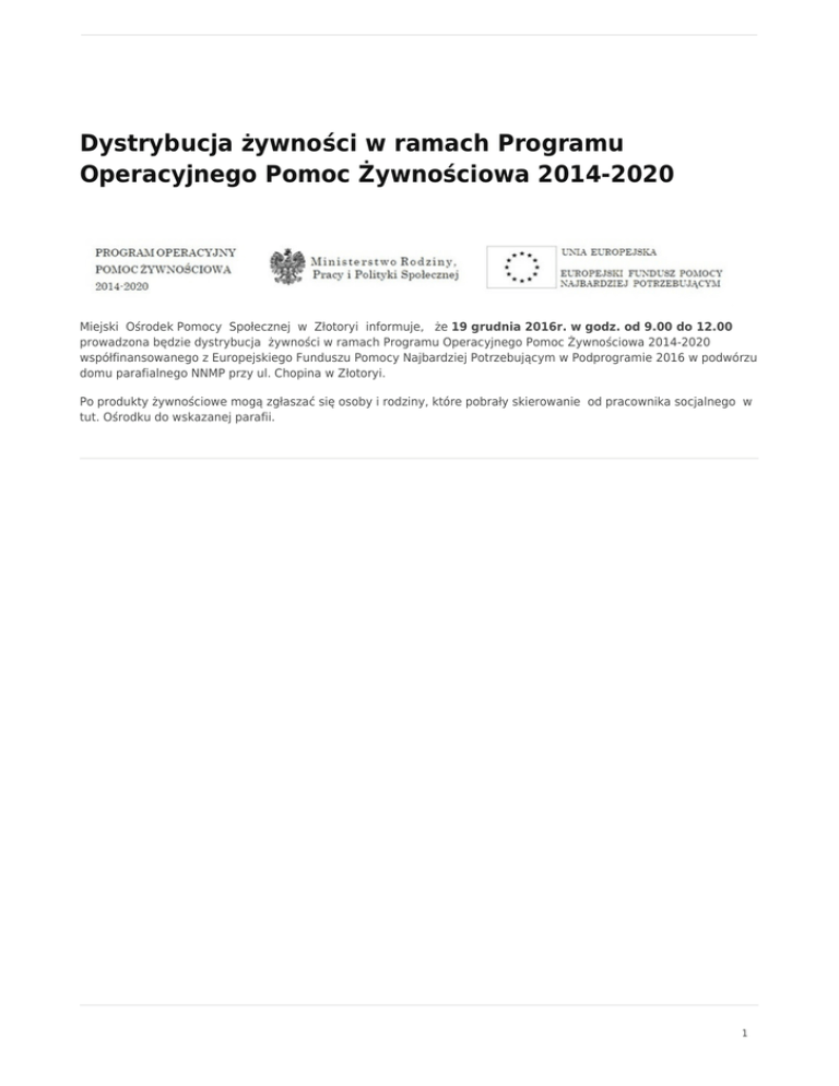 Dystrybucja żywności w ramach Programu Operacyjnego Pomoc Żywnościowa 2014-2020 Miejski Ośrodek Pomocy Społecznej w Złotoryi informuje, że 19 grudnia 2016r. w godz. od 9.00 do 12.00 prowadzona będzie dystrybucja żywności w ramach Programu Operacyjnego Pomoc Żywnościowa 2014-2020 współfinansowanego z Europejskiego Funduszu Pomocy Najbardziej Potrzebującym w Podprogramie 2016 w podwórzu domu parafialnego NNMP przy ul. Chopina w Złotoryi. Po produkty żywnościowe mogą zgłaszać się osoby i rodziny, które pobrały skierowanie od pracownika socjalnego w tut. Ośrodku do wskazanej parafii. 1