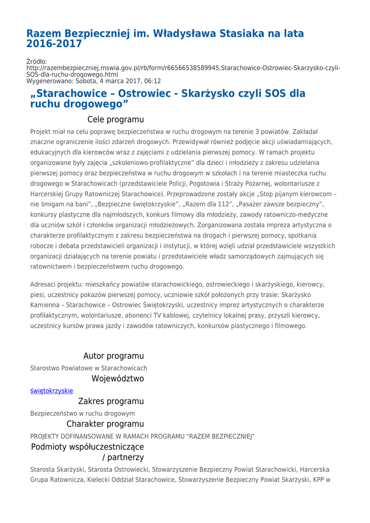 Razem Bezpieczniej im. Władysława Stasiaka na lata 2016-2017 Źródło: http://razembezpieczniej.mswia.gov.pl/rb/form/r66566538589945,Starachowice-Ostrowiec-Skarzysko-czyliSOS-dla-ruchu-drogowego.html Wygenerowano: Sobota, 4 marca 2017, 06:12 „Starachowice – Ostrowiec - Skarżysko czyli SOS dla ruchu drogowego” Cele programu Projekt miał na celu poprawę bezpieczeństwa w ruchu drogowym na terenie 3 powiatów. Zakładał znaczne ograniczenie ilości zdarzeń drogowych. Przewidywał również podjęcie akcji uświadamiających, edukacyjnych dla kierowców wraz z zajęciami z udzielania pierwszej pomocy. W ramach projektu organizowane były zajęcia „szkoleniowo-profilaktyczne” dla dzieci i młodzieży z zakresu udzielania pierwszej pomocy oraz bezpieczeństwa w ruchu drogowym w szkołach i na terenie miasteczka ruchu drogowego w Starachowicach (przedstawiciele Policji, Pogotowia i Straży Pożarnej, wolontariusze z Harcerskiej Grupy Ratowniczej Starachowice). Przeprowadzone zostały akcje „Stop pijanym kierowcom – nie śmigam na bani”, „Bezpieczne świętokrzyskie”, „Razem dla 112”, „Pasażer zawsze bezpieczny”, konkursy plastyczne dla najmłodszych, konkurs filmowy dla młodzieży, zawody ratowniczo-medyczne dla uczniów szkół i członków organizacji młodzieżowych. Zorganizowana została impreza artystyczna o charakterze profilaktycznym z zakresu bezpieczeństwa na drogach i pierwszej pomocy, spotkania robocze i debata przedstawicieli organizacji i instytucji, w której wzięli udział przedstawiciele wszystkich organizacji działających na terenie powiatu i przedstawiciele władz samorządowych zajmujących się ratownictwem i bezpieczeństwem ruchu drogowego. Adresaci projektu: mieszkańcy powiatów starachowickiego, ostrowieckiego i skarżyskiego, kierowcy, piesi, uczestnicy pokazów pierwszej pomocy, uczniowie szkół położonych przy trasie: Skarżysko Kamienna – Starachowice – Ostrowiec Świętokrzyski, uczestnicy imprez artystycznych o charakterze profilaktycznym, wolontariusze, abonenci TV kablowej, czytelnicy lokalnej prasy, przyszli kierowcy, uczestnicy kursów prawa jazdy i zawodów ratowniczych, konkursów plastycznego i filmowego. Autor programu Starostwo Powiatowe w Starachowicach Województwo świętokrzyskie Zakres programu Bezpieczeństwo w ruchu drogowym Charakter programu PROJEKTY DOFINANSOWANE W RAMACH PROGRAMU "RAZEM BEZPIECZNIEJ" Podmioty współuczestniczące / partnerzy Starosta Skarżyski, Starosta Ostrowiecki, Stowarzyszenie Bezpieczny Powiat Starachowicki, Harcerska Grupa Ratownicza, Kielecki Oddział Starachowice, Stowarzyszenie Bezpieczny Powiat Skarżyski, KPP w Starachowicach, Ostrowcu i Skarżysku – Kamiennej, Straż Miejska w Starachowicach. Suma dofinansowania 94.200 Czas rozpoczęcia 01.03.2014 Czas zakończenia programu 31.12.2014 Metody i sposoby realizacji programu Poprzez zrealizowanie projektu zwiększono dostęp społeczeństwa do edukacji w zakresie bezpieczeństwa ruchu drogowego poprzez dystrybucję materiałów edukacyjnych. Podniesiono poziom wiedzy wśród społeczności lokalnych w zakresie rozpoznawania i działania środków psychotropowych zwłaszcza ich wpływu na organizm ludzki podczas prowadzenia samochodu. Przeszkolono w zakresie udzielania pierwszej pomocy funkcjonariuszy Policji oraz strażaków z ochotniczych straży pożarnych. Zakres działania / zakres przeciwdziałania bezpieczeństwo w ruchu drogowym