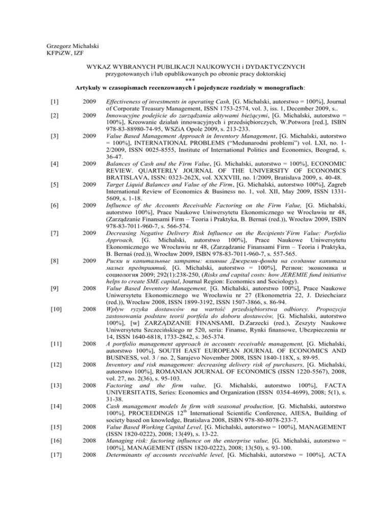 Grzegorz Michalski KFPiZW, IZF WYKAZ WYBRANYCH PUBLIKACJI NAUKOWYCH i DYDAKTYCZNYCH przygotowanych i/lub opublikowanych po obronie pracy doktorskiej *** Artykuły w czasopismach recenzowanych i pojedyncze rozdziały w monografiach: [1] 2009 [2] 2009 [3] 2009 [4] 2009 [5] 2009 [6] 2009 [7] 2009 [8] 2009 [9] 2008 [10] 2008 [11] 2008 [12] 2008 [13] 2008 [14] 2008 [15] 2008 [16] 2008 [17] 2008 Effectiveness of investments in operating Cash, [G. Michalski, autorstwo = 100%], Journal of Corporate Treasury Management, ISSN 1753-2574, vol. 3, iss. 1, December 2009, s.. Innowacyjne podejście do zarządzania aktywami bieżącymi, [G. Michalski, autorstwo = 100%], Kreowanie działań innowacyjnych i przedsiębiorczych, W.Potwora [red.], ISBN 978-83-88980-74-95, WSZiA Opole 2009, s. 213-233. Value Based Management Approach in Inventory Management, [G. Michalski, autorstwo = 100%], INTERNATIONAL PROBLEMS (“Medunarodni problemi”) vol. LXI, no. 12/2009, ISSN 0025-8555, Institute of International Politics and Economics, Beograd, s. 36-47. Balances of Cash and the Firm Value, [G. Michalski, autorstwo = 100%], ECONOMIC REVIEW. QUARTERLY JOURNAL OF THE UNIVERSITY OF ECONOMICS BRATISLAVA, ISSN: 0323-262X, vol. XXXVIII, no. 1/2009, Bratislava 2009, s. 40-48. Target Liquid Balances and Value of the Firm, [G. Michalski, autorstwo 100%], Zagreb International Review of Economics & Business no. 1, vol. XII, May 2009, ISSN 13315609, s. 1-18. Influence of the Accounts Receivable Factoring on the Firm Value, [G. Michalski, autorstwo 100%], Prace Naukowe Uniwersytetu Ekonomicznego we Wrocławiu nr 48, (Zarządzanie Finansami Firm – Teoria i Praktyka, B. Bernaś (red.)), Wrocław 2009, ISBN 978-83-7011-960-7, s. 566-574. Decreasing Negative Delivery Risk Influence on the Recipients’Firm Value: Porfolio Approach, [G. Michalski, autorstwo 100%], Prace Naukowe Uniwersytetu Ekonomicznego we Wrocławiu nr 48, (Zarządzanie Finansami Firm – Teoria i Praktyka, B. Bernaś (red.)), Wrocław 2009, ISBN 978-83-7011-960-7, s. 557-565. Риски и капитальные затраты: влияние Джереми-фонда на создание капитала малых предприятий, [G. Michalski, autorstwo = 100%], Регион: экономика и социология 2009; 292(1):238-250, (Risks and capital costs: how JEREMIE fund initiative helps to create SME capital, Journal Region: Economics and Sociology). Value Based Inventory Management, [G. Michalski, autorstwo 100%], Prace Naukowe Uniwersytetu Ekonomicznego we Wrocławiu nr 27 (Ekonometria 22, J. Dziechciarz (red.)), Wrocław 2008, ISSN 1899-3192, ISSN 1507-3866, s. 86-94. Wpływ ryzyka dostawców na wartość przedsiębiorstwa odbiorcy. Propozycja zastosowania podstaw teorii portfela do doboru dostawców, [G. Michalski, autorstwo 100%], [w] ZARZĄDZANIE FINANSAMI, D.Zarzecki (red.), Zeszyty Naukowe Uniwersytetu Szczecińskiego nr 520, seria: Finanse, Rynki finansowe, Ubezpieczenia nr 14, ISSN 1640-6818, 1733-2842, s. 365-374. A portfolio management approach in accounts receivable management, [G. Michalski, autorstwo 100%], SOUTH EAST EUROPEAN JOURNAL OF ECONOMICS AND BUSINESS, vol. 3 / no. 2, Sarajevo November 2008, ISSN 1840-118X, s. 89-95. Inventory and risk management: decreasing delivery risk of purchasers, [G. Michalski, autorstwo 100%], ROMANIAN JOURNAL OF ECONOMICS (ISSN 1220-5567), 2008, vol. 27, no. 2(36), s. 95-103. Factoring and the firm value, [G. Michalski, autorstwo 100%], FACTA UNIVERSITATIS, Series: Economics and Organization (ISSN 0354-4699), 2008; 5(1), s. 31-38. Cash management models In firm with seasonal production, [G. Michalski, autorstwo 100%], PROCEEDINGS 12th International Scientific Conference, AIESA, Building of society based on knowledge, Bratislava 2008, ISBN 978-80-8078-233-7. Value Based Working Capital Level, [G. Michalski, autorstwo = 100%], MANAGEMENT (ISSN 1820-0222), 2008; 13(49), s. 13-22. Managing risk: factoring influence on the enterprise value, [G. Michalski, autorstwo = 100%], MANAGEMENT (ISSN 1820-0222), 2008; 13(50), s. 93-100. Determinants of accounts receivable level, [G. Michalski, autorstwo = 100%], ACTA 1 [18] 2008 [19] 2008 [20] 2008 [21] 2008 [22] 2008 [23] 2008 [24] 2008 [25] 2008 [26] 2008 [27] 2008 [28] 2008 [29] 2008 [30] 2008 [31] 2008 [32] 2008 OECONOMICA PRAGENSIA (ISSN 0572-3043), 2008; 16(5), s. 47-56. Corporate inventory management with value maximization in view. [G. Michalski, autorstwo = 100%], Agricultural Economics 1, 54/2008(5), ISSN 0139 – 570X, 2008, s.187-192. Decreasing negative delivery risk influence on the recipents firm value: portfolio approach, [G. Michalski, autorstwo 100%], ICBE 2008, Management & Marketing, C. Chiru i inni (red.), Constanza 2008, ISBN 978-973-692-233-6, s. 50-56. Decreasing operating risk in accounts receivable management: influence of the factoring on the firm value, [G. Michalski, autorstwo 100%], MANAGING AND MODELING OF FINANCIAL RISK, D. Dluhosova (red.), VSB – Technical University of Ostrava, Ostrava 2008, ISBN 978-80-248-1846-7, s. 130-137. Faktoring i jego wpływ na wzrost wartości przedsiębiorstwa faktoranta, [G. Michalski, autorstwo 100%], RYNEK FINANSOWY. INSPIRACJE Z INTEGRACJI EUROPEJSKIEJ., P.Karpuś, J.Węcławski (red.), UMCS Lublin 2008, ISBN 978-83-2272885-7, s. 611-616. Finansowa efektywność inwestycji w kapitał pracujący netto przedsiębiorstwa, [G. Michalski, autorstwo 100%], WARTOŚĆ JAKO KRYTERIUM EFEKTYWNOŚCI, T. Dudycz (red.), Politechnika Wrocławska, Wrocław 2008, ISBN 978-83-926902-1-4, s. 97100. Firm value and net current assets investments, [G. Michalski, autorstwo 100%], ICBE 2008, Management & Marketing, C. Chiru i inni (red.), Constanza 2008, ISBN 978-973692-233-6, s. 57-66. Liquidity or profitability: financial effectiveness of investments in working capital, [G. Michalski, autorstwo 100%], EUROPEAN FINANCIAL SYSTEMS, P. Cervinek (red.), Masarykova Univerzita, Brno 2008, ISBN 978-80-210-4628-3, 
