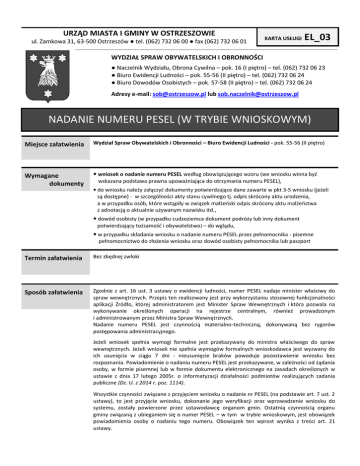 URZĄD MIASTA I GMINY W OSTRZESZOWIE ul. Zamkowa 31, 63-500 Ostrzeszów ● tel. (062) 732 06 00 ● fax (062) 732 06 01 KARTA USŁUGI EL_03 WYDZIAŁ SPRAW OBYWATELSKICH I OBRONNOŚCI ● Naczelnik Wydziału, Obrona Cywilna – pok. 16 (I piętro) – tel. (062) 732 06 23 ● Biuro Ewidencji Ludności – pok. 55-56 (II piętro) – tel. (062) 732 06 24 ● Biuro Dowodów Osobistych – pok. 57-58 (II piętro) – tel. (062) 732 06 24 Adresy e-mail: [email protected] lub [email protected] NADANIE NUMERU PESEL (W TRYBIE WNIOSKOWYM) Miejsce załatwienia Wydział Spraw Obywatelskich i Obronności – Biuro Ewidencji Ludności - pok. 55-56 (II piętro) Wymagane dokumenty wniosek o nadanie numeru PESEL według obowiązującego wzoru (we wniosku winna być wskazana podstawa prawna upoważniająca do otrzymania numeru PESEL), do wniosku należy załączyć dokumenty potwierdzające dane zawarte w pkt 3-5 wniosku (jeżeli są dostępne) - w szczególności akty stanu cywilnego tj. odpis skrócony aktu urodzenia, a w przypadku osób, które wstąpiły w związek małżeński odpis skrócony aktu małżeństwa z adnotacją o aktualnie używanym nazwisku itd., dowód osobisty (w przypadku cudzoziemca dokument podróży lub inny dokument potwierdzający tożsamość i obywatelstwo) – do wglądu, w przypadku składania wniosku o nadanie numeru PESEL przez pełnomocnika - pisemne pełnomocnictwo do złożenia wniosku oraz dowód osobisty pełnomocnika lub paszport Termin załatwienia Bez zbędnej zwłoki Sposób załatwienia Zgodnie z art. 16 ust. 3 ustawy o ewidencji ludności, numer PESEL nadaje minister właściwy do spraw wewnętrznych. Przepis ten realizowany jest przy wykorzystaniu stosownej funkcjonalności aplikacji Źródło, której administratorem jest Minister Spraw Wewnętrznych i która pozwala na wykonywanie określonych operacji na rejestrze centralnym, również prowadzonym i administrowanym przez Ministra Spraw Wewnętrznych. Nadanie numeru PESEL jest czynnością materialno-techniczną, dokonywaną bez rygorów postępowania administracyjnego. Jeżeli wniosek spełnia wymogi formalne jest przekazywany do ministra właściwego do spraw wewnętrznych. Jeżeli wniosek nie spełnia wymogów formalnych wnioskodawca jest wyzwany do ich usunięcia w ciągu 7 dni - nieusunięcie braków powoduje pozostawienie wniosku bez rozpoznania. Powiadomienie o nadaniu numeru PESEL jest przekazywane, w zależności od żądania osoby, w formie pisemnej lub w formie dokumentu elektronicznego na zasadach określonych w ustawie z dnia 17 lutego 2005r. o informatyzacji działalności podmiotów realizujących zadania publiczne (Dz. U. z 2014 r. poz. 1114). Wszystkie czynności związane z przyjęciem wniosku o nadanie nr PESEL (na podstawie art. 7 ust. 2 ustawy), to jest przyjęcie wniosku, dokonanie jego weryfikacji oraz wprowadzenie wniosku do systemu, zostały powierzone przez ustawodawcę organom gmin. Ostatnią czynnością organu gminy związaną z ubieganiem się o numer PESEL – w tym w trybie wnioskowym, jest obowiązek powiadomienia osoby o nadaniu tego numeru. Obowiązek ten wprost wynika z treści art. 21 ustawy. Opłaty Brak opłat. W przypadku, gdy osoba wnioskująca o nadanie numeru PESEL działa przez pełnomocnika - 17 zł opłata skarbowa za złożenie pełnomocnictwa). Opłatę uiszcza się w kasie Urzędu – pok. 73, III 00 00 piętro w godz. 8 – 14 . Wpłaty dokonać można również na konto bankowe Urzędu: WBKPPLPP PL 25 1090 1173 0000 0000 1700 5753 (w tytule przelewu można wpisać: opłata skarbowa za udzielenie pełnomocnictwa). Opłacie skarbowej nie podlegają pełnomocnictwa udzielone: małżonkowi, rodzicom, dzieciom, dziadkom i rodzeństwu Tryb odwoławczy Nie występuje (czynność materialno-techniczna) Dodatkowe informacje Cudzoziemcy, którzy nie otrzymali numeru PESEL w związku z zameldowaniem, ponieważ nie są wymienieni w art. 7 ust. 1 pkt 3 ustawy o ewidencji ludności, a numer z określonych powodów jest niezbędny, mogą ubiegać się o jego nadanie w trybie wnioskowym. We wniosku o nadanie numeru PESEL należy podać faktyczną podstawę prawną, z której wynika obowiązek posiadania numeru PESEL. O nadanie numer PESEL w trybie wnioskowym ubiegać się mogą też osoby mający polskie obywatelstwo i nie mający nadanego numeru PESEL. Osoba taka uzyska numer PESEL automatycznie w przypadku złożenia przez nią wniosku o wydanie polskiego dowodu osobistego lub paszportu. Jeżeli potrzebować będzie numeru PESEL w innym celu – winna wystąpić z wnioskiem o jego nadanie i – podobnie jak w przypadku wymienionych wyżej obcokrajowców, wskazać podstawę prawną, która obliguje go do posiadania numeru PESEL. Organem właściwym do przyjęcia wniosku o nadanie numeru PESEL od osób obowiązanych na podstawie odrębnych przepisów do posiadania numeru PESEL jest organ gminy właściwy do zameldowania na pobyt stały albo na pobyt czasowy, a w przypadku braku miejsca zameldowania na pobyt stały albo na pobyt czasowy, organ właściwy dla siedziby pracodawcy W razie niemożności ustalenia właściwego organu gminy – organ gminy właściwy dla dzielnicy Śródmieście Miasta stołecznego Warszawy. We wniosku o nadanie numeru PESEL należy podać faktyczną podstawę prawną, z której wynika obowiązek posiadania numeru PESEL. W przypadku, gdy jakiś podmiot/urząd (np. ZUS czy Urząd Skarbowy) wymaga podania numeru PESEL, to powinien wskazać również przepis prawa, z którego wynika obowiązek posiadania tego numeru Numer PESEL jest nadawany z urzędu przez: 1) kierownika urzędu stanu cywilnego sporządzającego akt urodzenia dla dzieci obywateli polskich i cudzoziemców zamieszkałych i urodzonych na terytorium Rzeczypospolitej Polskiej, których dane są gromadzone w rejestrze PESEL; 2) organ gminy właściwy do zameldowania na pobyt stały albo pobyt czasowy dla osób, których dane są gromadzone w rejestrze PESEL; 3) organ wydający polski dok