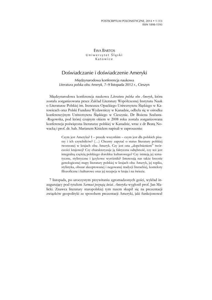 POSTSCRIPTUM POLONISTYCZNE, 2014 • 1 (13) ISSN 1898-1593 EWA BARTOS Uniwersytet Śląski Katowice Doświadczanie i doświadczenie Ameryki Międzynarodowa konferencja naukowa Literatura polska obu Ameryk, 7–9 listopada 2012 r., Cieszyn Międzynarodowa konferencja naukowa Literatura polska obu Ameryk, która została zorganizowana przez Zakład Literatury Współczesnej Instytutu Nauk o Literaturze Polskiej im. Ireneusza Opackiego Uniwersytetu Śląskiego w Katowicach oraz Polski Fundusz Wydawniczy w Kanadzie, odbyła się w ośrodku konferencyjnym Uniwersytetu Śląskiego w Cieszynie. Dr Bożena Szałasta-Rogowska, pod której czujnym okiem w 2008 roku została zorganizowana konferencja poświęcona literaturze polskiej w Kanadzie, wraz z dr Beatą Nowacką i prof. dr. hab. Marianem Kisielem napisali w zaproszeniu: Czym jest Ameryka? I – przede wszystkim – czym jest dla polskich pisarzy i ich czytelników? (…) Chcemy zapytać o status literatury polskiej tworzonej w krajach obu Ameryk. Czy jest ona „dopełnieniem” twórczości krajowej? Czy charakteryzuje ją faktyczna odrębność, czy też jest integralną częścią polskiego dorobku kulturowego? Czy istnieją jej tematyczne, stylistyczne i językowe wyróżniki? Interesują nas także kwestie genologicznej mapy literatury polskiej w krajach obu Ameryk, jej topika, stylistyka, obszar akceptowanej i negowanej tradycji literackiej, konteksty filozoficzne i kulturowe oraz jej recepcja w kraju i na świecie. 7 listopada, po uroczystym przywitaniu zgromadzonych gości, wykład inaugurujący pod tytułem Sarmaci poznają świat. Ameryka wygłosił prof. Jan Malicki. Znawca literatury staropolskiej tym razem skupił się na prezentacji związków geopolityki ze sposobem prezentacji Ameryki, jaki funkcjonował 290 POSTSCRIPTUM POLONISTYCZNE, 2014 • 1 (13) w Polsce w XVIII wieku. Natomiast reprezentujący University of British Columbia prof. Andrzej Busza przeniósł refleksję nad Ameryką do czasów współczesnych, wygłaszając referat pod tytułem Spojrzenie na grupę „Kontynentów” z perspektywy refleksji Edwarda Saida. Teoria literaturoznawcza została skonfrontowana z osobistym doświadczeniem. Wykład oprócz walorów poznawczych (nie wszystkie teksty Edwarda Saida, o których była mowa, znane są polskiemu czytelnikowi) przyniósł o wiele więcej, a to za sprawą prywatnego tonu. Prof. Busza zdawał relację ze spotkań z autorem Orientalizmu, udostępnił fragmenty własnej z nim korespondencji. O poezji jako doświadczeniu losu traktowała hermeneutyczna interpretacja twórczości Bogdana Czaykowskiego, zaprezentowana przez prof. Mariana Kisiela. Uczestnicy sesji mieli okazję wysłuchać erudycyjnej interpretacji, uruchamiającej kompetencje historyka literatury, teoretyka poezji, a przede wszystkim długoletniego zaangażowanego czytelnika. Dwa referaty: prof. Niny Taylor-Terleckiej i dra Rafała Moczkodana dotyczyły twórczości Józefa Wittlina. Prof. Taylor-Terlecka, prowadząc biograficzną opowieść o Wittlinie, konstruowała ją ze skrawków własnych wspomnień, a także bogatych, nieznanych dotąd materiałów archiwalnych; dr Moczkodan przyglądał się pisarzowi jako krytykowi i eseiście. Dr Miłosz Piotrowiak przeniósł dyskusję w przestrzeń Nowego Jorku. Skupił się na śladach obecności metafory w przestrzeni miejskiej, odnajdując w niej Jacka Bierezina. Ciekawe, a nawet ryzykowne, okazało się zestawienie dwóch kolejnych referentów. Reprezentujący Polski Fundusz Wydawniczy w Kanadzie Marek Kusiba podzielił się ze słuchaczami swoją refleksją na temat literatury reportażowej w PRL-u. Referat dr Wioletty Wejs-Milewskiej Dystans i empatia. Strategie pisarskie Marka Kusiby stał się metaliterackim komentarzem do wcześniej sformułowanych tez. Programowy charakter miało wystąpienie dra Jerzego Kosska, który postulował dokładną analizę nazewnictwa stosowanego w literaturoznawstwie na określanie emigrantów. Badacz zwrócił uwagę na sposób kreowania polskości w literaturze tworzonej przez emigrantów urodzonych już w Ameryce. Referat otworzył ciekawą dyskusję na temat tożsamości twórców wychowanych poza Polską. Zderzenie z rzeczywistością oraz konfrontacja z mitem to tematy, nad którymi zastanawiali się mgr Michalina Kmiecik, badając występowanie w polskiej poezji mitu Nowego Jorku, oraz prof. Kazimierz Adamczyk przedstawiający degradację mitu „kraju miodem i mlekiem płynącego”, widzianego przez pryzmat doświadczenia emigrantów lat osiemdziesiątych. EWA BARTOS: Doświadczanie i doświadczenie Ameryki… 291 Interesującym wystąpieniem był także referat dr Justyny Budzik, która na przykładzie tłumaczeń Romana Sabo pokazywała różne sposoby translacji poezji. Jej dość specjalistyczny odczyt nie był nużący dla słuchaczy, badaczka nie wypierała się swojego emocjonalnego związku z twórczością analizowanego pisarza. Z wystąpienia można było wywnioskować naczelną tezę, że „tłumacz kunsztowny” to ten, który przekazuje jak najwierniej słowa autora oryginału. Pierwszy dzień konferencji zakończył się po burzliwej, niebywale ważnej merytorycznie dyskusji. Wszystkie referaty odznaczały się dwiema cechami: wysokim poziomem naukowym oraz emocjonalnym zaangażowaniem w poruszany temat. Drugiego dnia obrady odbywały się w sekcjach. Pierwsza z nich skoncentrowała się głównie na dorobku skamandrytów. Przedmiotem wystąpienia mgr Anny Kasperek była amerykańska twórczość Kazimierza Wierzyńskiego, dr Beata Mytych-Forajter analizowała listy Iwaszkiewicza oraz wykreowany w nich świat Argentyny i Chile. Dr Barbara Czarnecka zastanawiała się nad doświadczeniami Ameryki Lechonia, natomiast prof. Joanna Kisiel dokonała żywiołowej analizy jego amerykańskich wierszy. Słuchacze, którzy wybrali tę sekcję, mieli okazję doświadczyć, czym jest prawdziwa sztuka interpretacji. Referenci nastawieni na detal, sł