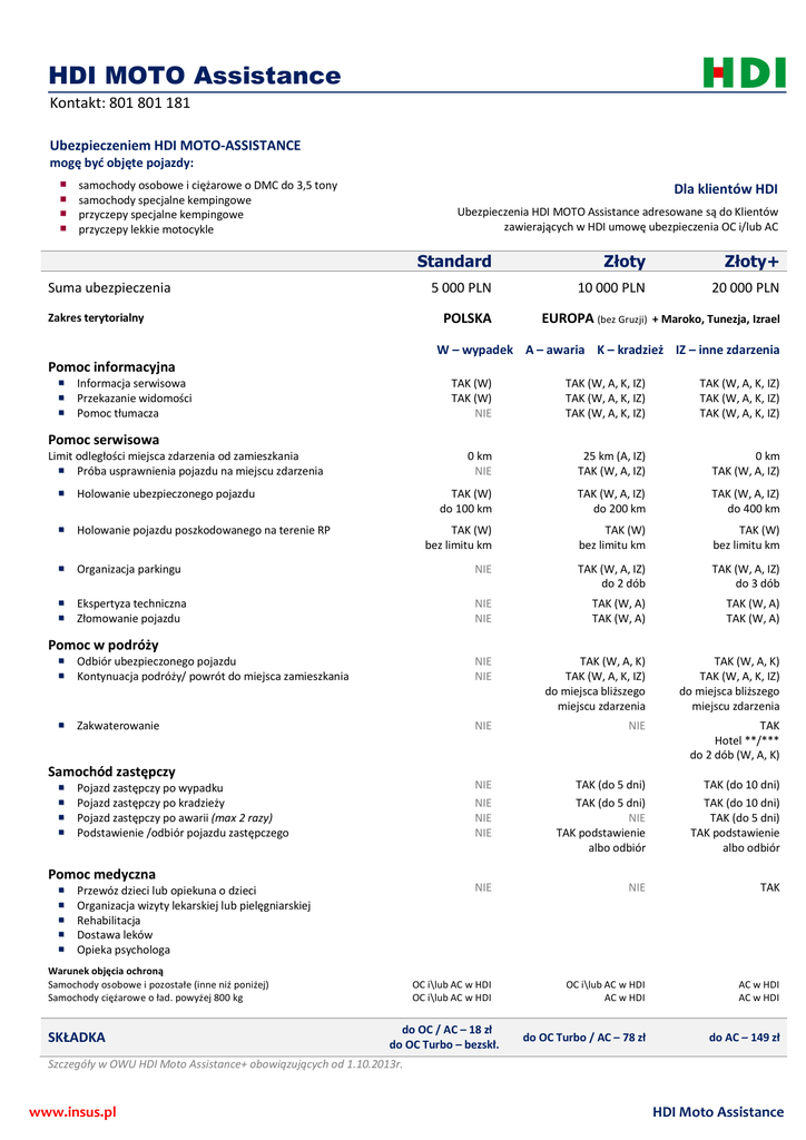 HDI MOTO Assistance Kontakt: 801 801 181 Ubezpieczeniem HDI MOTO-ASSISTANCE mogę być objęte pojazdy: samochody osobowe i ciężarowe o DMC do 3,5 tony samochody specjalne kempingowe przyczepy specjalne kempingowe przyczepy lekkie motocykle Dla klientów HDI Ubezpieczenia HDI MOTO Assistance adresowane są do Klientów zawierających w HDI umowę ubezpieczenia OC i/lub AC Suma ubezpieczenia Standard Złoty Złoty+ 5 000 PLN 10 000 PLN 20 000 PLN POLSKA Zakres terytorialny EUROPA (bez Gruzji) + Maroko, Tunezja, Izrael W – wypadek A – awaria K – kradzież IZ – inne zdarzenia Pomoc informacyjna Informacja serwisowa Przekazanie widomości Pomoc tłumacza TAK (W) TAK (W) NIE TAK (W, A, K, IZ) TAK (W, A, K, IZ) TAK (W, A, K, IZ) TAK (W, A, K, IZ) TAK (W, A, K, IZ) TAK (W, A, K, IZ) 0 km NIE 25 km (A, IZ) TAK (W, A, IZ) 0 km TAK (W, A, IZ) TAK (W) do 100 km TAK (W, A, IZ) do 200 km TAK (W, A, IZ) do 400 km TAK (W) bez limitu km TAK (W) bez limitu km TAK (W) bez limitu km Organizacja parkingu NIE TAK (W, A, IZ) do 2 dób TAK (W, A, IZ) do 3 dób Ekspertyza techniczna Złomowanie pojazdu NIE NIE TAK (W, A) TAK (W, A) TAK (W, A) TAK (W, A) Odbiór ubezpieczonego pojazdu Kontynuacja podróży/ powrót do miejsca zamieszkania NIE NIE TAK (W, A, K) TAK (W, A, K, IZ) do miejsca bliższego miejscu zdarzenia TAK (W, A, K) TAK (W, A, K, IZ) do miejsca bliższego miejscu zdarzenia Zakwaterowanie NIE NIE TAK Hotel **/*** do 2 dób (W, A, K) NIE NIE NIE NIE TAK (do 5 dni) TAK (do 5 dni) NIE TAK podstawienie albo odbiór TAK (do 10 dni) TAK (do 10 dni) TAK (do 5 dni) TAK podstawienie albo odbiór NIE NIE TAK OC i\lub AC w HDI OC i\lub AC w HDI OC i\lub AC w HDI AC w HDI AC w HDI AC w HDI do OC Turbo / AC – 78 zł do AC – 149 zł Pomoc serwisowa Limit odległości miejsca zdarzenia od zamieszkania Próba usprawnienia pojazdu na miejscu zdarzenia Holowanie ubezpieczonego pojazdu Holowanie pojazdu poszkodowanego na terenie RP Pomoc w podróży Samochód zastępczy Pojazd zastępczy po wypadku Pojazd zastępczy po kradzieży Pojazd zastępczy po awarii (max 2 razy) Podstawienie /odbiór pojazdu zastępczego Pomoc medyczna Przewóz dzieci lub opiekuna o dzieci Organizacja wizyty lekarskiej lub pielęgniarskiej Rehabilitacja Dostawa leków Opieka psychologa Warunek objęcia ochroną Samochody osobowe i pozostałe (inne niż poniżej) Samochody ciężarowe o ład. powyżej 800 kg SKŁADKA do OC / AC – 18 zł do OC Turbo – bezskł. Szczegóły w OWU HDI Moto Assistance+ obowiązujących od 1.10.2013r. www.insus.pl HDI Moto Assistance