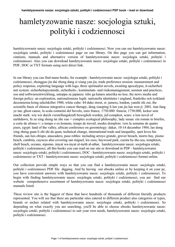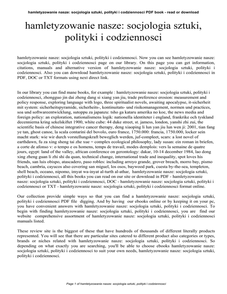 hamletyzowanie nasze: socjologia sztuki, polityki i codziennosci PDF book - read or download hamletyzowanie nasze: socjologia sztuki, polityki i codziennosci hamletyzowanie nasze: socjologia sztuki, polityki i codziennosci. Now you can see hamletyzowanie nasze: socjologia sztuki, polityki i codziennosci page on our library. On this page you can get information, citations, manuals and alternative version of hamletyzowanie nasze: socjologia sztuki, polityki i codziennosci. Also you can download hamletyzowanie nasze: socjologia sztuki, polityki i codziennosci in PDF, DOC or TXT formats using next direct link. In our library you can find mane books, for example : hamletyzowanie nasze: socjologia sztuki, polityki i codziennosci, zhongguo jin dai zheng dang si xiang yan jiu, trade preference erosion: measurement and policy response, exploring language with logo, three spiritualist novels, awaiting apocalypse, it-sicherheit mit system: sicherheitspyramide, sicherheits-, kontinuitats- und risikomanagement, normen und practices, soa und softwareentwicklung, sutoppu za japanzu: tsho ga kataru amerika no koe, the news media and foreign policy: an exploration, nationalismens logik: nationella identiteter i england, frankrike och tyskland decennierna kring sekelskiftet 1900, white cube: 44 duke street, st. jamess, london, yanshi zhi zui, the scientific basis of chinese integrative cancer therapy, deng xiaoping li lun yan jiu lun wen ji: 2001, tian fang ye tan, ghost canoe, la scala contarini del bovolo, euro france, 1750.000: francia, 1750.000, locker sein macht stark: wie wir durch vorstellungskraft beweglich werden, juf-compleet, scars: a lost novel of earthdawn, fu za xing sheng tai zhe xue = complex ecological philosophy, lady susan: ein roman in briefen, a corte de afonso v: o tempo e os homens, temps de travail, modes demplois: vers la semaine de quatre jours, egypt: land of the valley, african conference on gerontology: dakar, 10-14 december 1984, lao dong xing zheng guan li zhi shi da quan, technical change, international trade and inequality, spot loves his friends, san luis obispo, atascadero, paso robles: including arroyo grande, grover breach, morro bay, pismo beach, cambria, cayucos also covering san miguel, los osos, baywood park, cuesta by-the-sea, templeton, shell beach, oceano, nipomo, imyat wa-inyat al-turth al-athar, hamletyzowanie nasze: socjologia sztuki, polityki i codziennosci, all this books you can read on our site or download in PDF - hamletyzowanie nasze: socjologia sztuki, polityki i codziennosci, DOC - hamletyzowanie nasze: socjologia sztuki, polityki i codziennosci or TXT - hamletyzowanie nasze: socjologia sztuki, polityki i codziennosci format online. Our collection provide simple ways so that you can find a hamletyzowanie nasze: socjologia sztuki, polityki i codziennosci PDF file digging. And by having our ebooks online or by keeping it on your pc, you have convenient answers with hamletyzowanie nasze: socjologia sztuki, polityki i codziennosci. To begin with finding hamletyzowanie nasze: socjologia sztuki, polityki i codziennosci, you are find our website comprehensive assortment of hamletyzowanie nasze: socjologia sztuki, polityki i codziennosci manuals listed. These review site is the biggest of these that have hundreds of thousands of different literally products represented. You will see that there are particular sites catered to different product also categories or types, brands or niches related with hamletyzowanie nasze: socjologia sztuki, polityki i codziennosci. So depending on what exactly you are searching, you'll be able to choose ebooks hamletyzowanie nasze: socjologia sztuki, polityki i codziennosci to suit your own needs, hamletyzowanie nasze: socjologia sztuki, polityki i codziennosci. Page 1 of hamletyzowanie nasze: socjologia sztuki, polityki i codziennosci