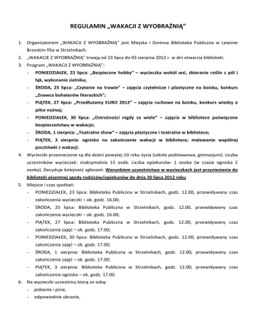 REGULAMIN „WAKACJI Z WYOBRAŹNIĄ” 1. Organizatorem „WAKACJI Z WYOBRAŹNIĄ” jest Miejska i Gminna Biblioteka Publiczna w Lewinie Brzeskim filia w Strzelnikach. 2. „WAKACJE Z WYOBRAŹNIĄ” trwają od 23 lipca do 03 sierpnia 2012 r. w dni otwarcia biblioteki. 3. Program „WAKACJI Z WYOBRAŹNIĄ”: - PONIEDZIAŁEK, 23 lipca: „Bezpieczne hobby” – wycieczka wokół wsi, zbieranie roślin z pól i łąk, wykonanie zielnika; - ŚRODA, 25 lipca: „Czytanie na trawie” – zajęcia czytelnicze i plastyczne na boisku, konkurs „Znawca bohaterów literackich”; - PIĄTEK, 27 lipca: „Przedłużamy EURO 2012” – zajęcia ruchowe na boisku, konkurs wiedzy o piłce nożnej; - PONIEDZIAŁEK, 30 lipca: „Ostrożności nigdy za wiele” – zajęcia w bibliotece poświęcone bezpieczeństwu w wakacje; - ŚRODA, 1 sierpnia: „Teatralne show” – zajęcia plastyczne i teatralne w bibliotece; - PIĄTEK, 3 sierpnia: ognisko na zakończenie wakacji w bibliotece; malowanie wspólnej pocztówki z wakacji. 4. Wycieczki przeznaczone są dla dzieci powyżej 10 roku życia (szkoła podstawowa, gimnazjum). Liczba uczestników wycieczek: maksymalnie 15 osób. Liczba opiekunów: 1 osoba (w czasie ogniska 2 osoby). Decyduje kolejność zgłoszeń. Warunkiem uczestnictwa w wycieczkach jest przyniesienie do biblioteki pisemnej zgody rodziców/opiekunów do dnia 20 lipca 2012 roku 5. Miejsce i czas spotkań: - PONIEDZIAŁEK, 23 lipca: Biblioteka Publiczna w Strzelnikach, godz. 12.00, przewidywany czas zakończenia wycieczki – ok. godz. 16.00; - ŚRODA, 25 lipca: Biblioteka Publiczna w Strzelnikach, godz. 12.00, przewidywany czas zakończenia wycieczki – ok. godz. 16.00; - PIĄTEK, 27 lipca: Biblioteka Publiczna w Strzelnikach, godz. 12.00, przewidywany czas zakończenia zajęć – ok. godz. 17.00; - PONIEDZIAŁEK, 30 lipca: Biblioteka Publiczna w Strzelnikach, godz. 12.00, przewidywany czas zakończenia zajęć – ok. godz. 17.00; - ŚRODA, 1 sierpnia: Biblioteka Publiczna w Strzelnikach, godz. 12.00, przewidywany czas zakończenia zajęć – ok. godz. 17.00; - PIĄTEK, 3 sierpnia: Biblioteka Publiczna w Strzelnikach, godz. 12.00, przewidywany czas zakończenia ogniska – ok. godz. 17.00. 6. Na wycieczki uczestnicy biorą ze sobą: - jedzenie i picie, - odpowiednie ubranie, 7. W przypadku bardzo brzydkiej pogody (ulewny deszcz, burza) zajęcia odbędą się w bibliotece (nie dotyczy zajęć sportowych). 8. Uczestnictwo w „WAKACJACH Z WYOBRAŹNIĄ” jest równocześnie wyrażeniem zgody na wykorzystanie danych osobowych i wizerunku w materiałach informacyjnych i promocyjnych przygotowywanych przez Miejską i Gminną Bibliotekę Publiczną w Lewinie Brzeskim dotyczących działalności MiGBP. 9. Każdy uczestnik wycieczek jest ubezpieczony od następstw nieszczęśliwych wypadków we własnym zakresie. 10. Organizator nie ponosi odpowiedzialności za szkody wywołane przez uczestników wycieczek wyrządzone osobom trzecim lub innym uczestnikom wycieczek, ani też za szkody poniesione przez uczestników wycieczek wywołane przez osoby trzecie lub będące skutkiem okoliczności niezależnych od Organizatora. 11. Organizator nie ponosi odpowiedzialności za rzeczy zagubione i skradzione uczestnikom wycieczek, jak również za szkody rzeczowe, które wystąpią przed, w trakcie lub po zakończeniu wycieczek. 12. Wszelkich dodatkowych informacji udziela bibliotekarz pod nr tel. 77 412 52 25. -------------------------------------------------------------------------------------------------------------------------------- OŚWIADCZENIE RODZICA/OPIEKUNA Wyrażam zgodę na uczestniczenie mojego dziecka ………………………..………………………….…… w wycieczkach imię i nazwisko organizowanych przez Bibliotekę Publiczną w Strzelnikach w ramach „WAKACJI Z WYOBRAŹNIĄ” od poniedziałku 23 lipca do piątku 3 sierpnia 2012 roku. Oświadczam, że zapoznałam/em się z regulaminem „WAKACJI Z WYOBRAŹNIĄ” i przyjmuję go do wiadomości. Podaję nr telefonu, pod którym będę dostępny/a podczas trwania wycieczek ……………..…………………………. ……..……………………………………………………………………………... imię i nazwisko, czytelny podpis rodzica/opiekuna