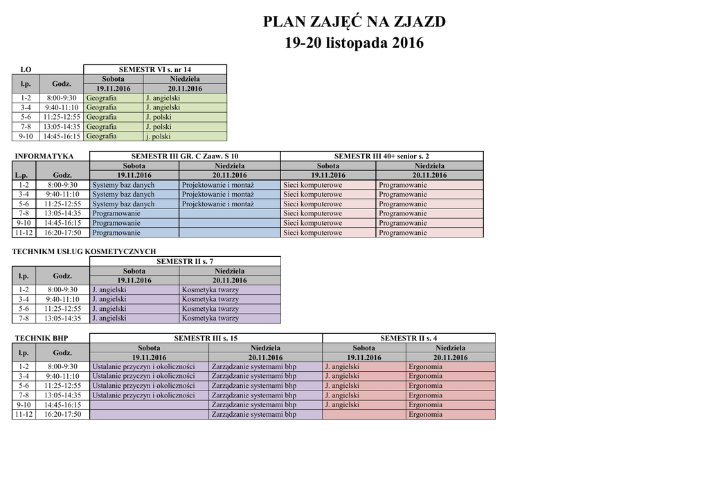 PLAN ZAJĘĆ NA ZJAZD 19-20 listopada 2016 LO l.p. 1-2 3-4 5-6 7-8 9-10 SEMESTR VI s. nr 14 Sobota Niedziela Godz. 19.11.2016 20.11.2016 J. angielski 8:00-9:30 Geografia J. angielski 9:40-11:10 Geografia J. polski 11:25-12:55 Geografia J. polski 13:05-14:35 Geografia 14:45-16:15 Geografia j. polski INFORMATYKA L.p. 1-2 3-4 5-6 7-8 9-10 11-12 Godz. 8:00-9:30 9:40-11:10 11:25-12:55 13:05-14:35 14:45-16:15 16:20-17:50 SEMESTR III GR. C Zaaw. S 10 Sobota Niedziela 19.11.2016 20.11.2016 Systemy baz danych Projektowanie i montaż Systemy baz danych Projektowanie i montaż Systemy baz danych Projektowanie i montaż Programowanie Programowanie Programowanie SEMESTR III 40+ senior s. 2 Sobota Niedziela 19.11.2016 20.11.2016 Sieci komputerowe Programowanie Sieci komputerowe Programowanie Sieci komputerowe Programowanie Sieci komputerowe Programowanie Sieci komputerowe Programowanie Sieci komputerowe Programowanie TECHNIKM USŁUG KOSMETYCZNYCH SEMESTR II s. 7 l.p. Godz. 1-2 3-4 5-6 7-8 8:00-9:30 9:40-11:10 11:25-12:55 13:05-14:35 TECHNIK BHP l.p. Godz. 1-2 3-4 5-6 7-8 9-10 11-12 8:00-9:30 9:40-11:10 11:25-12:55 13:05-14:35 14:45-16:15 16:20-17:50 Sobota 19.11.2016 J. angielski J. angielski J. angielski J. angielski Niedziela 20.11.2016 Kosmetyka twarzy Kosmetyka twarzy Kosmetyka twarzy Kosmetyka twarzy SEMESTR III s. 15 Sobota Niedziela 19.11.2016 20.11.2016 Ustalanie przyczyn i okoliczności Zarządzanie systemami bhp Ustalanie przyczyn i okoliczności Zarządzanie systemami bhp Ustalanie przyczyn i okoliczności Zarządzanie systemami bhp Ustalanie przyczyn i okoliczności Zarządzanie systemami bhp Zarządzanie systemami bhp Zarządzanie systemami bhp SEMESTR II s. 4 Sobota Niedziela 19.11.2016 20.11.2016 J. angielski Ergonomia J. angielski Ergonomia J. angielski Ergonomia J. angielski Ergonomia J. angielski Ergonomia Ergonomia TECHNIK ADMINISTRACJI l.p. Godz. 1-2 3-4 5-6 7-8 9-10 11-12 8:00-9:30 9:40-11:10 11:25-12:55 13:05-14:35 14:45-16:15 16:20-17:50 SEMESTR IV s. 18 Niedziela 20.11.2016 Postępowanie w administracji Postępowanie w administracji Postępowanie w administracji Dzień wolny Postępowanie w administracji Postępowanie w administracji Postępowanie w administracji Sobota 19.11.2016 SEMESTR III s. 13 Sobota Niedziela 19.11.2016 20.11.2016 Postępowanie w administracji Wykonywanie pracy biurowej Postępowanie w administracji Wykonywanie pracy biurowej Postępowanie w administracji Wykonywanie pracy biurowej Postępowanie w administracji Wykonywanie pracy biurowej Postępowanie w administracji Postępowanie w administracji SEMESTR II, s .9 Sobota Niedziela 19.11.2016 20.11.2016 Prawo administracyjne Prawo administracyjne Prawo administracyjne Prawo administracyjne Prawo administracyjne J. angielski Prawo administracyjne J. angielski J. angielski TECHNIK RACHUNKOWOŚCI SEMESTR III s, 6 l.p. Godz. 1-2 3-4 5-6 7-8 9-10 11-12 8:00-9:30 9:40-11:10 11:25-12:55 13:05-14:35 14:45-16:15 16:20-17:50 Sobota 19.11.2016 Dokumentacja biurowa Dokumentacja biurowa Dokumentacja biurowa Dokumentacja biurowa Wynagrodzenia i podatki Wynagrodzenia i podatki SEMESTR II s. 5 Niedziela 20.11.2016 Biuro rachunkowe Biuro rachunkowe Biuro rachunkowe Biuro rachunkowe Biuro rachunkowe Biuro rachunkowe OPIEKUNKA ŚRODOWISKOWA SEMESTR II s. 16 l.p. 1-2 3-4 5-6 7-8 9-10 11-12 Godz. 8:00-9:30 9:40-11:10 11:25-12:55 13:05-14:35 14:45-16:15 16:20-17:50 Sobota 19.11.2016 Aktywizacja Aktywizacja Aktywizacja Aktywizacja Aktywizacja Aktywizacja Niedziela 20.11.2016 J. migowy J. migowy J. migowy FLORYSTA l.p. 1-2 3-4 5-6 7-8 9-10 11-12 Godz. 8:00-9:30 9:40-11:10 11:25-12:55 13:05-14:35 14:45-16:15 16:20-17:50 SEMESTR II s.21 Sobota Niedziela 19.11.2016 20.11.2016 Wykonywanie kompozycji Wykonywanie kompozycji Wykonywanie kompozycji Wykonywanie kompozycji Wykonywanie kompozycji Wykonywanie kompozycji Wykonywanie kompozycji Wykonywanie kompozycji Wykonywanie kompozycji Wykonywanie kompozycji Wykonywanie kompozycji Wykonywanie kompozycji Sobota 19.11.2016 Działalność gospodarcza Działalność gospodarcza Działalność gospodarcza Działalność gospodarcza Niedziela 20.11.2016 Wynagrodzenia i podatki Wynagrodzenia i podatki Wynagrodzenia i podatki Wynagrodzenia i podatki WIZAŻYSTKA/ STYLISTKA SEMESTR II s. 17 l.p. 1-2 3-4 5-6 7-8 9-10 11-12 Godz. 8:00-9:30 9:40-11:10 11:25-12:55 13:05-14:35 14:45-16:15 16:20-17:50 Sobota 19.11.2016 Niedziela 20.11.2016 Zajęcia praktyczne Zajęcia praktyczne Zajęcia praktyczne Zajęcia praktyczne Dzień wolny REJESTRATORKA MEDYCZNA SEMESTR II s. 19 l.p. 1-2 3-4 5-6 7-8 9-10 11-12 Godz. 8:00-9:30 9:40-11:10 11:25-12:55 13:05-14:35 14:45-16:15 16:20-17:50 Sobota 19.11.2016 Niedziela 20.11.2016 Człowiek w ujęciu psychologicznym Człowiek w ujęciu psychologicznym Człowiek w ujęciu psychologicznym Dzień wolny TERAPEUTA DS. UZALEŻNIEŃ l.p. 1-2 3-4 5-6 7-8 9-10 11-12 Godz. 8:00-9:30 9:40-11:10 11:25-12:55 13:05-14:35 14:45-16:15 16:20-17:50 SEMESTR II s.18 Sobota Niedziela 19.11.2016 20.11.2016 Psychologia społeczna Psychologia społeczna Pedagogika dorosłych Psychologia społeczna Pedagogika dorosłych Metody badawcze Pedagogika dorosłych Metody badawcze Pedagogika dorosłych – egz. pisemny Metody badawcze