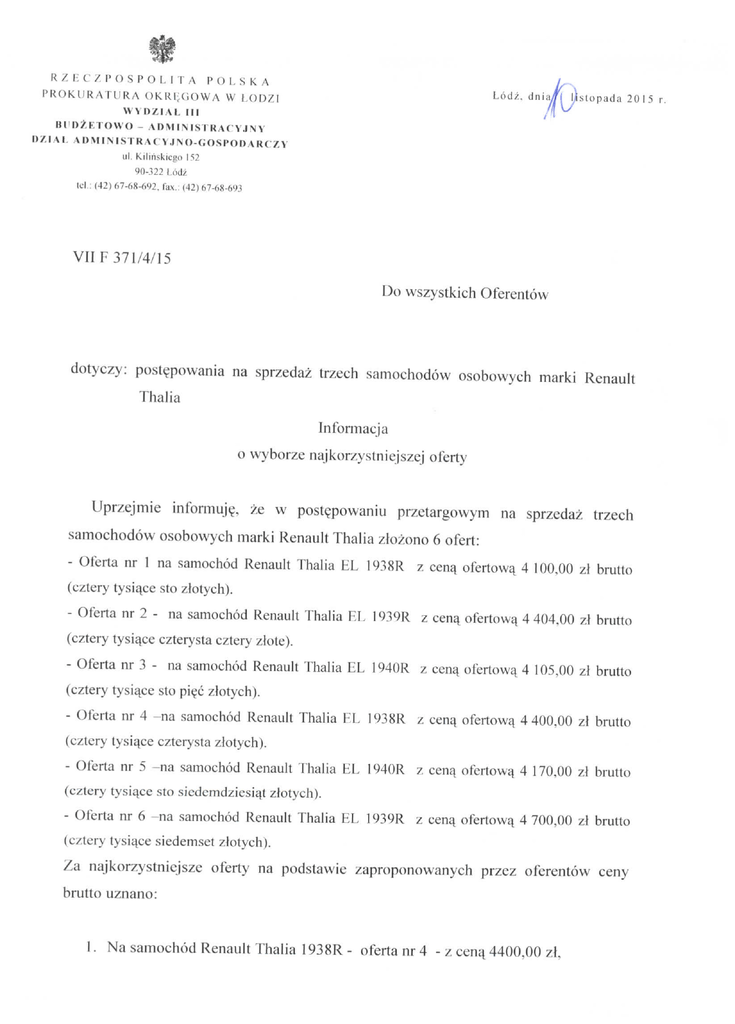 R Z E C Z P O S P O L I T A P C) I, S K A P R O K U R A T U R A O K R I - G O W A W I,ODZI Lodz, dniaffl Mstopada 2015 r. WYDZIAL III BliRZETOWO - ADMINISTRACYJNY D / . I A 1 . ADMINISTRACYJNO-GOSPODARCZY ul. Kiliriskiego 152 90-322 Udz Icl.: (42) 67-68-692, fax.: (42) 67-68-693 VII F 371/4/15 Do wszystkich Oferentovv dotyczy: post^powania na sprzedaz trzech samochodow osohowych marki Renault Thalia Inforrnacja o wyborze najkorzystniejszej oferty Uprzejmie informuj?, ze w post^powaniu przetargowym na sprzedaz trzech samochodow osobowych marki Renault Thalia zlozono 6 oferl: - Oferta nr 1 na samochod Renault Thalia EL 1938R z cen^ ofertowa^ 4 100,00 zt brutto (cztery tysiq.ce sto zfotych). - Oferta nr 2 - na samochod Renault Thalia EL 1939R z cen^ ofertowq. 4 404,00 zl brutto (cztery tysia^ce czterysta cztery zlote). - Oferta nr 3 - na samochod Renault Thalia EL 1940R z cenq. ofertow^ 4 105,00 zl brutto (cztery tysia^ce sto piec zlotych). - Oferta nr 4 -na samochod Renault Thalia EL 1938R z cenq ofertow^ 4400,00 zl brutto (cztery tysi^ce czterysta zlotych). - Oferta nr 5 -na samochod Renault Thalia EL 1940R z cen^ ofertowq. 4 170,00 zl brutto (cztery tysi^ce sto siedcmdziesiqt zlotych). - Oferta nr 6 -na samochod Renault Thalia EL 1939R z cen^. ofertow^ 4 700,00 zl brutto (cztery tysiqee siedemset zlotych). Za najkorzystniejsze oferty na podstawie zaproponowanych przez ofercntow ceny brutto uznano: I. Na samochod Renault Thalia 1938R- oferta nr 4 - z cen^4400,00 zl, 2. Na samochod Renault Thalia 1939R - oferta nr 6 - z cena, 4700,00 zl, 3. Na samochod Renault Thalia 1940R - oferta nr 5 - z cenq. 4170,00 zl Zc wzgl^du na obowiazuja^ce przepisy ustavvy z dnia 29 sierpnia 1997 roku 0 ochronie danych osobowych (j.t. Dz. U. 2014.1182 ze zm.) o wynikach konkursu 1 terminie zawarcia umowy oferenci /ostanq indywidualnie powiadomieni pisemn^. 'rokuratbr Okr^gowy xodki Krzysztof