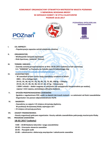 KOMUNIKAT ORGANIZACYJNY OTWARTYCH MISTRZOSTW MIASTA POZNANIA V MEMORIAŁ BOGDANA BRODY W ZAPASACH KOBIET I W STYLU KLASYCZNYM POZNAŃ 18.02.2017 I. CEL IMPREZY: - Popularyzacja zapasów wśród młodzieży szkolnej II. ORGANIZATOR: - Wielkopolski Związek Zapaśniczy - Klub Sportowy „Sobieski” Poznań III. TERMIN I MIEJSCE: - Zawody zostaną przeprowadzone w dniu 18.02.2017 (sobota) w hali sportowej K.S. ”SOBIESKI” w Poznaniu na Osiedlu Jana III Sobieskiego 22g [email protected];[email protected] UCZESTNICTWO: - W zawodach prawo startu mają zawodnicy urodzeni w latach 2001 – 03 w kategoriach 29-32, 35, 38, 42, 47, 53, 59, 66, 73, 73, 85, 100 kg – Chłopcy 29-32, 34, 37, 40, 44, 48, 52, 57, 62, 67 kg – Dziewczyny i 2004 i młodsi – dobór wagowy w zależności od umiejętności bezpośrednio po wadze), zapasy i mini zapasy, posiadający aktualne badania IV. V. SPOSÓB PRZEPROWADZENIA ZAWODÓW: Zgodnie z regulaminem PZZ, walki na dwóch lub trzech matach – w zależności od ilości zawodników Organizator nie ponosi odpowiedzialności N/W. VI. NAGRODY: - Zawodnicy za zajęcie I-III miejsca otrzymają dyplomy. W punktacji drużynowej kluby zajmujące od I – III miejsca otrzymują puchary VII. ZASADY FINANSOWANIA: - Koszty organizacji pokrywa organizator. Koszty udziału zawodników pokrywają macierzyste Kluby PROGRAM ZAWODÓW: VIII. 18.02.2017 (sobota) 9:00 – 10:00 Badania lekarskie i waga zawodników 10:30 – Uroczyste otwarcie zawodów 10:45 - Początek walk 15:00 – zakończenie z dekoracją zwycięzców i zakończenie zawodów