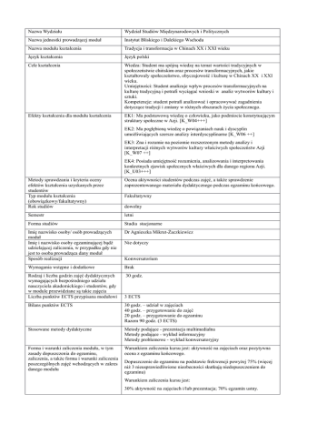 Nazwa Wydziału Wydział Studiów Międzynarodowych i Politycznych Nazwa jednostki prowadzącej moduł Instytut Bliskiego i Dalekiego Wschodu Nazwa modułu kształcenia Tradycja i transformacja w Chinach XX i XXI wieku Język kształcenia Język polski Cele kształcenia Wiedza: Student ma spójną wiedzę na temat wartości tradycyjnych w społeczeństwie chińskim oraz procesów transformacyjnych, jakie kształtowały społeczeństwo, obyczajowość i kulturę w Chinach XX i XXI wieku. Umiejętności: Student analizuje wpływ procesów transformacyjnych na kulturę tradycyjną i potrafi wyciągać wnioski w analiz wytworów kultury i sztuki. Kompetencje: student potrafi analizować i opracowywać zagadnienia dotyczące tradycji i zmiany w różnych obszarach życia społecznego. Efekty kształcenia dla modułu kształcenia EK1: Ma podstawową wiedzę o człowieku, jako podmiocie konstytuującym struktury społeczne w Azji. [K_W04+++] EK2: Ma pogłębioną wiedzę o powiązaniach nauk i dyscyplin umożliwiających szersze analizy interdyscyplinarne [K_W06 ++] EK3: Zna i rozumie na poziomie rozszerzonym metody analizy i interpretacji różnych wytworów kultury właściwych społeczeństw Azji [K_W07 ++] EK4: Posiada umiejętność rozumienia, analizowania i interpretowania konkretnych zjawisk społecznych właściwych dla danego regionu Azji. [K_U03+++] Metody sprawdzania i kryteria oceny efektów kształcenia uzyskanych przez studentów Typ modułu kształcenia (obowiązkowy/fakultatywny) Rok studiów Ocena aktywności studentów podczas zajęć, a także sprawdzenie zaprezentowanego materiału dydaktycznego podczas egzaminu końcowego. Semestr letni Forma studiów Studia stacjonarne Imię nazwisko osoby/ osób prowadzących moduł Imię i nazwisko osoby egzaminującej bądź udzielającej zaliczenia, w przypadku gdy nie jest to osoba prowadząca dany moduł Sposób realizacji Dr Agnieszka Mikrut-Żaczkiewicz Wymagania wstępne i dodatkowe Brak Rodzaj i liczba godzin zajęć dydaktycznych wymagających bezpośredniego udziału nauczyciela akademickiego i studentów, gdy w module przewidziane są takie zajęcia Liczba punktów ECTS przypisana modułowi 30 godz. Fakultatywny dowolny Nie dotyczy Konwersatorium 3 ECTS Bilans punktów ECTS 30 godz. – udział w zajęciach 40 godz. – przygotowanie do zajęć 20 godz. – przygotowanie do egzaminu Razem 90 godz. (3 ECTS) Stosowane metody dydaktyczne Metody podające - prezentacja multimedialna Metody podające - wykład informacyjny Metody problemowe - wykład konwersatoryjny Forma i warunki zaliczenia modułu, w tym zasady dopuszczenia do egzaminu, zaliczenia, a także forma i warunki zaliczenia poszczególnych zajęć wchodzących w zakres danego modułu Warunkiem zaliczenia kursu jest: aktywność na zajęciach oraz pozytywna ocena z egzaminu końcowego. Dopuszczenie do egzaminu na podstawie frekwencji powyżej 75% (więcej niż 3 nieusprawiedliwione nieobecności skutkują niedopuszczeniem do egzaminu) Warunkiem zaliczenia kursu jest: 30% aktywność na zajęciach i/lub prezentacja; 70% egzamin ustny. Ocena bardzo dobra – student aktywnie uczestniczy w zajęciach i przygotowuje się do nich, czytając lektury. Odpowiada wyczerpująco na dwa pytania egzaminującego oraz na pytanie wybrane przez siebie. Ocena dostateczna – student dostatecznie aktywnie przygotowuje się do zajęć. Odpowiada wystarczająco dobrze na jedno zadane przez egzaminującego pytanie oraz na pytanie wybrane przez siebie. Treści modułu kształcenia W czasie kursu analizowane i omawiane będą zagadnienia związane z szeroko pojętymi procesami transformacyjnymi w Chinach XX i XXI wieku oraz trwałością kultury tradycyjnej na tle przemian politycznych, społecznych i gospodarczych. Punktem wyjścia do dyskusji będzie dyskurs tradycji ze współczesnością. Proponowane zagadnienia: Wykaz literatury podstawowej i uzupełniającej, obowiązującej do zaliczenia danego modułu 1. Kultura tradycyjna a kryzys instytucji państwa na początku XX w. 2. Swingujący Szanghaj – narodziny wielokulturowej metropolii, zmiana społeczna i obyczajowa oraz ich kulturowy wymiar. 3. Nowe Chiny Mao Zedonga – przewartościowanie kultury czy twórcze wyzyskanie elementów tradycji? (obyczajowość, styl życia i emancypacja ) 4. Rewolucja Kulturalna – destrukcja tradycyjnych wartości jako niezbędny element transformacji społeczeństwa. 5. Procesy modernizacyjne a zmiana społeczna i obyczajowa. 6. „Kulturowa gorączka” - powrót do tradycji w modernizującym się społeczeństwie (literatura poszukiwania korzeni, neokonfucjanizm, fascynacja zachodnią kulturą i sztuką, xibeifeng i rock&roll) 7. Nowe millenium – czy konsumpcjonizm, zmiana obyczajowa i inne następstwa transformacji gospodarczej doprowadzą do zaniku wartości tradycyjnych? (nowe media, materializm, emancypacja, konsumpcjonizm we współczesnych Chinach) Literatura podstawowa: 1. Hung Chang-tai, Mao’s New World: Political Culture in the Early People’s Republic, Ithaca and London: Cornell University Press, 2010 2. Wakeman, Frederick, Policing Modern Shanghai., [w:]The China Quarterly, 09/1988, Volume 115, Issue 115 3. Yan Yunxiang, The Consumer Revolution in Urban China., Berkeley: University of California Press 2000 4. Zhang Xudong, On Some Motifs in the Chinese “Cultural Fever” of the Late 1980's. Social Change, Ideology, And Theory., [w:] Social Texts Summer 1994 Literatura uzupełniająca: 1. Jones Andrew, Yellow Music: Media Culture and Colonial Modernity in the Chinese Jazz Age., Londyn: Duke University Press 2001 2. Liu Kang, Media Boom and Cyber Culture, [w:] Kam Louie red. Cambridge Companion to Modern Chinese Culture, Cambridge: Cambridge University Press 2008