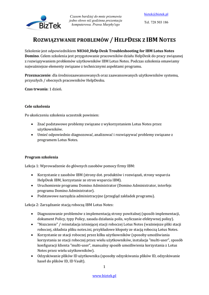 Czasem bardziej do mnie przemawia jedno s owo ni godzinna prezentacja komputerowa. Prawa Murphy'ego [email protected] Tel. 728 503 186 ROZWI ZYWANIE PROBLEMÓW / HELPDESK IBM NOTES Szkolenie jest odpowiednikiem N8360_Help Desk Troubleshooting for IBM Lotus Notes Domino Celem szkolenia jest przygotowanie pracowników dzia HelpDesk do pracy zwi zanej rozwi zywaniem problemów ytkowników IBM Lotus Notes. Podczas szkolenia omawiamy najwa niejsze elementy zwi zane technicznymi aspektami programu. Przeznaczenie dla redniozaawansowanych oraz zaawansowanych przysz ych obecnych pracowników HelpDesku. Czas trwania ytkowników systemu, dzie Cele szkolenia Po uko czeniu szkolenia uczestnik powinien: Zna podstawowe problemy zwi zane wykorzystaniem Lotus Notes przez ytkowników. Umie odpowiednio diagnozowa analizowa rozwi zywa problemy zwi zane programem Lotus Notes. Program szkolenia Lekcja 1: Wprowadzenie do ównych zasobów pomocy firmy IBM: Korzystanie zasobów IBM (strony dot. produktów rozwi za strony wsparcia HelpDesk IBM, korzystanie ze stron wsparcia IBM). Uruchomienie programu Domino Administrator (Domino Administrator, interfejs programu Domino Administrator). Podstawowe narz dzia administracyjne (przegl zak adek programu). Lekcja 2: Zarz dzanie stacj robocz IBM Lotus Notes: Diagnozowanie problemów implementacj strony powitalnej (sposób implementacji, dokument Policy, typy Policy, zasada dzia ania polis, wyliczanie efektywnej polisy). "Niszczenie" reinstalacja istniej cej stacji roboczej Lotus Notes (wa niejsze pliki stacji roboczej, sk adnia pliku notes.ini, przyk adowe opoty ze stacj robocz Lotus Notes. Korzystanie ze stacji roboczej przez kilku ytkowników (sposoby umo liwiania korzystania ze stacji roboczej przez wielu ytkowników, instalacja "multi-user", sposób konfiguracji klienta "multi-user", manualny sposób umo liwienia korzystania Lotus Notes przez wielu ytkowników). Odzyskiwanie plików ID ytkownika (sposoby odzyskiwania plików ID, odzyskiwanie hase do plików ID, ID Vault). www.biztek.pl Czasem bardziej do mnie przemawia jedno s owo ni godzinna prezentacja komputerowa. Prawa Murphy'ego [email protected] Tel. 728 503 186 Lekcja 3: Zarz dzanie prawami dost pu do aplikacji Lotus Notes: Diagnozowanie problemów dost pem dom serwera (restrykcje dost pie do serwera, rola grup, rozwi zywanie problemów dost pem do serwera, podgl przynale no ci ytkowników do grup). Okre lanie efektywnego dost pu do aplikacji Lotus Notes (mechanizm dzia ania praw dost pu do aplikacji, ACL bazy danych, dost anonimowy, poziomy praw dost pu, okre lanie efektywnego dost pu do aplikacji, role ytkowników, lista ECL). Lekcja 4: Zarz dzanie bazami danych: Od wie anie zast powanie szablonu bazy danych (ró nice pomi dzy od wie aniem zast powaniem szablonu, mechanizm zasada dzia ania). Kompaktowanie lokalnych baz danych (sposoby zarz dzania rozmiarem bazy danych, kompaktowanie baz danych, kompaktowanie lokalnych baz danych). Archiwizacja dokumentów (archiwizowanie dokumentów bazach danych, archiwizacja wiadomo ci skrzynce pocztowej, tworzenie przegl archiwum, przegl ustawie dot. archiwizowania dokumentów). Problemy dotycz ce archiwizacji wiadomo ci skrzynce pocztowej (diagnozowanie problemu, przegl danie dokumentu polisy). Lekcja 5: Rozwi zywanie problemów poczt elektroniczn Wprowadzenie do przep ywu poczty elektronicznej ("mail routing", sieci NNN, przesy anie poczty mi dzy sieciami NNN, protoko pocztowe). Rozwi zywanie problemów poczt elektroniczn odpowiadanie na zg oszone dy (kategorie dów, przyczyny wyst powania dów, raporty niepowodzeniu dor czenia poczty, odpowiadanie na raporty). Przegl danie poczty "waiting" oraz "dead" (przyczyny powstawania, przegl danie poczty, sposoby rozwi zywania problemów). Sposoby ledzenia dostarczenia poczty (okre lanie cie ki dostarczenia wiadomo ci, ledzenie wiadomo ci). ledzenie wiadomo ci ("message tracking" oraz zasada dzia ania, ststusy wiadomo ci kolejce poczty elektronicznej). Lekcja 6: Rozwi zywanie problemów poczt elektroniczn Prywatna Ksi ka Adresowa (Kontakty) rozwi zywanie problemów, zamiana szablonu "kontaktów"). Directory Catalog (cel implementacji, zasada dzia ania, rozwi zywanie problemów). Szyfrowanie wiadomo ci pocztowych (mechanizm szyfrowania podpisów cyfrowych, jak wysy "bezpieczn poczt elektroniczn ?). Rozwi zywanie problemów udost pnianiem skrzynki pocztowej, kalendarza oraz czynno ci do wykonania (delegowanie dost pu). www.biztek.pl Czasem bardziej do mnie przemawia jedno s owo ni godzinna prezentacja komputerowa. Prawa Murphy'ego [email protected] Tel. 728 503 186 Rozwi zywanie problemów us ug "Out Of Office" (zasada dzia ania, mo liwe problemy oraz rozwi zywanie problemów us ug ). Lekcja 7: Proces replikacji, problemy replikacj baz danych: Tworzenie lokalnych replik baz danych (szyfrowanie bazy danych). Definiowanie ustawie zwi zanych replikacj bazy danych, przegl ustawie Diagnozowanie problemów zwi zanych procesem replikacji (czynniki wp ywaj ce na proces replikacji, rozwi zywanie podstawowych problemów zwi zanych procesem replikacji). Konflikty replikacji (przyczyny powstawania konfliktów, zasada powstawania konfliktów "zapisu" vs. "konfliktów "replikacji", sposoby rozwi zywania problemów, post powanie konfliktami replikacji). Problemy replikacj (po stronie aplikacji, po stronie serwera) oraz ich diagnozowanie. Materia szkoleniowe uchacze otrzymuj materia szkoleniowe CD/DVD filmami demonstracyjnymi. zyku polskim, do których jest do czona www.biztek.pl yta