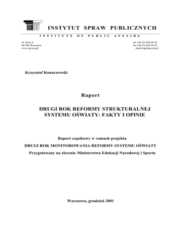 INSTYTUT SPRAW PUBLICZNYCH I N S T I T U T E O F P U B L I C A F F A I R S ul. Flory 9 00-586 Warszawa www.isp.org.pl tel. (48 22) 845 68 58 fax (48 22) 845 68 63 email:[email protected] Krzysztof Konarzewski Raport DRUGI ROK REFORMY STRUKTURALNEJ SYSTEMU OŚWIATY: FAKTY I OPINIE Raport cząstkowy w ramach projektu DRUGI ROK MONITOROWANIA REFORMY SYSTEMU OŚWIATY Przygotowany na zlecenie Ministerstwa Edukacji Narodowej i Sportu Warszawa, grudzień 2001 2 SPIS TREŚCI WPROWADZENIE ....................................................................................... 3 METODA....................................................................................................... 3 Szkoły......................................................................................................... 4 Nauczyciele ................................................................................................ 6 Uczniowie i rodzice.................................................................................... 6 FAKTY........................................................................................................... 9 Organizacja szkół ....................................................................................... 9 Siedziba ...................................................................................................... 9 Społeczne organy zarządzania szkołą ...................................................... 11 Dowożenie uczniów ................................................................................. 12 Organizacja nauczania.............................................................................. 14 Grupowanie uczniów................................................................................ 15 Nauczyciele .............................................................................................. 18 Nauczanie................................................................................................. 19 Aktywność pozalekcyjna uczniów ........................................................... 24 Opieka nad uczniem ................................................................................. 30 Zachowania naganne ................................................................................ 31 OPINIE......................................................................................................... 37 Warunki pracy i nauki .............................................................................. 37 Wyniki nauczania i wychowania.............................................................. 46 Postawy wobec gimnazjum...................................................................... 49 Aspiracje oświatowe ................................................................................ 58 PODSUMOWANIE .................................................................................... 60 Zmniejszenie kosztów bieżących ............................................................. 61 Poprawa warunków kształcenia ............................................................... 62 Zmniejszanie różnic między wsią i miastem............................................ 64 Stosunek gimnazjum do innych różnic .................................................... 65 LITERATURA CYTOWANA..................................................................... 67 3 WPROWADZENIE Polska reforma systemu oświaty jest od swego początku przedmiotem zainteresowania badaczy. W 2000 r. dzięki porozumieniu między powołanym przez Prezesa Rady Ministrów Zespołem ds. Monitorowania Reformy Systemu Edukacji, Ministerstwem Edukacji Narodowej oraz Instytutem Spraw Publicznych w Warszawie powstał program cyklicznych badań poszczególnych aspektów reformy. Pierwszy cykl badań zmierzał do opisania stanu oświaty w pierwszym roku reformy (1999/2000), w szczególności następstw: ● nowego sposobu finansowania zadań oświaty i wychowania z budżetu państwa, ● nowej pragmatyki służbowej nauczycieli, ● nowego szczebla szkolnictwa: gimnazjum, ● przekazania szkołom kontroli nad treściami kształcenia i wychowania oraz rozwoju rynku podręczników, ● nowego sposobu nadzorowania szkół i placówek oświatowych, ● nowych form doskonalenia nauczycieli. Wyniki tych badań zostały przedstawione w pracy zbiorowej Szkolnictwo w pierwszym roku reformy systemu oświaty (Konarzewski 2001). Niniejsze opracowanie jest elementem drugiego cyklu badań. Przedmiotem opracowania są następstwa reformy strukturalnej (skrócenia szkoły podstawowej do 6 klas i utworzenia 3-klasowego gimnazjum) w drugim (2000/01) i częściowo w trzecim (2001/02) roku reformy, a podstawą — badania przeprowadzone taką samą metodą jak w roku ubiegłym. Dzięki identyczności metod można nie tylko opisywać funkcjonowanie szkół podstawowych i gimnazjów, ale także sprawdzić rzetelność ubiegłorocznych wyników, a zatem i prawomocność opartych na nich wniosków. Jeśli ten sprawdzian wypadłby pomyślnie, można ponadto określać wielkość i kierunek zmian wskaźników obiektywnych i subiektywnych, jakie zaszły w ciągu roku. Replikacja badań, opis stanu i opis dynamiki szkolnictwa to trzy cele tego opracowania. METODA Badanie miało charakter reprezentacyjny. Dane pozyskano metodą ankiety zastosowanej w 6 zbiorowościach: dyrektorów i nauczycieli szkół podstawowych i gimnazjalnych, uczniów klasy II gimnazjów oraz ich rodziców. Podstawową jednostką losowania była szkoła. Operaty losowania utworzono z najnowszego wykazu szkół podstawowych i gimnazjów dla młodzieży prowadzonych przez jednost- 4 ki samorządu terytorialnego, który udostępniło Ministerstwo Edukacji Narodowej. Z wykazu wyłączono szkoły filialne, artystyczne, sportowe, przysposabiające do zawodu i specjalne. Wykaz podzielono na 4 operaty: szkół podstawowych na wsi, szkół podstawowych w miastach, gimnazjów na wsi i gimnazjów w miastach. Szkoły w każdym o