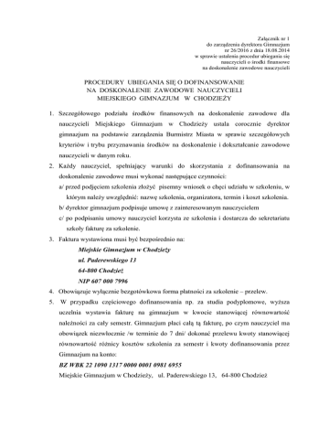 Załącznik nr 1 do zarządzenia dyrektora Gimnazjum nr 26/2016 z dnia 18.08.2014 w sprawie ustalenia procedur ubiegania się nauczycieli o środki finansowe na doskonalenie zawodowe nauczycieli PROCEDURY UBIEGANIA SIĘ O DOFINANSOWANIE NA DOSKONALENIE ZAWODOWE NAUCZYCIELI MIEJSKIEGO GIMNAZJUM W CHODZIEŻY 1. Szczegółowego podziału środków finansowych na doskonalenie zawodowe dla nauczycieli Miejskiego Gimnazjum w Chodzieży ustala corocznie dyrektor gimnazjum na podstawie zarządzenia Burmistrz Miasta w sprawie szczegółowych kryteriów i trybu przyznawania środków na doskonalenie i dokształcanie zawodowe nauczycieli w danym roku. 2. Każdy nauczyciel, spełniający warunki do skorzystania z dofinansowania na doskonalenie zawodowe musi wykonać następujące czynności: a/ przed podjęciem szkolenia złożyć pisemny wniosek o chęci udziału w szkoleniu, w którym należy uwzględnić: nazwę szkolenia, organizatora, termin i koszt szkolenia. b/ dyrektor gimnazjum podpisuje umowę z zainteresowanym nauczycielem c/ po podpisaniu umowy nauczyciel korzysta ze szkolenia i dostarcza do sekretariatu szkoły fakturę za szkolenie. 3. Faktura wystawiona musi być bezpośrednio na: Miejskie Gimnazjum w Chodzieży ul. Paderewskiego 13 64-800 Chodzież NIP 607 000 7996 4. Obowiązuje wyłącznie bezgotówkowa forma płatności za szkolenie – przelew. 5. W przypadku częściowego dofinansowania np. za studia podyplomowe, wyższa uczelnia wystawia fakturę na gimnazjum w kwocie stanowiącej równowartość należności za cały semestr. Gimnazjum płaci całą tą fakturę, po czym nauczyciel ma obowiązek niezwłocznie /w terminie do 7 dni/ dokonać przelewu kwoty stanowiącej równowartość różnicy kosztów szkolenia za semestr i kwoty dofinansowania przez Gimnazjum na konto: BZ WBK 22 1090 1317 0000 0001 0981 6955 Miejskie Gimnazjum w Chodzieży, ul. Paderewskiego 13, 64-800 Chodzież