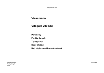Vitogate 200 EIB Viessmann Vitogate 200 EIB Parametry Punkty danych Tryby pracy Kody błędów Bajt błędu – meldowanie usterek Vitogate 200 EIB Punkty danych V.1.0 1 03.03.2008 Vitogate 200 EIB Vitocom 200 EIB umożliwia przesył danych pomiędzy regulatorami Vitotoronic pracującymi w sieci LON do systemu inteligentnych budynków KNX. Do wyboru są 34 obiekty komunikacyjne. Przesyłanie zbiorcze usterek wymaga bitu błędu (Fehlerbit) i/lub bajtu błędu określającego usterkę (Fehlerbyte). Dla każdego obiektu komunikacyjnego można ustawić następujące parametry: 1. Typ regulatora (Regelung) 2. Numer instalacji LON (Anlagen Nummer) 3. Numer odbiornika (Teilnehmer-Nummer) 4. Wybór danych dot. kotła/obiegów grzewczych (Dienst) 5. Grupa danych (Gruppe) 6. Wybór danych dostępnych z regulatora kotła (Datenpunkt) 7. Czas cyklu odczytu (Zykluszeit)*) 8. Maksymalna odchyłka od poprzednio wysłanej wartości danych (max. Abweichung gegenüber zuletzt gesendeten Wert) *) Ustawienie cyklicznego odczytu jest możliwe tylko dla punktu 32 (Datenpunkt 32). Ten punkt jest odpowiedzialny za czasowy odczyt danych regulatora. Punkty danych, które mają być zapisywanie przez EIB, powinny mieć ustawiony parametr na „nie przesyłać“ (nie senden) Aby zmniejszyć do minimum obciążenie sieci, powinno się ustawić najwyżej 16 punktów do cyklicznego przesyłu danych Vitogate 200 EIB Punkty danych V.1.0 2 03.03.2008 Vitogate 200 EIB Wybór w Menu Typ regulatora Vitotronic V050HK1W Vitotronic 050, typ HK1W, HK1S Vitotronic 200-H, typ HK1W, HK1S V050HK1M Vitotronic 050, typ HK1M Vitotronic 200-H, typ HK1M V050HK3 Vitotronic 050, typ HK3W, HK3S Vitotronic 200-H, typ HK3W, HK3S V100GC1 Vitotronic 100, typ GC1 V200GW1 Vitotronic 200, typ GW1 V300GW2 Vitotronic 300, typ GW2 V333MW1S Vitotronic 333, typ MW1, MW1S Vitotronic 300-K, typ MW1, MW1S V333MW2 Vitotronic 333, typ MW2 Vitotronic 300-K, typ MW2 VScotHC Vitotronic 100, typ HC1, HC2 VScotHO1 Vitoronic 200, typ HO1 VPlusHC Vitotronic 100, typ HC1, HC2 VPlusHO1 Vitotronic 200, Typ HO1 Vitotronic 200, typ KW6 VDensHC Vitotronic 100, typ HC1, HC2 VPendHC Vitotronic 100, typ HC1, HC2 VDensHO1 Vitoronic 200, typ HO1 VPendHO1 Vitoronic 200, typ HO1 Vitogate 200 EIB Punkty danych V.1.0 3 03.03.2008 Vitogate 200 EIB Stan Grupa Punkty danych Obsługa A1 (Bedienung A1) Betriebsdaten (Stan pracy) Tryb pracy x x x Wymagana temperatura kotła Wymagana temperatura pomieszczenia (normalna) x x x Zdalne sterowanie temperatura normalna pomieszczenia Wymagana temperatura pomieszczenia w trybie zredukowanym x x x Wymagana temperatura cwu Nachylenie krzywej grzewczej x x x x x Przesunięcie krzywej grzewczej Tryb pracy x x Obsługa M1 Obsługa M2 Obsługa M3 Informacja Stan pracy Stan pracy V050HK1W V050HK1M V050HK3 V100GC1 V200GW1 Wymagana temperatura pomieszczenia w trybie zredukowanym Wymagana temperatura cwu x x Nachylenie krzywej grzewczej Przesunięcie krzywej grzewczej x x Tryb pracy Wymagana temperatura pomieszczenia (normalna) x x Wymagana temperatura pomieszczenia w trybie zredukowanym Wymagana temperatura cwu x x Nachylenie krzywej grzewczej Przesunięcie krzywej grzewczej x x Kaskada x x x x x x x Temperatura zewnętrzna Temperatura kotła x x Wymagana temperatura pomieszczenia (normalna) Zdalne sterowanie temperatura normalna pomieszczenia Ogólne Kocioł x x x x x x x x Temperatura spalin Wyjście 20 x x x x Wyjście 29 Pompa wewnętrzna x x Palnik 1 stopień Palnik 2 stopień Vitogate 200 EIB Punkty danych V.1.0 4 03.03.2008 Vitogate 200 EIB Stan Grupa Punkty danych V050HK1W V050HK1M V050HK3 V100GC1 V200GW1 Czas pracy palnika x x x x x x Temperatura zasilania urządzenia Temperatura kotła (kocioł 1) Temperatura kotła (kocioł 2) Temperatura kotła (kocioł 3) Temperatura kotła (kocioł 4) Wyjście 29 Obieg A1 Obieg M1 Aktualny tryb pracy Temperatura zasilania x x Pompa obiegu grzewczego Aktualny tryb pracy x Obieg M2 Obieg M3 x x x x x x Temperatura zasilania Pompa obiegu grzewczego x x Aktualny tryb pracy Temperatura zasilania x x Pompa obiegu grzewczego Temperatura c.w.u. czujnik 1 x x x x x Temperatura c.w.u. czujnik 2 Pompa ładowania zasobnika x x x x x x x x Pompa cyrkulacyjna Wyjście 20 x x Temperatura zasobnika dla kolektora słonecznego Temperatura kolektora x x x x x x x x Pompa solarna Czas pracy kolektora x x x x x x x x Ilość/uzysk ciepła z kolektora Wymagana temperatura kotła (efektywna) x x Kocioł x x x x Kaskada Temperatura kotła x x Ciepła woda x x Temperatura czujnika zasobnika/ładowania/komfortu Temperatura na wypływie cwu Solar Diagnostyka Vitogate 200 EIB Punkty danych V.1.0 5 03.03.2008 Vitogate 200 EIB Stan Grupa Punkty danych Wydajność planowana kotła (efektywna) x Moc palnika Temperatura powrotu 17A x x x Temperatura powrotu 17B Temperatura wymagana zasilania urządzenia x x x x x x x x x x Konserwacja Temperatura wymagana kotła Maksymalna osiągnięta temperatura spalin Obieg A1 Obieg M1 Temperatura wymagana zasilania Wewnętrzna pompa obiegowa Obieg M2 Temperatura wymagana zasilania Temperatura wymagana zasilania włącz. DTK Obieg M3 Wewnętrzna pompa obiegowa Temperatura wymagana zasilania CWU Temperatura wymagana zasilania włącz. DTK Wymagana temperatura cwu Rozrzerzenie zewnętrzne V050HK1W V050HK1M V050HK3 V100GC1 V200GW1 x x x x x Wyjście 20 Wewnętrzna pompa obiegowa x x x x Pompa ładowania zasobnika Pompa cyrkulacyjna Vitogate 200 EIB Punkty danych V.1.0 6 03.03.2008 Vitogate 200 EIB VscotHC VplusHC VdensHC V300GW2 V333MW1S V333MW2 VPendHC VscotHO1 VplusHO1 VdensHO1 VPendHO1 Stan Grupa Punkty danych Obsługa A1 (Bedienung A1) Betriebsdaten (Stan pracy) Tryb pracy x x x Wymagana temperatura kotła Wymagana temperatura pomieszczenia (normalna) x x x Zdalne sterowanie temperatura normalna pomieszczenia Wymagana temperatura pomieszczenia w trybie zredukowanym x x x Wymagana temperatura cwu Nachylenie krzywej grzewczej x x x x x x Przesunięcie krzywej grzewczej Tryb pracy x x x x x x Wymaga