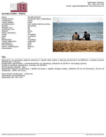 Agnieszka Chłodny tel.: 501-101-144 email: [email protected] Sprzedaż Działka - 030916 Cena: Powierzchnia: Lokalizacja: rodzaj działki: przeznaczenie: kształt: długość (m): szerokość (m): dojazd: teren uzbrojony: woda: prąd: gaz: kanalizacja: rodzaj własności: ogrodzenie: komunikacja: tereny rekreacyjne: drzewostan: 90 000,00 PLN 6 000,00 Metr kwadratowy Giżyn rolna bud. jednorodzinne;rolna; prostokąt 64 46 polny nie w pobliżu w pobliżu nie w pobliżu własność brak pks; jezioro; nie Opis Oferujemy do sprzedaży pięknie położone 2 działki obok siebie o łączniej powierzchni ok.6000m2, w pobliżu jeziora Miedwie,gm. Pyrzyce. Atrakcyjnie usytuowane, z przeznaczeniem na rekreację, położone ok.50-80 m od brzegu jeziora. Działki o kształcie regularnym, wymiary ok.92/66m. Komunikacja miejska - pks. Wspaniałe miejsce do rekreacji, z daleka od gwaru i zgiełku dużego miasta. Zaledwie 30 km od Szczecina, 20 km od Stargardu i 10km od Pyrzyc. Cena bardzo atrakcyjna - 15zł/1m2 Zapraszam na prezentację Agnieszka 501-101-144 Dokument wygenerowany przez eKomako Makler Nieruchomości Data wydruku: 2017-03-04 06:18