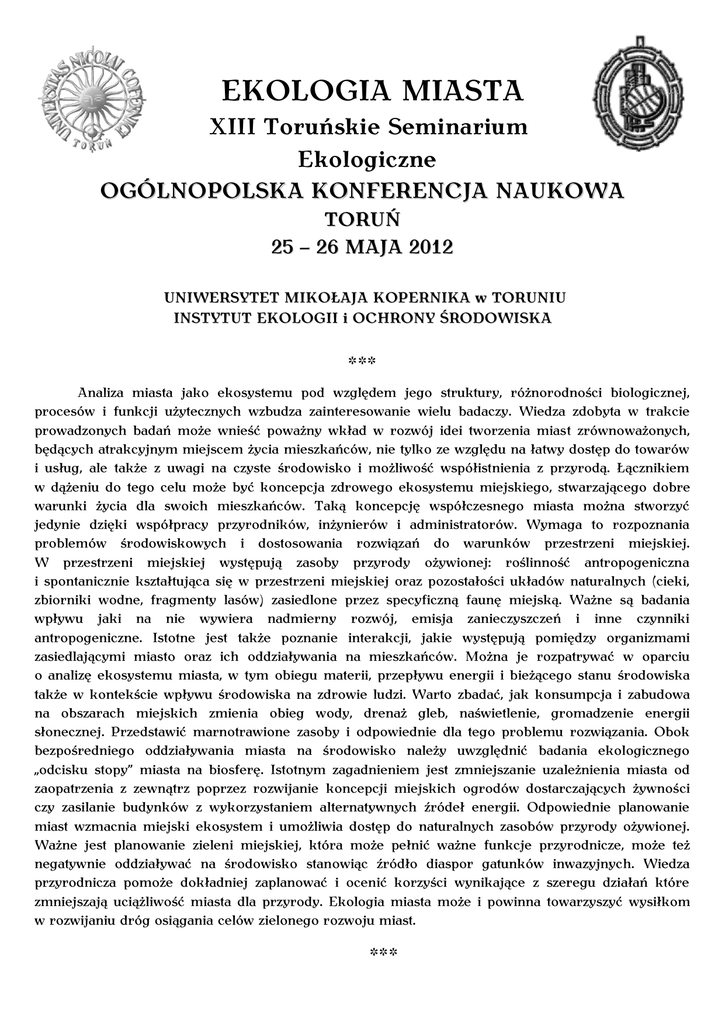 EKOLOGIA MIASTA XIII Toruńskie Seminarium Ekologiczne OGÓLNOPOLSKA KONFERENCJA NAUKOWA TORUŃ 25 – 26 MAJA 2012 UNIWERSYTET MIKOŁAJA KOPERNIKA w TORUNIU INSTYTUT EKOLOGII i OCHRONY ŚRODOWISKA *** Analiza miasta jako ekosystemu pod względem jego struktury, różnorodności biologicznej, procesów i funkcji użytecznych wzbudza zainteresowanie wielu badaczy. Wiedza zdobyta w trakcie prowadzonych badań może wnieść poważny wkład w rozwój idei tworzenia miast zrównoważonych, będących atrakcyjnym miejscem życia mieszkańców, nie tylko ze względu na łatwy dostęp do towarów i usług, ale także z uwagi na czyste środowisko i możliwość współistnienia z przyrodą. Łącznikiem w dążeniu do tego celu może być koncepcja zdrowego ekosystemu miejskiego, stwarzającego dobre warunki życia dla swoich mieszkańców. Taką koncepcję współczesnego miasta można stworzyć jedynie dzięki współpracy przyrodników, inżynierów i administratorów. Wymaga to rozpoznania problemów środowiskowych i dostosowania rozwiązań do warunków przestrzeni miejskiej. W przestrzeni miejskiej występują zasoby przyrody ożywionej: roślinność antropogeniczna i spontanicznie kształtująca się w przestrzeni miejskiej oraz pozostałości układów naturalnych (cieki, zbiorniki wodne, fragmenty lasów) zasiedlone przez specyficzną faunę miejską. Ważne są badania wpływu jaki na nie wywiera nadmierny rozwój, emisja zanieczyszczeń i inne czynniki antropogeniczne. Istotne jest także poznanie interakcji, jakie występują pomiędzy organizmami zasiedlającymi miasto oraz ich oddziaływania na mieszkańców. Można je rozpatrywać w oparciu o analizę ekosystemu miasta, w tym obiegu materii, przepływu energii i bieżącego stanu środowiska także w kontekście wpływu środowiska na zdrowie ludzi. Warto zbadać, jak konsumpcja i zabudowa na obszarach miejskich zmienia obieg wody, drenaż gleb, naświetlenie, gromadzenie energii słonecznej. Przedstawić marnotrawione zasoby i odpowiednie dla tego problemu rozwiązania. Obok bezpośredniego oddziaływania miasta na środowisko należy uwzględnić badania ekologicznego „odcisku stopy” miasta na biosferę. Istotnym zagadnieniem jest zmniejszanie uzależnienia miasta od zaopatrzenia z zewnątrz poprzez rozwijanie koncepcji miejskich ogrodów dostarczających żywności czy zasilanie budynków z wykorzystaniem alternatywnych źródeł energii. Odpowiednie planowanie miast wzmacnia miejski ekosystem i umożliwia dostęp do naturalnych zasobów przyrody ożywionej. Ważne jest planowanie zieleni miejskiej, która może pełnić ważne funkcje przyrodnicze, może też negatywnie oddziaływać na środowisko stanowiąc źródło diaspor gatunków inwazyjnych. Wiedza przyrodnicza pomoże dokładniej zaplanować i ocenić korzyści wynikające z szeregu działań które zmniejszają uciążliwość miasta dla przyrody. Ekologia miasta może i powinna towarzyszyć wysiłkom w rozwijaniu dróg osiągania celów zielonego rozwoju miast. *** KOMITET NAUKOWY: dr hab. Adam Czarnecki prof. UMK; prof. dr hab. Andrzej Nienartowicz RAMOWY PROGRAM KONFERENCJI 25 maja (PIĄTEK) Otwarcie konferencji Sesje referatowe Uroczysta kolacja 26 maja (SOBOTA) Sesje referatowe Dyskusja Nie planujemy prezentacji posterów ani sesji terenowej. KOSZTY UCZESTNICTWA: Opłata konferencyjna (obejmuje materiały konferencyjne, wspólną kolację, przerwy kawowe) - studenci, doktoranci: 250 zł - pozostali uczestnicy: 350 zł Uczestnicy we własnym zakresie pokrywają koszty dojazdu, wyżywienia i noclegów. W Instytucie, a także w jego pobliżu znajduje się wiele punktów gastronomicznych, z których mogą skorzystać uczestnicy konferencji wedle własnego uznania. Organizatorzy nie zapewniają rezerwacji miejsc noclegowych w hotelach. Najbliżej miejsca obrad położone są: Hotel Uniwersytecki, ul. Szosa Chełmińska 83a, www.umk.pl/oferty/hotel/ Hotel Aeroklubu Pomorskiego, ul. 4 Pułku Lotniczego 17, www.aeroklub.torun.pl/pl/hotel Inne przykładowe oferty dostępne są pod poniższymi adresami: www.hotelikwcentrum.pl; www.etaphotel.com; www.torun.hotelbb.pl Prosimy wziąć pod uwagę możliwość dużego obłożenia miejsc hotelowych w maju i odpowiednio wcześniej dokonać rezerwacji. WAŻNE TERMINY: Nadsyłanie zgłoszeń Wpłata wpisowego Nadsyłanie streszczeń referatów i komunikatów Termin konferencji Nadesłanie prac do publikacji 29.02.2012 r. 31.03.2012 r. 31.03.2012 r. 25-26.05.2012 r. 31.09.2012 r. Proponujemy druk tekstów wystąpień w języku angielskim w międzynarodowym czasopiśmie Ecological Questions. Nadesłane teksty poddane zostaną standardowej procedurze redakcyjnej. Formularze wstępnego zgłoszenia prosimy przesłać pocztą elektroniczną na adres sekretariatu konferencji lub wypełnić kartę uczestnictwa dostępną na stronie internetowej. Szczegółowe informacje zostaną podane w marcu 2012 r. w Komunikacie II. SEKRETARIAT KONFERENCJI: Toruńskie Seminarium Ekologiczne Instytut Ekologii i Ochrony Środowiska UMK, ul. Gagarina 9, 87-100 Toruń tel.: (56) 611 25 26 (dr Dariusz Kamiński), (56) 611 44 49, (56) 611 45 98 fax: (56) 611 44 43 e-mail: [email protected] Informacje bieżące i karta uczestnictwa na stronie internetowej: www.tse.umk.pl