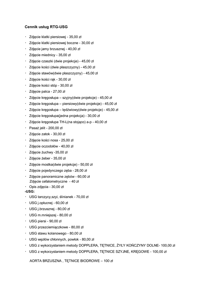Cennik usług RTG-USG Zdjęcie klatki piersiowej - 35,00 zł Zdjęcie klatki piersiowej boczne - 30,00 zł Zdjęcie jamy brzusznej - 40,00 zł Zdjęcie miednicy - 35,00 zł Zdjęcie czaszki (dwie projekcje) - 45,00 zł Zdjęcie kości (dwie płaszczyzny) - 45,00 zł Zdjęcie stawów(dwie płaszczyzny) - 45,00 zł Zdjęcie kości rąk - 30,00 zł Zdjęcie kości stóp - 30,00 zł Zdjęcie palca - 27,00 zł Zdjęcie kręgosłupa – szyjny(dwie projekcje) - 45,00 zł Zdjęcie kręgosłupa – piersiowy(dwie projekcje) - 45,00 zł Zdjęcie kręgosłupa – lędźwiowy(dwie projekcje) - 45,00 zł Zdjęcie kręgosłupa(jedna projekcja) - 30,00 zł Zdjęcie kręgosłupa TH-L(na stojąco) a-p - 40,00 zł Pasaż jelit - 200,00 zł Zdjęcie zatok - 30,00 zł Zdjęcie kości nosa - 25,00 zł Zdjęcie oczodołów - 40,00 zł Zdjęcie żuchwy -35,00 zł Zdjęcie żeber - 35,00 zł Zdjęcie mostka(dwie projekcje) - 50,00 zł Zdjęcie pojedynczego zęba - 28,00 zł Zdjęcie panoramiczne zębów - 60,00 zł Zdjęcie cefalometryczne - 40 zł Opis zdjęcia - 30,00 zł -USG: USG tarczycy,szyi, ślinianek - 70,00 zł USG j.opłucnej - 60,00 zł USG j.brzusznej - 80,00 zł USG m.mniejszej - 80,00 zł USG piersi - 90,00 zł USG przezciemiączkowe - 80,00 zł USG stawu kolanowego - 80,00 zł USG węzłów chłonnych, powłok - 80,00 zł USG z wykorzystaniem metody DOPPLERA, TĘTNICE, ŻYŁY KOŃCZYNY DOLNE- 100,00 zł USG z wykorzystaniem metody DOPPLERA, TĘTNICE SZYJNE, KRĘGOWE - 100,00 zł AORTA BRZUSZNA , TĘTNICE BIODROWE – 100 zł