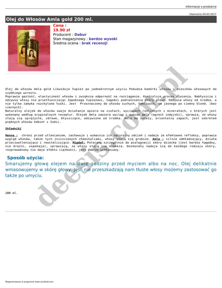 Informacje o produkcie Utworzono 04-03-2017 Olej do Włosów Amla gold 200 ml. Cena : 19.90 zł m .p l Producent : Dabur Stan magazynowy : bardzo wysoki Średnia ocena : brak recenzji .c o Olej do włosów Amla gold Likwiduje łupież po jednokrotnym użyciu Pobudza komórki włosów i mieszków włosowych do szybkiego wzrostu. Poprawia gęstość, elastyczność włosów i zwiększa odporność na rozciąganie. Kontroluje proces siwienia. Nabłyszcza i odżywia włosy nie przetłuszczając Zapobiega łupieżowi, łagodzi podrażnienia skóry głowy. Odżywia włosy od środka, a nie tylko zamyka rozchylone łuski. Jest Przeznaczony do włosów suchych, łamliwych, od jasnego po ciemny blond. (bez czarnych). Naturalny olejek do włosów swoje działanie opiera na ziołach, wyciągach roślinnych i minerałach, z których jest wykonany według oryginalnych receptur. Olejek Amla zawiera wyciąg z owoców amla (agrest indyjski), sprawia, że włosy stają się sprężyste, zdrowe, błyszczące, odżywione od środka. Amla ma świeży, orientalny zapach, jest sekretem pięknych włosów kobiet z Indii. Składniki es is Henna : chroni przed utlenianiem, zachowuje i wzmacnia ich naturalny odcień i nadaje im efektowne refleksy, poprawia wygląd włosów, także tych zniszczonych chemikaliami, włosy stają się grubsze. Amla : silnie odmładzający, działa przeciwutleniająco i rewitalizująco. Migdał: Polecany szczególnie do pielęgnacji skóry dziecka (jest bardzo łagodny, nie drażni, uspokaja), sprawiają, ze włosy stają się miękkie. Doskonały nadaje się do każdego rodzaju skóry, rozprowadzony nie daje efektu ciężkości, jest dobrze wchłaniany. 200 ml. de Sposób użycia: Smarujemy głowę olejem na dwie godziny przed myciem albo na noc. Olej delikatnie wmasowujemy w skórę głowy. Jesli nie przeszkadzają nam tłuste włosy możemy zastosować go także po umyciu. Wygenerowano w programie www.oscGold.com