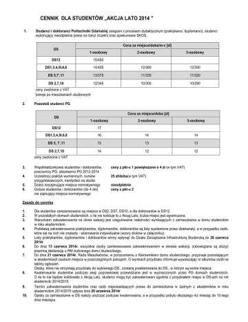 CENNIK DLA STUDENTÓW „AKCJA LATO 2014 ” 1. Studenci i doktoranci Politechniki Gdańskiej związani z procesem dydaktycznym (praktykanci, dyplomanci), studenci wykonujący nieodpłatnie prace na rzecz Uczelni oraz opiekunowie SKOS. DS Cena za miejsce/doba/m-c [zł] 1-osobowy 2-osobowy 3-osobowy DS12 15/450 DS1,3,4,5ł,6,8 14/405 12/360 12/350 DS 5,7*,11 13/375 11/330 11/320 DS 2,7,10 12/345 10/300 10/290 ceny zwolnione z VAT po mieszkaniach służbowych *pokoje 2. Pozostali studenci PG DS Cena za miejsce/doba [zł] 1-osobowy 2-osobowy 3-osobowy DS12 17 DS1,3,4,5ł,6,8 16 14 14 DS 5, 7*,11 15 13 13 DS 2,7,10 14 12 12 ceny zwolnione z VAT 3. 4. 5. 6. Współmałżonkowie studentów i doktorantów, pracownicy PG, absolwenci PG 2012-2014 Uczestnicy praktyk wymiennych, kursów przygotowawczych, kandydaci na studia Dzieci niezajmujące miejsca normatywnego Goście studentów i doktorantów (do 4 dni) nie zajmujący miejsca normatywnego ceny z pkt-u 1 powiększone o 4 zł (w tym VAT) 25 zł/doba(w tym VAT) nieodpłatnie ceny z pkt-u 2 Zasady do cennika 1. 2. 3. 4. 5. 6. 7. 8. 9. 10. Dla studentów zarezerwowane są miejsca w DS2, DS7, DS10, a dla doktorantów w DS12. W pozostałych domach studenckich, o ile nie koliduje to z Akcją Lato, liczba miejsc jest ograniczona. Warunkiem zakwaterowania na okres wakacji jest uregulowanie należności wynikających z zamieszkania w domu studenckim w roku akademickim. Podstawą zakwaterowania praktykantów, dyplomantów, doktorantów są listy wystawione przez dziekanaty, a w przypadku osób, które się na nich nie znalazły - skierowania indywidualne (wzory druków w załączniku). Listy praktykantów, dyplomantów i doktorantów winny wpłynąć do Działu Zarządzania Infrastrukturą Studencką do 26 czerwca 2014r. Do dnia 13 czerwca 2014r. wszystkie osoby zainteresowane zakwaterowaniem w okresie wakacji, zobowiązane są złożyć pisemną deklarację u RM wybranego domu studenckiego. Do dnia 21 czerwca 2014r. Rada Mieszkańców, w porozumieniu z Kierownikiem domu studenckiego, przyznaje pozostającym w akademikach osobom miejsca w poszczególnych pokojach. O wynikach przydziału informuje wywieszając nr albumów osób na tablicy ogłoszeń. Osoby, które nie otrzymają przydziału do wybranego DS., zostaną przekierowane do DS., w którym są wolne miejsca. Kwaterowanie studentów podczas sesji poprawkowej przewidziane jest w wyznaczonych przez PG domach studenckich. O ile to nie będzie kolidowało z Akcją Lato, studenci mogą być zakwaterowani zgodnie z przydziałem miejsc w DS-ach na rok akademicki 2014/2015. Termin zakwaterowania studentów oraz osób nieposiadających prawa do zamieszkania w żadnym z akademików w roku akademickim 2014/2015 upływa dnia 26 września 2014r Opłaty za zamieszkanie w DS należy uiszczać podczas kwaterowania, a w przypadku pobytu dłuższego niż miesiąc do 10-tego dnia miesiąca.