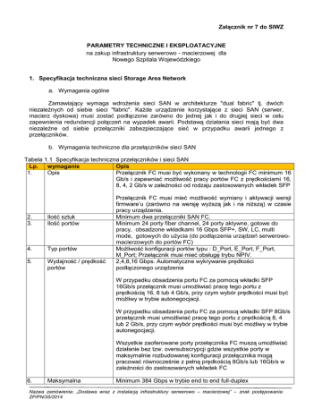 Załącznik nr 7 do SIWZ PARAMETRY TECHNICZNE I EKSPLOATACYJNE na zakup infrastruktury serwerowo - macierzowej dla Nowego Szpitala Wojewódzkiego 1. Specyfikacja techniczna sieci Storage Area Network a. Wymagania ogólne Zamawiający wymaga wdrożenia sieci SAN w architekturze "dual fabric" tj. dwóch niezależnych od siebie sieci "fabric". Każde urządzenie korzystające z sieci SAN (serwer, macierz dyskowa) musi zostać podłączone zarówno do jednej jak i do drugiej sieci w celu zapewnienia redundancji połączeń na wypadek awarii. Podstawą działania sieci mają być dwa niezależne od siebie przełączniki zabezpieczające sieć w przypadku awarii jednego z przełączników. b. Wymagania techniczne dla przełączników sieci SAN Tabela 1.1 Specyfikacja techniczna przełączników i sieci SAN Lp. wymaganie Opis 1. Opis Przełącznik FC musi być wykonany w technologii FC minimum 16 Gb/s i zapewniać możliwość pracy portów FC z prędkościami 16, 8, 4, 2 Gb/s w zależności od rodzaju zastosowanych wkładek SFP 2. 3. Ilość sztuk Ilość portów 4. Typ portów 5. Wydajność / prędkość portów Przełącznik FC musi mieć możliwość wymiany i aktywacji wersji firmware’u (zarówno na wersję wyższą jak i na niższą) w czasie pracy urządzenia. Minimum dwa przełączniki SAN FC. Minimum 24 porty fiber channel, 24 porty aktywne, gotowe do pracy, obsadzone wkładkami 16 Gbps SFP+, SW, LC, multi mode, gotowych do użycia (do podłączenia urządzeń serwerowomacierzowych do portów FC) Możliwość konfiguracji portów typu : D_Port, E_Port, F_Port, M_Port; Przełącznik musi mieć obsługę trybu NPIV. 2,4,8,16 Gbps. Automatyczne wykrywanie prędkości podłączonego urządzenia W przypadku obsadzenia portu FC za pomocą wkładki SFP 16Gb/s przełącznik musi umożliwiać pracę tego portu z prędkością 16, 8 lub 4 Gb/s, przy czym wybór prędkości musi być możliwy w trybie autonegocjacji. W przypadku obsadzenia portu FC za pomocą wkładki SFP 8Gb/s przełącznik musi umożliwiać pracę tego portu z prędkością 8, 4 lub 2 Gb/s, przy czym wybór prędkości musi być możliwy w trybie autonegocjacji. Wszystkie zaoferowane porty przełącznika FC muszą umożliwiać działanie bez tzw. oversubscrypcji gdzie wszystkie porty w maksymalnie rozbudowanej konfiguracji przełącznika mogą pracować równocześnie z pełną prędkością 8Gb/s lub 16Gb/s w zależności do zastosowanych wkładek FC 6. Maksymalna Minimum 384 Gbps w trybie end to end full-duplex Nazwa zamówienia: „Dostawa wraz z instalacją infrastruktury serwerowo – macierzowej” – znak postępowania: ZP/PN/35/2014 7. zagregowana Przepustowość przełącznika Agregacja połączeń pomiędzy przełącznikami 8. Mechanizm balansowania ruchu 9. 10. Ilość buforów Wkładki FC 11. Port USB 12. Zarządzanie 13. Diagnostyka 14. Mechanizmy bezpieczeństwa Możliwość agregacji do 8 połączeń 16 Gbps pomiędzy przełącznikami Maksymalna przepustowość : 128 Gbps dla zagregowanego połączenia 8 linków 16 Gbps. W ramach zagregowanego połączenia przełącznik musi zapewniać mechanizmy równoważenia obciążenia portów. Przełącznik FC musi wspierać mechanizm balansowania ruchu, pomiędzy różnymi połączeniami o tym samym koszcie wewnątrz wielodomenowych sieci fabric, przy czym balansowanie ruchu musi odbywać się w oparciu o 3 parametry nagłówka ramki FC: DID, SID i OXID Przełącznik FC musi zapewniać jednoczesną obsługę mechanizmów ISL Trunk oraz balansowania ruchu w oparciu o DID/SID/OXID 8192 dynamicznie alokowanych buforów Możliwość montażu i wymiany wkładek FC bez wyłączania przełącznika Obsługa wkładek : 16 Gbps SFP+, LC, SWL, LWL,ELWL 8Gbps SFP+, LC, SWL,LWL,ELWL Dostarczone wkładki muszą być oryginalne certyfikowane przez producenta przełącznika. Niedopuszczalne jest dostarczenie niecertyfikowanych przez producenta urządzenia wkładek, których montaż mógłby spowodować utratę gwarancji producenta lub jakiekolwiek problemy konfiguracyjne. Port USB umożliwiający zgranie logów przełącznika oraz wgranie nowych wersji firmware przełącznika Poprzez HTTP/HTTPS, poprzez SSH, obsługa SNMP v1/v3, możliwość wysyłania logów na zewnętrzny serwer syslog, Osobny interfejs sieciowy 10/100 Mbps Ethernet RJ-45 pozwalający na zarządzanie przełącznikiem Port szeregowy (RJ-45) pozwalający na bezpośrednie podłączenie się do przełącznika Możliwość diagnozowania z poziomu przełącznika połączeń światłowodowych, Możliwość pomiaru połączenia (prędkość, opóźnienia, dystans), wbudowany generator przepływu danych, możliwość wykonywania poleceń FC ping, Pathinfo (FC traceroute), możliwość podglądu ramek, monitorowanie stanu łącz, monitorowanie stanu urządzenia Przełącznik FC musi wspierać następujące mechanizmy zwiększające poziom bezpieczeństwa: mechanizm tzw. Fabric Binding, który umożliwia zdefiniowanie listy kontroli dostępu regulującej prawa przełączników FC do uczestnictwa w sieci fabric uwierzytelnianie (autentykacja) przełączników w sieci Fabric za pomocą FCAP uwierzytelnianie (autentykacja) urządzeń końcowych w sieci Fabric za pomocą protokołu DH-CHAP szyfrowanie połączenia z konsolą administracyjną. Wsparcie dla SSHv2. definiowanie wielu kont administratorów z możliwością ograniczenia ich uprawnień za pomocą mechanizmu tzw. RBAC (Role Based Access Control) definiowane kont administratorów w środowisku RADIUS i Nazwa zamówienia: „Dostawa wraz z instalacją infrastruktury serwerowo – macierzowej” – znak postępowania: ZP/PN/35/2014 16. Zajętość U w szafie RACK Pobór prądu 17. Zasilanie 18. Licencje na przełącznik 19. Konfiguracja przełączników 20. Dokumentacja powykonawcza 15. LDAP szyfrowanie komunikacji narzędzi administracyjnych za pomocą SSL/HTTPS obsługa SNMP v1 oraz v3 IP Filter dla portu administracyjnego przełącznika wgrywanie nowych wersji firmware 