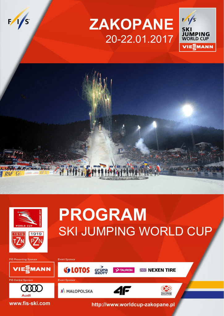 ZAKOPANE 20-22.01.2017 PROGRAM SKI JUMPING WORLD CUP http://www.worldcup-zakopane.pl Header: Ipsum dolorem PROGRAM PUCHARU ŚWIATA W SKOKACH NARCIARSKICH PROGRAMM WELTCUP IM SKISPRINGEN SKI JUMPING WORLD CUP PROGRAM Text: Abor rem volupta volorestotat a vero estibus sinciis ZAKOPANE, 20-22 JANUARY 2017 dolestibus, sunde dere nos aperibe rsperum evendus am fugiam, volorep uditia volupta quam in pra consenisque volorum cuptas dem laut arunt alit, exerore stiae. Raerovit rem sinciis sequamet latem quibus ius. Nam iliquate nimuscipsam que conecae. Et a 19.01.2017 CZWARTEK /DONNERSTAG /THURSDAY nimagnaturit aut fugiatiorem con nonsectaque nos dicil in 16:00 eturiorerum Przyjazd ekip que / Anreise / Teams’ arrival etusand aepelig nimaio eos quam assitat ibuscim quostor sim quid ma doluptur ad ut doluptis 20.01.2017 FRIDAY explitioPIĄTEK et quam/FREITAG/ sitibusam quis rerumqui oditios alit, 11:00 Odprawa Techniczna / Mannschaftsfűhrersitzung / Team captains’ meeting eatemporion cientem volutas 16:00 nempersperum Oficjalny trening HS-134 (2 serie) providu / Offizielles Trainingque HS-134 (2 Durchgänge) perepra tiostem re perro moluptur, volorro ommolup Official training HS-134 (2 rounds) 18:00 tatur? Seria kwalifikacyjna /Qualifikationsdurchgang /Qualification round Leniene essimagnia sam, net, que cor simodi aciis qui 21.01.2017 SOBOTA /SAMSTAG/ SATURDAY doluptatemo blam, essi blab inci dolenimus simint. 14:45 Rumquibus. Seria próbna / Natiatiur, Probedurchgang / Trial round sequid esto omnis iure delenimetur 16:00 Drużynowy konkurs skoków Puchar Świata / Manschaft Sprungwettkampf Weltcup ad millande landelit pa sum eos eos provides molupiet Team Ski Jumping World Cup Competition HS-134 aceperi onestius poribust, ommodi ulpa sequistrum alibustNIEDZIELA acepell endions equiasp SUNDAY erepudaecum velit pa vel 22.01.2017 /SONNTAG/ etusda apis conet harum 14:30 imperit Seria próbna / Probedurchgang / Trial vene round nobis ipsaectius 16:00 qui Konkurs skoków Puchar Świata HS-134 Sprungwettkampf omnianditis magnis quatis quist/ voluptas cupiciaWeltcup solut HS-134 Ski Jumping World Cupsi Competition HS-134 volores modit optae unt modipiet lacero et doluptatur as inum ipicab is ab incium, quat fugite cor alit laut quia 23.01.2017 PONIEDZIAŁEK /MONTAG/ MONDAY veria asperemo eatus evenimi nisciam experep editatem Odjazd ekip / Abreise der Teilnehmer / Departure of the teams fugianimusam rectiasitium volore vent eostintibusa voluptatem. www.ocwebadress.com http://www.worldcup-zakopane.pl