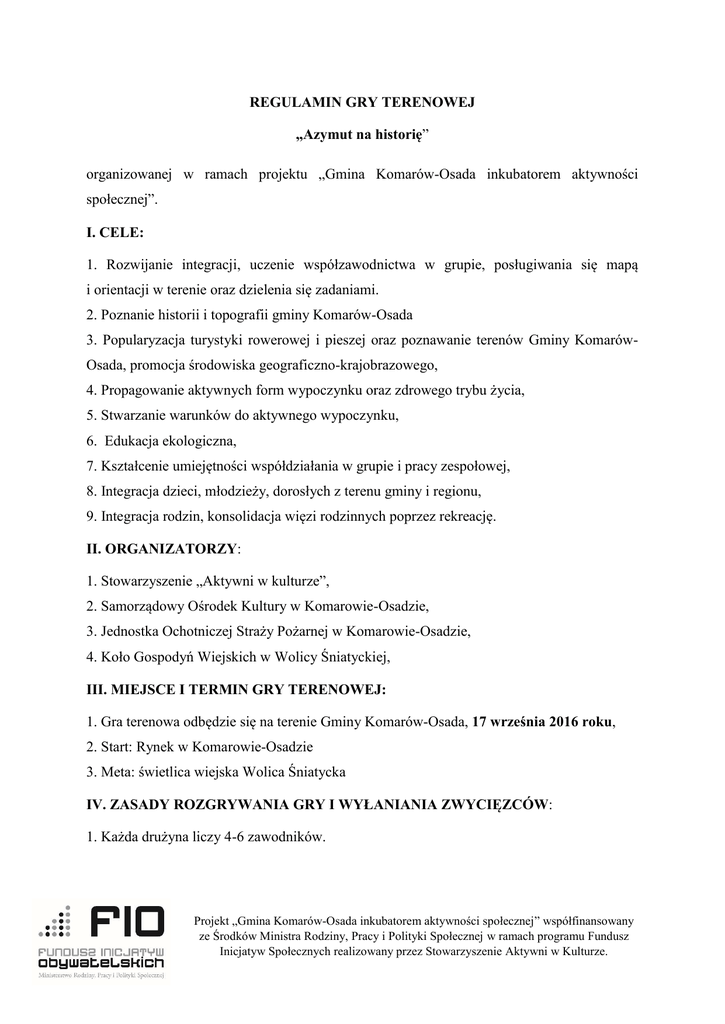REGULAMIN GRY TERENOWEJ „Azymut na historię” organizowanej w ramach projektu „Gmina Komarów-Osada inkubatorem aktywności społecznej”. I. CELE: 1. Rozwijanie integracji, uczenie współzawodnictwa w grupie, posługiwania się mapą i orientacji w terenie oraz dzielenia się zadaniami. 2. Poznanie historii i topografii gminy Komarów-Osada 3. Popularyzacja turystyki rowerowej i pieszej oraz poznawanie terenów Gminy KomarówOsada, promocja środowiska geograficzno-krajobrazowego, 4. Propagowanie aktywnych form wypoczynku oraz zdrowego trybu życia, 5. Stwarzanie warunków do aktywnego wypoczynku, 6. Edukacja ekologiczna, 7. Kształcenie umiejętności współdziałania w grupie i pracy zespołowej, 8. Integracja dzieci, młodzieży, dorosłych z terenu gminy i regionu, 9. Integracja rodzin, konsolidacja więzi rodzinnych poprzez rekreację. II. ORGANIZATORZY: 1. Stowarzyszenie „Aktywni w kulturze”, 2. Samorządowy Ośrodek Kultury w Komarowie-Osadzie, 3. Jednostka Ochotniczej Straży Pożarnej w Komarowie-Osadzie, 4. Koło Gospodyń Wiejskich w Wolicy Śniatyckiej, III. MIEJSCE I TERMIN GRY TERENOWEJ: 1. Gra terenowa odbędzie się na terenie Gminy Komarów-Osada, 17 września 2016 roku, 2. Start: Rynek w Komarowie-Osadzie 3. Meta: świetlica wiejska Wolica Śniatycka IV. ZASADY ROZGRYWANIA GRY I WYŁANIANIA ZWYCIĘZCÓW: 1. Każda drużyna liczy 4-6 zawodników. Projekt „Gmina Komarów-Osada inkubatorem aktywności społecznej” współfinansowany ze Środków Ministra Rodziny, Pracy i Polityki Społecznej w ramach programu Fundusz Inicjatyw Społecznych realizowany przez Stowarzyszenie Aktywni w Kulturze. 2. Drużyny uczestniczące w grze terenowej w oparciu o przekazane mapy wyruszają na trasę gry. Drużyna powinna mieć ze sobą kompas. Organizator na wniosek drużyny może udostępnić kompas, który należy zwrócić na mecie. 3. Przed wyjściem każda grupa otrzymuje kartę startową z wpisaną godziną wyjścia i tabelą do wpisywania punktów oraz mapę. 4. Trasa prowadzi przez teren gminy Komarów-Osada i nie jest oznaczona, na mapie są zaznaczone jedynie punkty, w których Organizator przewidział zadania do wykonania. DRUŻYNY PO TRASACH PORUSZAJĄ SIĘ NA ORIENTACJĘ, sami wytyczają trasy w oparciu o posiadane mapy i kompasy. 5. Po drodze grupy mają do wykonania zadania, za które otrzymują punkty. 6. Zadaniem drużyny jest dotarcie do wszystkich punktów kontrolnych zaznaczonych na mapie. Na poszczególnych punktach kontrolnych drużyna musi wykonać zadania przygotowane przez organizatorów. 7. Po wykonaniu zadania w poszczególnych punktach kontrolnych drużyna otrzymuje od obserwatorów ocenę w postaci punktów (max. 10 za 1 zadanie). 8. W czasie pokonywania tras planowane jest aranżowanie sytuacji zmuszających drużyny do podejmowania działań zespołowych w celu pokonywania pojawiających się trudności. Elementy zaskoczenia nie będą wchodziły w skład zadań punktowych. 9. Ocena punktowa przyznana przez obserwatorów gry jest ostateczna. 10. Warunkiem ukończenia trasy jest stawienie się drużyny w komplecie na wszystkich punktach kontrolnych oraz dotarcie na metę do godziny 17.00. 11. Pokonanie trasy rozpoczyna się w punkcie startowym (Rynek w Komarowie-Osadzie) i kończy się na mecie (świetlica wiejska Wolica Śniatycka). 12. Organizator przewiduje w każdej kategorii przyznać nagrodę główną drużynie, która zdobyła największą ilość punktów. Organizator zastrzega sobie prawo innego podziału nagród. V. WARUNKI UCZESTNICTWA: 1. Udział w grze terenowej jest bezpłatny. 2. Drużyny, których członkowie nie ukończyli 16 lat muszą mieć opiekuna, który traktowany jest, jako członek drużyny. Projekt „Gmina Komarów-Osada inkubatorem aktywności społecznej” współfinansowany ze Środków Ministra Rodziny, Pracy i Polityki Społecznej w ramach programu Fundusz Inicjatyw Społecznych realizowany przez Stowarzyszenie Aktywni w Kulturze. 3. Osoby poniżej 18 roku życia mogą wziąć udział w Grze za zgodą rodziców lub opiekunów prawnych. Wszyscy uczestnicy gry muszą złożyć najpóźniej w dniu przeprowadzenia gry oświadczenia uczestnika (w załączeniu). 4. Zgłoszenia drużyny do udziału w grze terenowej przyjmowane są wyłącznie na formularzu zgłoszeniowym (w załączeniu) dostępnym na stronie www.komarow.pl., DRUŻYNY ZGŁASZAMY DO 7 WRZEŚNIA 2016 ROKU. 5. Formularz zgłoszeniowy podpisany przez wszystkich członków drużyny należy: a. zeskanowanać i przesłać e-mailem na adres: [email protected] do dnia 7 września 2016 roku; b. w przypadku osób niepełnoletnich przesłanie zeskanowanej, podpisanej zgody rodziców lub opiekunów prawnych wraz z oświadczeniem zawodnika do dnia 7 września 2016 roku; c. formularz zgłoszeniowy i oświadczenia można złożyć osobiście: u organizatora (Stowarzyszenie Aktywni w Kulturze ul. Rynek 15, pok. nr. 16 lub 17 w budynku Urzędu Gminy); w sekretariacie Urzędu Gminy do dnia 7 września 2016 roku. 6. Organizator potwierdza udział drużyny w grze terenowej e-mailem na adres podany w formularzu zgłoszeniowym do dnia 10 września 2016 roku. 7. W dniu rozpoczęcia gry terenowej, tj. 17 września 2016 roku drużyny mają obowiązek zgłoszenie drużyny w oznakowanym Punkcie rejestracji i dostarczenie podpisanych oryginałów: karty zgłoszeniowej oraz w przypadku osób niepełnoletnich, zgody rodziców lub opiekunów prawnych wraz z oświadczeniami. 8. Dokonanie zgłoszenia drużyny jest równoznaczne ze złożeniem przez jej członków oświadczenie, iż akceptują postanowienia niniejszego regulaminu i zobowiązują się ich przestrzegać 9. W grze terenowej może brać udział maksymalnie 15 drużyn (po 5 na każdej trasie), składających się z 4-6 zawodników. Jedna osoba pełni rolę kapitana drużyny i występuje w jej imieniu. O udziale w grze decyduje kolejność zgłoszeń. Jeżeli liczba zgłoszonych drużyn będzie większa niż liczba miejsc,
