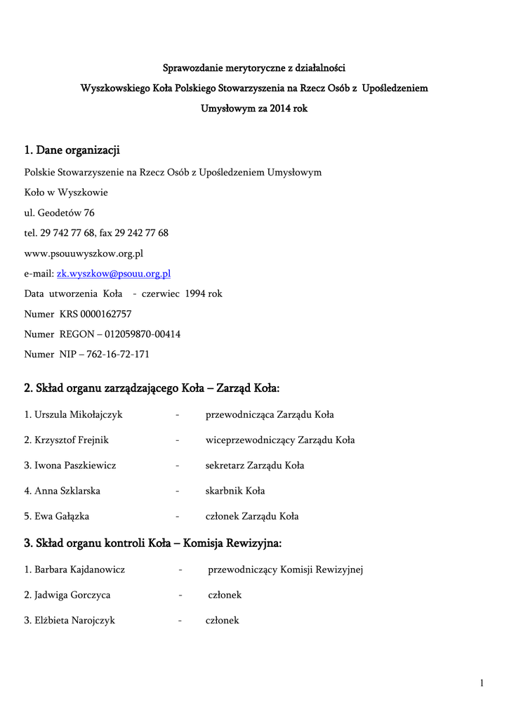 Sprawozdanie merytoryczne z działalności Wyszkowskiego Koła Polskiego Stowarzyszenia na Rzecz Osób z Upośledzeniem Umysłowym za 2014 rok 1. Dane organizacji Polskie Stowarzyszenie na Rzecz Osób z Upośledzeniem Umysłowym Koło w Wyszkowie ul. Geodetów 76 tel. 29 742 77 68, fax 29 242 77 68 www.psouuwyszkow.org.pl e-mail: [email protected] Data utworzenia Koła - czerwiec 1994 rok Numer KRS 0000162757 Numer REGON – 012059870-00414 Numer NIP – 762-16-72-171 2. Skład organu zarządzającego Koła – Zarząd Koła: 1. Urszula Mikołajczyk - przewodnicząca Zarządu Koła 2. Krzysztof Frejnik - wiceprzewodniczący Zarządu Koła 3. Iwona Paszkiewicz - sekretarz Zarządu Koła 4. Anna Szklarska - skarbnik Koła 5. Ewa Gałązka - członek Zarządu Koła 3. Skład organu kontroli Koła – Komisja Rewizyjna: 1. Barbara Kajdanowicz - przewodniczący Komisji Rewizyjnej 2. Jadwiga Gorczyca - członek 3. Elżbieta Narojczyk - członek 1 4. Cele statutowe organizacji Celem Stowarzyszenia jest: działanie na rzecz wyrównywania szans osób z upośledzeniem umysłowym, tworzenia warunków przestrzegania wobec nich praw człowieka, prowadzenia ich ku aktywnemu uczestnictwu w życiu społecznym, działanie na rzecz ochrony ich zdrowia oraz wspieranie ich rodzin Misją Stowarzyszenia jest: dbanie o godność ludzką i szczęście osób z niepełnosprawnością intelektualną, ich równoprawne miejsce w rodzinie i społeczeństwie, wspieranie rodzin z niepełnosprawnością intelektualną we wszystkich obszarach i sytuacjach życiowych, a także w ich gotowości niesienia pomocy innym. 5. Sposób realizacji celów statutowych 1) Informacje ogólne Sprawozdanie obejmuje działania prowadzone przez Koło Polskiego Stowarzyszenia na Rzecz Osób z Upośledzeniem Umysłowym w Wyszkowie w 21 roku jego istnienia, jako terenowego koła bez osobowości prawnej, ogólnopolskiej organizacji pozarządowej, niedochodowej i samopomocowej. Od 22 marca 2005r. PSOUU Zarząd Główny i Koła bez osobowości prawnej posiadają status organizacji pożytku publicznego. 2) Członkowie Koła Na dzień 31 grudnia 2014 roku w PSOUU Koło w Wyszkowie zarejestrowanych było 40 członków, w tym 38 rodziców, 1 osoba z niepełnosprawnością, 1 pracownik zatrudniony w PSOUU, nie związany rodzinnie z osobą z niepełnosprawnością. W poczet członków przyjęto 2 osoby. Z rejestru członków z powodu nie płacenia składek zostało skreślonych 9 osób, Zarząd przyjął rezygnację 1 osoby, 1 osoba zmarła. Nasi członkowie to mieszkańcy powiatu wyszkowskiego oraz dwie osoby z gminy Łochów. Na WZC zaproszono 39 członków (jedna osoba została przyjęta w roku 2015). 2 łącznie , w tym: 40 Rodzi ce/opi ekuno wie K łączni e, w tym 38 33 M osoby z niepełnosprawno ścią intelektualną, K które ukończyły 18 rok życia łącznie, w tym 5 1 2 M pracownicy zatrudnieni w PSOUU, nie będący rodzicami/opiekunami osoby niepełnosprawnej łącznie, w tym 0 1 liczba liczba członków członków inni zwyczajn , którzy K M łącznie K M yh w 2013 , w tym przyjętyc utracili h w 2012 członkost r. wo 0 1 0 0 0 2 11 3) W dniu 26 kwietnia 2014 roku odbyło się Walne Zebranie Sprawozdawczo-Wyborcze Członków. W Zebraniu na 40 uprawnionych obecne było 19 osób. Na Zebraniu podjęto, m.in. uchwały zatwierdzające sprawozdanie merytoryczne oraz finansowe z działalności Koła za 2013 rok. Przyjęto również sprawozdanie Komisji Rewizyjnej Koła. Zebranie wyraziło również opinie na temat zmiany nazwy Stowarzyszenia, przy pozostawieniu obecnego logo. Walne Zebranie Członków Koła przyjęło do realizacji następujące wnioski: 1) Budowanie tożsamości organizacyjnej członków Koła, pozyskiwanie nowych członków Koła. 2) Rozszerzenie oferty terapeutycznej aktywizującej osoby z niepełnosprawnością intelektualną, np. mieszkania treningowe, chronione. 3) Rozpowszechnianie informacji wśród innych rodziców nt. możliwości wspomagania rozwoju dzieci zagrożonych niepełnosprawnością w formie Wczesnego Wspomagania Rozwoju Dziecka. 4) Czynny udział członków Koła i ich rodzin w obchodach Jubileuszu 20-lecia Koła. 5) Dalsza współpraca z lokalnymi samorządami i instytucjami. Stan realizacji wniosków: 1) Koło nasze, jak większość tego typu stowarzyszeń ma problemy z aktywnym zaangażowaniem członków w działalność na rzecz organizacji. Od wielu lat istnieje stała kilkuosobowa grupa osób mających istotny wkład w bieżącą działalność jak i rozwój PSOUU. Podopieczni Koła i ich rodzice coraz częściej stają się klientami organizacji, korzystają z ofert Stowarzyszenia, bez przynależności do niego. Cześć rodziców rezygnuje z członkostwa, gdy ich dziecko w danym okresie życia nie korzysta z konkretnych form pomocy. Zdarza się jednak, po wielu latach braku kontaktu ze Stowarzyszeniem, składają podania o przyjęcie ich dziecka do prowadzonych przez Koło WTZ, 3 w funkcjonowanie których wkład mają przez wiele lat inni aktywni rodzice - członkowie. Działania na rzecz budowania tożsamości organizacyjnej i zwiększenia liczby członków wymagają dalszej kontynuacji i pracy od podstaw. Dlatego też, m.in. w swojej działalności Koło nie zamyka się wyłącznie do swoich członków. W roku 2014 zarówno nasi członkowie jak i rodzice, którzy nie przynależą do naszej organizacji mieli możliwość uczestniczenia w organizowanych przez Koło szkoleniach, imprezach integracyjnych, wycieczce. 2) Pod koniec 2014 roku - przewodnicząca Z.K. i kierownik WTZ - przystąpili do opracowania wstępnej koncepcji utworzenia i funkcjonowania mieszkań chronionych treningowych oraz możliwości powołania spółdzielni socjalnej przez podmioty prawne. W miesiącu lutym już bieżącego roku spotkaliśmy się w tej sprawie z panią zastępcą burmistrza Wyszkowa i dyrektor OPS w Wyszkowie. 3) W prowadzonym przez Koło Ośrodku Rehabilitacyjno-Edukacyjno-Wychowawczym od ponad trzech lat rea