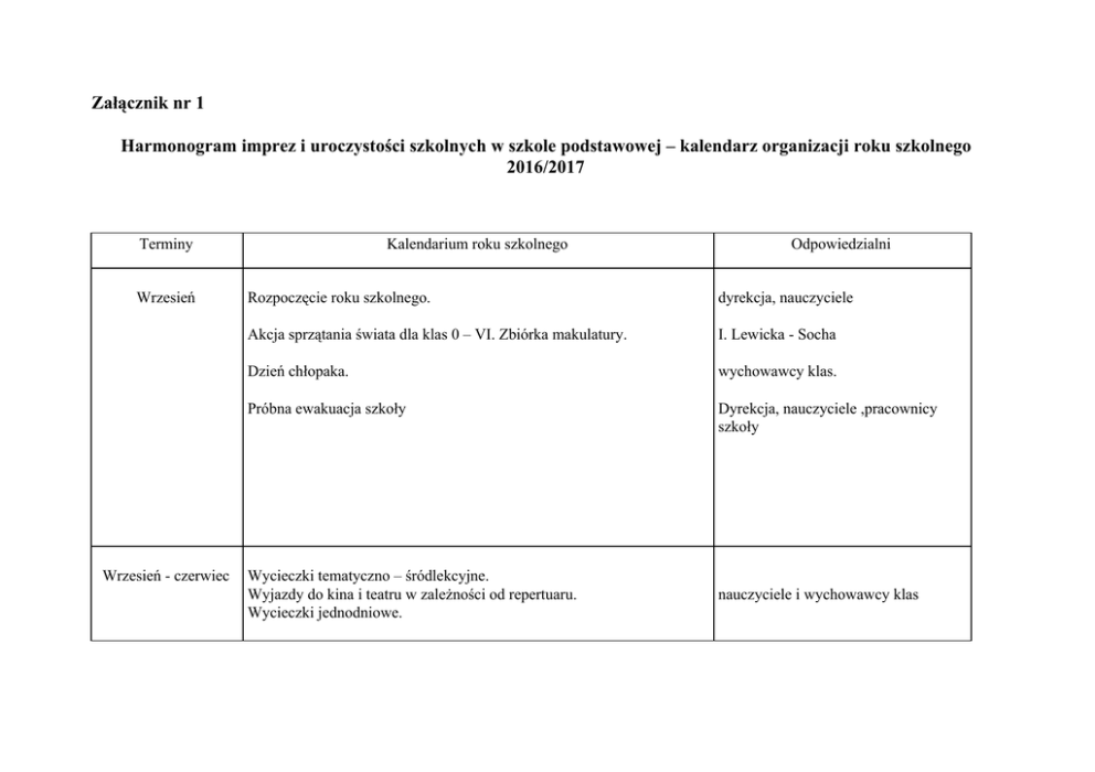 Załącznik nr 1 Harmonogram imprez i uroczystości szkolnych w szkole podstawowej – kalendarz organizacji roku szkolnego 2016/2017 Terminy Wrzesień Wrzesień - czerwiec Kalendarium roku szkolnego Odpowiedzialni Rozpoczęcie roku szkolnego. dyrekcja, nauczyciele Akcja sprzątania świata dla klas 0 – VI. Zbiórka makulatury. I. Lewicka - Socha Dzień chłopaka. wychowawcy klas. Próbna ewakuacja szkoły Dyrekcja, nauczyciele ,pracownicy szkoły Wycieczki tematyczno – śródlekcyjne. Wyjazdy do kina i teatru w zależności od repertuaru. Wycieczki jednodniowe. nauczyciele i wychowawcy klas Październik Październik – kwiecień listopad listopad - styczeń Grudzień Ślubowanie pierwszych klas. A. Łukowicz, samorząd. Pole Nadziei. A. Syldatk Prelekcja nt. „Rozwój mowy” - rodzice klas 0,I. Logopeda Wróżby i zabawy andrzejkowe. wychowawcy klas Zabawa andrzejkowa IV – VI. A. Łukowicz, samorząd Dzień życzliwości i pozdrowień. pedagog Szlachetna paczka A. Syldatk Turniej gimnastyczny K. Orzechowska Mikołajki klasowe. wychowawcy klas Wigilie klasowe. wychowawcy klas Kiermasz świąteczny. wszyscy pracownicy szkoły styczeń Dzień Babci i Dziadka. wychowawcy klas 0 – III Zabawa karnawałowa dla klas 0- III. wychowawcy klas 0 – III Dyskoteka dla klas IV- VI. A. Łukowicz, samorząd ,wychowawcy Ferie zimowe. luty marzec WOŚP (Wielka Orkiestra Świątecznej Pomocy). A. Syldatk Klasowe Walentynki. Poczta Walentynkowa. wychowawcy klas A.Syldatk Rekolekcje Wielkopostne. wychowawcy ,nauczyciele, katecheci, ksiądz Pedagog. Dzień Profilaktyki. Przerwa świąteczna. kwiecień maj czerwiec Akcja „Żonkil” - pole nadziei. A. Syldatk Dzień Ziemi I .Lewicka – Socha, pracownicy szkoły Dzień Dziecka – konkursy i zawody sportowe. Wyjazd klas 0 – III do Sarniego Dworu w Somoninie. III Spotkanie Podróżnicze(kl. IV – VI). Dzień Matki i Ojca ( kl. 0 – II). Wycieczki jedno i kilkudniowe. Festyn rodzinny. Udział w ogólnopolskiej kampanii „ Bezpieczne wakacje”. Zakończenie zajęć. wychowawcy klas B. Plicht. wychowawcy kl.0 – II. nauczyciele, wychowawcy wszyscy pracownicy szkoły pedagog dyrekcja, nauczyciele