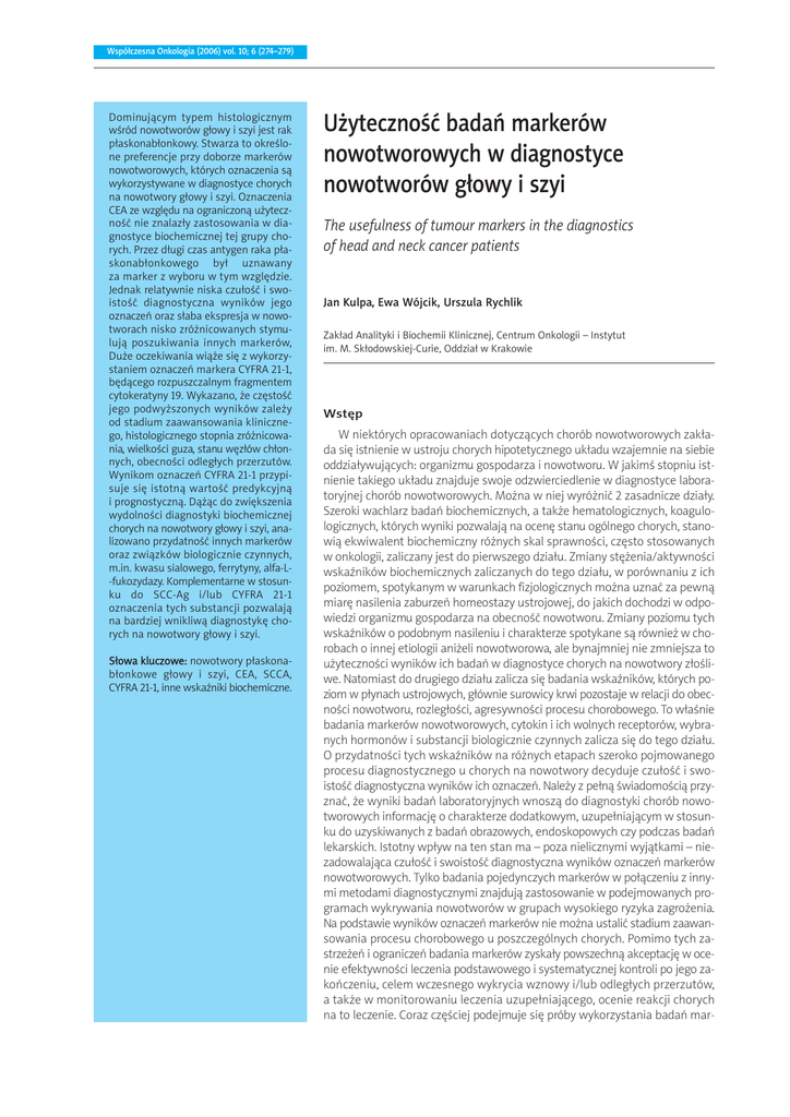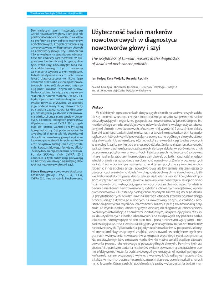 Współczesna Onkologia (2006) vol. 10; 6 (274–279) Dominującym typem histologicznym wśród nowotworów głowy i szyi jest rak płaskonabłonkowy. Stwarza to określone preferencje przy doborze markerów nowotworowych, których oznaczenia są wykorzystywane w diagnostyce chorych na nowotwory głowy i szyi. Oznaczenia CEA ze względu na ograniczoną użyteczność nie znalazły zastosowania w diagnostyce biochemicznej tej grupy chorych. Przez długi czas antygen raka płaskonabłonkowego był uznawany za marker z wyboru w tym względzie. Jednak relatywnie niska czułość i swoistość diagnostyczna wyników jego oznaczeń oraz słaba ekspresja w nowotworach nisko zróżnicowanych stymulują poszukiwania innych markerów, Duże oczekiwania wiąże się z wykorzystaniem oznaczeń markera CYFRA 21-1, będącego rozpuszczalnym fragmentem cytokeratyny 19. Wykazano, że częstość jego podwyższonych wyników zależy od stadium zaawansowania klinicznego, histologicznego stopnia zróżnicowania, wielkości guza, stanu węzłów chłonnych, obecności odległych przerzutów. Wynikom oznaczeń CYFRA 21-1 przypisuje się istotną wartość predykcyjną i prognostyczną. Dążąc do zwiększenia wydolności diagnostyki biochemicznej chorych na nowotwory głowy i szyi, analizowano przydatność innych markerów oraz związków biologicznie czynnych, m.in. kwasu sialowego, ferrytyny, alfa-L-fukozydazy. Komplementarne w stosunku do SCC-Ag i/lub CYFRA 21-1 oznaczenia tych substancji pozwalają na bardziej wnikliwą diagnostykę chorych na nowotwory głowy i szyi. Słowa kluczowe: nowotwory płaskonabłonkowe głowy i szyi, CEA, SCCA, CYFRA 21-1, inne wskaźniki biochemiczne. Użyteczność badań markerów nowotworowych w diagnostyce nowotworów głowy i szyi The usefulness of tumour markers in the diagnostics of head and neck cancer patients Jan Kulpa, Ewa Wójcik, Urszula Rychlik Zakład Analityki i Biochemii Klinicznej, Centrum Onkologii – Instytut im. M. Skłodowskiej-Curie, Oddział w Krakowie Wstęp W niektórych opracowaniach dotyczących chorób nowotworowych zakłada się istnienie w ustroju chorych hipotetycznego układu wzajemnie na siebie oddziaływujących: organizmu gospodarza i nowotworu. W jakimś stopniu istnienie takiego układu znajduje swoje odzwierciedlenie w diagnostyce laboratoryjnej chorób nowotworowych. Można w niej wyróżnić 2 zasadnicze działy. Szeroki wachlarz badań biochemicznych, a także hematologicznych, koagulologicznych, których wyniki pozwalają na ocenę stanu ogólnego chorych, stanowią ekwiwalent biochemiczny różnych skal sprawności, często stosowanych w onkologii, zaliczany jest do pierwszego działu. Zmiany stężenia/aktywności wskaźników biochemicznych zaliczanych do tego działu, w porównaniu z ich poziomem, spotykanym w warunkach fizjologicznych można uznać za pewną miarę nasilenia zaburzeń homeostazy ustrojowej, do jakich dochodzi w odpowiedzi organizmu gospodarza na obecność nowotworu. Zmiany poziomu tych wskaźników o podobnym nasileniu i charakterze spotykane są również w chorobach o innej etiologii aniżeli nowotworowa, ale bynajmniej nie zmniejsza to użyteczności wyników ich badań w diagnostyce chorych na nowotwory złośliwe. Natomiast do drugiego działu zalicza się badania wskaźników, których poziom w płynach ustrojowych, głównie surowicy krwi pozostaje w relacji do obecności nowotworu, rozległości, agresywności procesu chorobowego. To właśnie badania markerów nowotworowych, cytokin i ich wolnych receptorów, wybranych hormonów i substancji biologicznie czynnych zalicza się do tego działu. O przydatności tych wskaźników na różnych etapach szeroko pojmowanego procesu diagnostycznego u chorych na nowotwory decyduje czułość i swoistość diagnostyczna wyników ich oznaczeń. Należy z pełną świadomością przyznać, że wyniki badań laboratoryjnych wnoszą do diagnostyki chorób nowotworowych informację o charakterze dodatkowym, uzupełniającym w stosunku do uzyskiwanych z badań obrazowych, endoskopowych czy podczas badań lekarskich. Istotny wpływ na ten stan ma – poza nielicznymi wyjątkami – niezadowalająca czułość i swoistość diagnostyczna wyników oznaczeń markerów nowotworowych. Tylko badania pojedynczych markerów w połączeniu z innymi metodami diagnostycznymi znajdują zastosowanie w podejmowanych programach wykrywania nowotworów w grupach wysokiego ryzyka zagrożenia. Na podstawie wyników oznaczeń markerów nie można ustalić stadium zaawansowania procesu chorobowego u poszczególnych chorych. Pomimo tych zastrzeżeń i ograniczeń badania markerów zyskały powszechną akceptację w ocenie efektywności leczenia podstawowego i systematycznej kontroli po jego zakończeniu, celem wczesnego wykrycia wznowy i/lub odległych przerzutów, a także w monitorowaniu leczenia uzupełniającego, ocenie reakcji chorych na to leczenie. Coraz częściej podejmuje się próby wykorzystania badań mar- Współczesna Onkologia (2006) vol. 10; 6 (274–279) The dominating histological type among head and neck tumours is squamous cell carcinoma. This creates specific preferences in choosing tumour markers determined for diagnosing head and neck cancer patients. Due to their limited usability, CEA determinations have not been employed in the biochemical diagnostics of this group of patients. For a long time, the squamous cell carcinoma antigen was considered to be a marker of choice in this respect. However, the relatively low sensibility and diagnostic specificity of the results of its determination, as well as low expression in poorly differentiated tumours, stimulate search for other markers. Large expectations are associated with the determination of CYFRA 21-1 which is a soluble fragment of cytokeratin 19. It has been shown that the frequency of its elevated levels depends on the clinical stage, histological differentiation, tumour size, nodal status and presence of dist