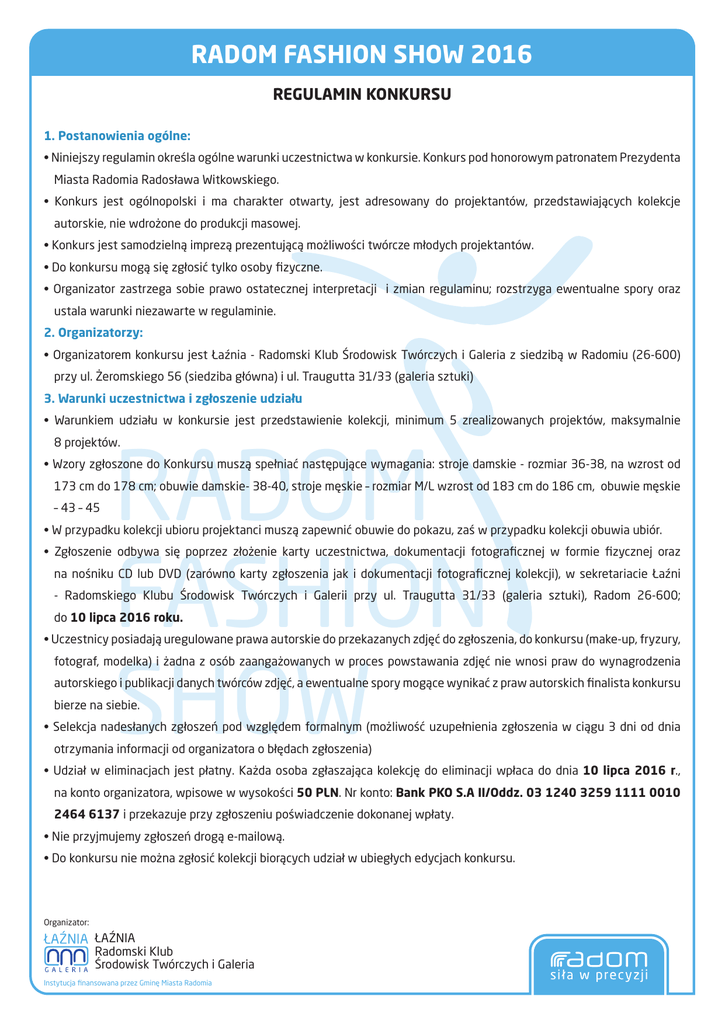 RADOM FASHION SHOW 2016 REGULAMIN KONKURSU 1. Postanowienia ogólne: • Niniejszy regulamin określa ogólne warunki uczestnictwa w konkursie. Konkurs pod honorowym patronatem Prezydenta Miasta Radomia Radosława Witkowskiego. • Konkurs jest ogólnopolski i ma charakter otwarty, jest adresowany do projektantów, przedstawiających kolekcje autorskie, nie wdrożone do produkcji masowej. • Konkurs jest samodzielną imprezą prezentującą możliwości twórcze młodych projektantów. • Do konkursu mogą się zgłosić tylko osoby fizyczne. • Organizator zastrzega sobie prawo ostatecznej interpretacji i zmian regulaminu; rozstrzyga ewentualne spory oraz ustala warunki niezawarte w regulaminie. 2. Organizatorzy: • Organizatorem konkursu jest Łaźnia - Radomski Klub Środowisk Twórczych i Galeria z siedzibą w Radomiu (26-600) przy ul. Żeromskiego 56 (siedziba główna) i ul. Traugutta 31/33 (galeria sztuki) 3. Warunki uczestnictwa i zgłoszenie udziału • Warunkiem udziału w konkursie jest przedstawienie kolekcji, minimum 5 zrealizowanych projektów, maksymalnie RADOM FASHION SHOW 8 projektów. • Wzory zgłoszone do Konkursu muszą spełniać następujące wymagania: stroje damskie - rozmiar 36-38, na wzrost od 173 cm do 178 cm; obuwie damskie- 38-40, stroje męskie – rozmiar M/L wzrost od 183 cm do 186 cm, obuwie męskie – 43 – 45 • W przypadku kolekcji ubioru projektanci muszą zapewnić obuwie do pokazu, zaś w przypadku kolekcji obuwia ubiór. • Zgłoszenie odbywa się poprzez złożenie karty uczestnictwa, dokumentacji fotograficznej w formie fizycznej oraz na nośniku CD lub DVD (zarówno karty zgłoszenia jak i dokumentacji fotograficznej kolekcji), w sekretariacie Łaźni - Radomskiego Klubu Środowisk Twórczych i Galerii przy ul. Traugutta 31/33 (galeria sztuki), Radom 26-600; do 10 lipca 2016 roku. • Uczestnicy posiadają uregulowane prawa autorskie do przekazanych zdjęć do zgłoszenia, do konkursu (make-up, fryzury, fotograf, modelka) i żadna z osób zaangażowanych w proces powstawania zdjęć nie wnosi praw do wynagrodzenia autorskiego i publikacji danych twórców zdjęć, a ewentualne spory mogące wynikać z praw autorskich finalista konkursu bierze na siebie. • Selekcja nadesłanych zgłoszeń pod względem formalnym (możliwość uzupełnienia zgłoszenia w ciągu 3 dni od dnia otrzymania informacji od organizatora o błędach zgłoszenia) • Udział w eliminacjach jest płatny. Każda osoba zgłaszająca kolekcję do eliminacji wpłaca do dnia 10 lipca 2016 r., na konto organizatora, wpisowe w wysokości 50 PLN. Nr konto: Bank PKO S.A II/Oddz. 03 1240 3259 1111 0010 2464 6137 i przekazuje przy zgłoszeniu poświadczenie dokonanej wpłaty. • Nie przyjmujemy zgłoszeń drogą e-mailową. • Do konkursu nie można zgłosić kolekcji biorących udział w ubiegłych edycjach konkursu. Organizator: ŁAŹNIA Radomski Klub Środowisk Twórczych i Galeria Instytucja finansowana przez Gminę Miasta Radomia RADOM FASHION SHOW 2016 REGULAMIN KONKURSU 4. Jury konkursu: • Do oceny prezentacji zostanie powołana komisja Jury, która oceni zgłoszone prace pod względem: zgodności z obowiązującymi trendami mody, techniki i perfekcji wykonania, kreatywności, innowacyjności, przekazu artystycznego. 5. Kolejne etapy konkursu: • Składanie zgłoszeń i materiałów - 10 lipca 2016 r. • Przekazanie materiałów i zgłoszeń jurorom oraz ich wstępna ocena (umieszczenie ich na stronie internetowej głównego organizatora: www.laznia-radom.pl) – 29 lipca 2016 r. • Preselekcja - mająca na celu wyłonienie kolekcji biorących udział w finale Konkursu – 1 sierpnia 2016 r. • Finał konkursu - 13 sierpnia 2016 r. - pokaz konkursowy oraz ogłoszenie wyników finału. 6. Nagrody: • Jury wybierze laureatów, którzy wezmą udział w Pokazie Galowym. • Spośród laureatów przyzna nagrody pieniężne za I miejsce – 5000 zł, II miejsce – 2000 zł i III miejsce – 1000 zł oraz możliwe są wyróżnienia i nagrody specjalne. • Jury zastrzega sobie prawo do zmian. RADOM FASHION SHOW 7. Warunki udziału w Pokazie Galowym - finale konkursu: • W finale konkursu biorą udział laureaci wybrani podczas preselekcji, przez komisję jury. • Finaliści Konkursu zobowiązani są dostarczyć kolekcje wraz z akcesoriami w terminie określonym przez Realizatora Pokazu. • Organizator rozstrzyga spory i ustala warunki (zarówno organizacji finału, jak i konkursu) nie zawarte w regulaminie. 8. Informacje dodatkowe dla uczestników konkursu: • Organizatorem Pokazu Finałowego jest Organizator Konkursu • Zgłoszenia do Konkursu powinny zawierać: - Kartę zgłoszenia wypełnioną drukowanymi literami w formie papierowej i elektronicznej na płycie CD / DVD - Dokumentację fotograficzną kolekcji w formie fizycznej oraz elektronicznej na płycie CD / DVD -Kopię dowodu wpłaty • Zgłoszenia powinny być wypełnione według wzoru. Karty zgłoszenia niepełne lub wypełnione nieprawidłowo muszą zostać uzupełnione po selekcji formalnej w ciągu 3 dni od uzyskania informacji o błędach formalnych w karcie zgłoszenia. • Biuro Konkursu niezwłocznie powiadomi osoby, które zakwalifikowały się do finału Konkursu. Wpłat za udział w Konkursie należy dokonać na konto Organizatora: • Łaźnia – Radomski Klub Środowisk Twórczych i Galeria, ul. Żeromskiego 56, 26-600 Radom, Bank PKO S.A II/ Oddz. 03 1240 3259 1111 0010 2464 6137 w nieprzekraczalnym terminie określonym w Regulaminie. • Okazanie dowodu wpłaty warunkuje przyjęcie kolekcji do eliminacji oraz pokazu finałowego. • Organizator Konkursu zapewnia realizację pokazu finałowego konkursu. • Za scenariusz pokazu, oprawę muzyczną i zapewnienie modelek pełną odpowiedzialność przejmuje Organizator pokazu finałowego. Organizator: ŁAŹNIA Radomski Klub Środowisk Twórczych i Galeria Instytucja finansowana przez Gminę Miasta Radomia RADOM FASHION SHOW 2016 REGULA