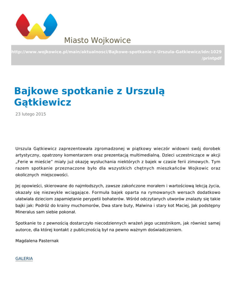 Miasto Wojkowice http://www.wojkowice.pl/main/aktualnosci/Bajkowe-spotkanie-z-Urszula-Gatkiewicz/idn:1029 /printpdf Bajkowe spotkanie z Urszulą Gątkiewicz 23 lutego 2015 kategoria: Wojkowice Urszula Gątkiewicz zaprezentowała zgromadzonej w piątkowy wieczór widowni swój dorobek artystyczny, opatrzony komentarzem oraz prezentacją multimedialną. Dzieci uczestniczące w akcji „Ferie w mieście” miały już okazję wysłuchania niektórych z bajek w czasie ferii zimowych. Tym razem spotkanie przeznaczone było dla wszystkich chętnych mieszkańców Wojkowic oraz okolicznych miejscowości. Jej opowieści, skierowane do najmłodszych, zawsze zakończone morałem i wartościową lekcją życia, okazały się niezwykle wciągające. Formuła bajek oparta na rymowanych wersach dodatkowo ułatwiała dzieciom zapamiętanie perypetii bohaterów. Wśród odczytanych utworów znalazły się takie bajki jak: Podróż do krainy muchomorów, Dwa stare buty, Malwina i stary kot Maciej, Jak podstępny Mineralus sam siebie pokonał. Spotkanie to z pewnością dostarczyło niecodziennych wrażeń jego uczestnikom, jak również samej autorce, dla której kontakt z publicznością był na pewno ważnym doświadczeniem. Magdalena Pasternak GALERIA