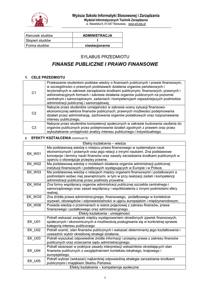Wyższa Szkoła Informatyki Stosowanej i Zarządzania Wydział Informatycznych Technik Zarządzania ul. Newelska 6, 01-447 Warszawa, www.wit.edu.pl ______________________________________________________________________________ Kierunek studiów Stopień studiów Forma studiów ADMINISTRACJA I niestacjonarne SYLABUS PRZEDMIOTU FINANSE PUBLICZNE I PRAWO FINANSOWE 1. CELE PRZEDMIOTU C1 C2 C3 2. Przekazanie studentom podstaw wiedzy o finansach publicznych i prawie finansowym, w szczególności o prawnych podstawach działania organów państwowych i terytorialnych w zakresie zarządzania środkami publicznymi, finansowych, prawnych i administracyjnych formach i zakresie działania organów publicznych na poziomie centralnym i samorządowym, zadaniach i kompetencjach najważniejszych podmiotów administracji publicznej i samorządowej, Nabycie przez studentów umiejętności w zakresie oceny sytuacji finansowoekonomicznej sektora finansów publicznych, prawnych możliwości podejmowania działań przez administrację, zachowania organów podatkowych oraz rozpoznawania interesu publicznego, Nabycie przez studentów kompetencji społecznych w zakresie budowania zaufania do organów publicznych przez podejmowanie działań zgodnych z prawem oraz przez wykształcenie umiejętność analizy interesu publicznego i indywidualnego. EFEKTY KSZTAŁCENIA (minimum 5) EK_W01 EK_W02 EK_W03 EK_W04 EK_WO5 EK_W06 EK_U01 EK_U02 EK_U03 EK_U04 EK_U05 Efekty kształcenia – wiedza Ma podstawową wiedzę o miejscu prawa finansowego w systematyce nauk ekonomicznych i prawnych oraz jego relacji z innymi naukami. Zna podstawowe koncepcje i terminy nauki finansów oraz zasady zarzadzania środkami publicznych w oparciu o obowiązuje przepisy prawne, Ma podstawową wiedzę o modelach działania organów administracji publicznej instytucji finansowych i podatkowych występujących w Europie i w Polsce, Ma podstawową wiedzę o relacjach między organami finansowymi i podatkowymi a podmiotami wobec niej zewnętrznymi, w tym w przy realizacji zadań i kompetencji administracji publicznej przez podmioty prywatne. Zna formy współpracy organów administracji publicznej szczebla centralnego i samorządowego oraz zasad współpracy i współdziałania z innymi podmiotami sfery realnej, Zna źródła prawa administracyjnego, finansowego, podatkowego w kontekście wyzwań, obowiązków i odpowiedzialności w ujęciu europejskim i międzynarodowym, Posiada wiedzę o przemianach w siatce pojęciowej z zakresu finansów, prawa finansowego i podatkowego oraz administracyjnego. Efekty kształcenia - umiejętności Potrafi wskazać związek między występowaniem określonych zjawisk finansowych, społecznych i ekonomicznych a możliwością posługiwania się w konkretnej sprawie kategorią interesu publicznego Potrafi ocenić, stan finansów publicznych i wskazać determinanty jego kształtowania i uzasadnić wybór określonej strategii działania, Potrafi wyszukać odpowiednie źródła informacji i przepisy prawa z zakresu finansów publicznych oraz orzeczenie sądu administracyjnego, Potrafi stosować w praktyce zasady interpretacji wskaźników określających stan finansów publicznych z uwzględnieniem kontekstu lokalnego, krajowego i europejskiego, Potrafi wybrać (wskazać) najbardziej odpowiednią strategie zarzadzania środkami publicznymi i majątkiem Skarbu Państwa. Efekty kształcenia – kompetencje społeczne 1 Wyższa Szkoła Informatyki Stosowanej i Zarządzania Wydział Informatycznych Technik Zarządzania ul. Newelska 6, 01-447 Warszawa, www.wit.edu.pl ______________________________________________________________________________ Rozumie potrzebę stałego uaktualniania wiedzy o stanie finansów publicznych i czynników, determinant określających ten stan, Potrafi odróżnić zwykły interes społeczny od interesu prywatnego w oparciu o dostępne dane i informacje publiczne. Rozumie potrzebę ważenia sprzecznych interesów różnych podmiotów działających pod rządami prawa administracyjnego, finansowego i podatkowego. EK_K01 EK_K02 EK_K03 3. TREŚCI PROGRAMOWE Lp. TP1 TP2 TP3 TP4 TP5 TP6 Liczba godzin w c k Tematyka Pojęcie finansów publicznych • Funkcje finansów publicznych • Pojęcie i charakter prawa finansowego • Źródła prawa finansowego prawo budżetowe i gospodarka budżetowa państwa • Pojęcie i charakter budżetu • Zasady budżetowe • Procedura budżetowa Procedura budżetowa jednostek samorządu terytorialnego • Uchwalanie budżetu jednostek samorządu terytorialnego • Wykonywanie budżetu • Kontrola wykonania budżetu Charakterystyka dochodów • Rodzaje dochodów publicznych • Podatki centralne – charakterystyka i zasady funkcjonowania • Polityka podatkowa i obciążenia fiskalne Charakterystyka wydatków publicznych • Podstawy prawne wydatków publicznych • Wydatki i rozchody publiczne • Dotacje i subwencje Deficyt budżetowy i dług publicznych Podatek dochodowy od osób fizycznych • Charakterystyka zagadnień występowania deficytu budżetowego i długu publicznego • Zasady i formy powstawania deficytu budżetowego i długu publicznego • Zasady zarzadzania deficytem budżetowym i długiem publicznym • Ekonomiczne przyczyny i konsekwencje deficytów budżetowych Finanse publiczne w Unii Europejskiej • Ocena sytuacji w Polsce na tle innych krajów europejskich banków • Identyfikacja i analiza czynników determinujących stan finansów publicznych krajów 2 2 2 2 2 2 3 3 3 3 3 3 3 3 3 3 3 3 4. MACIERZ REALIZACJI PRZEDMIOTU Efekt kształcenia Cel przedmiotu Treści programowe Metody, formy i środki dydaktyczne Sposoby oceny EK_W01 EK_W02 EK_W03 EK_W04 EK_W05 EK_W06 EK_U01 EK_U02 EK_U03 EK_U04 EK_U05 EK_K01 C1 C1 C1 C1 C1 C1 C2 C2 C2 C2 C2 C3 TP1, TP2, TP3 TP1,TP2 TP5 TP3, TP6 TP2,TP3,TP7,TP8 TP1 TP2, TP3 TP2,TP3, TP4 TP2, TP4,TP7 TP4, TP8 TP4,TP6,TP7 TP1, TP5, M1, M2, M5 M1, M2, M5 M1, M2, M5 M1, M2, M5 M1, M2, M5 M1, M2, M5 M2, M3, M4, M5 M